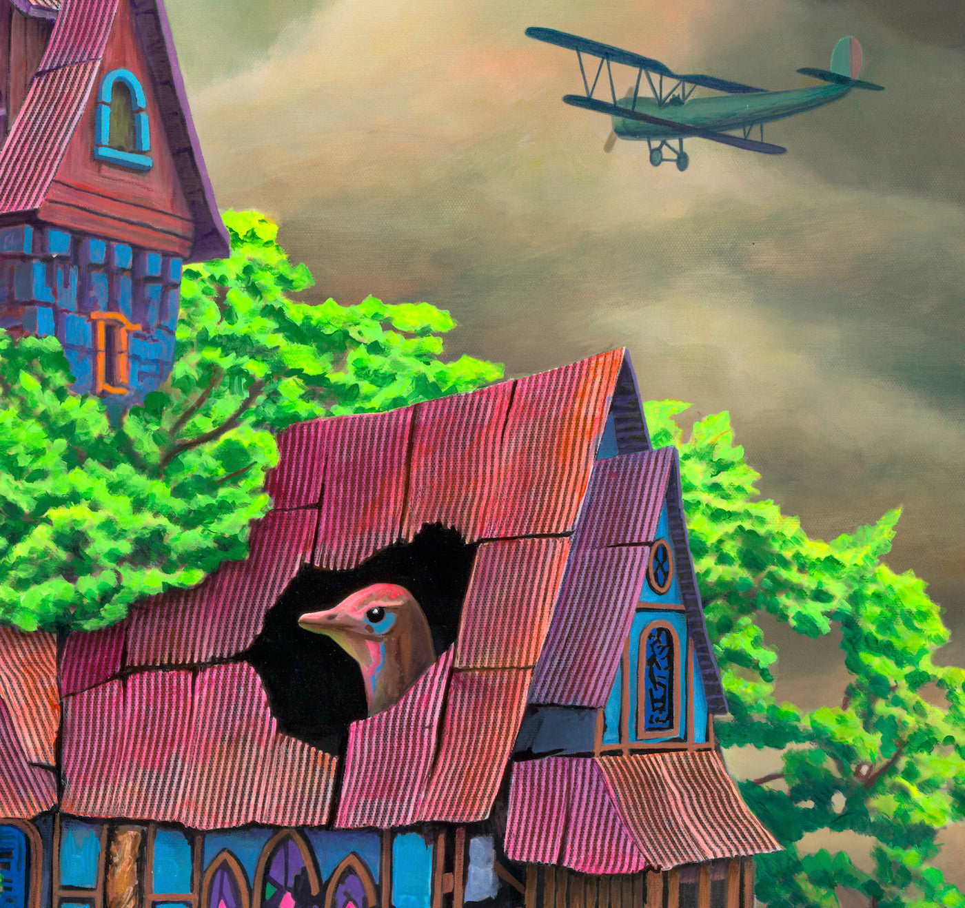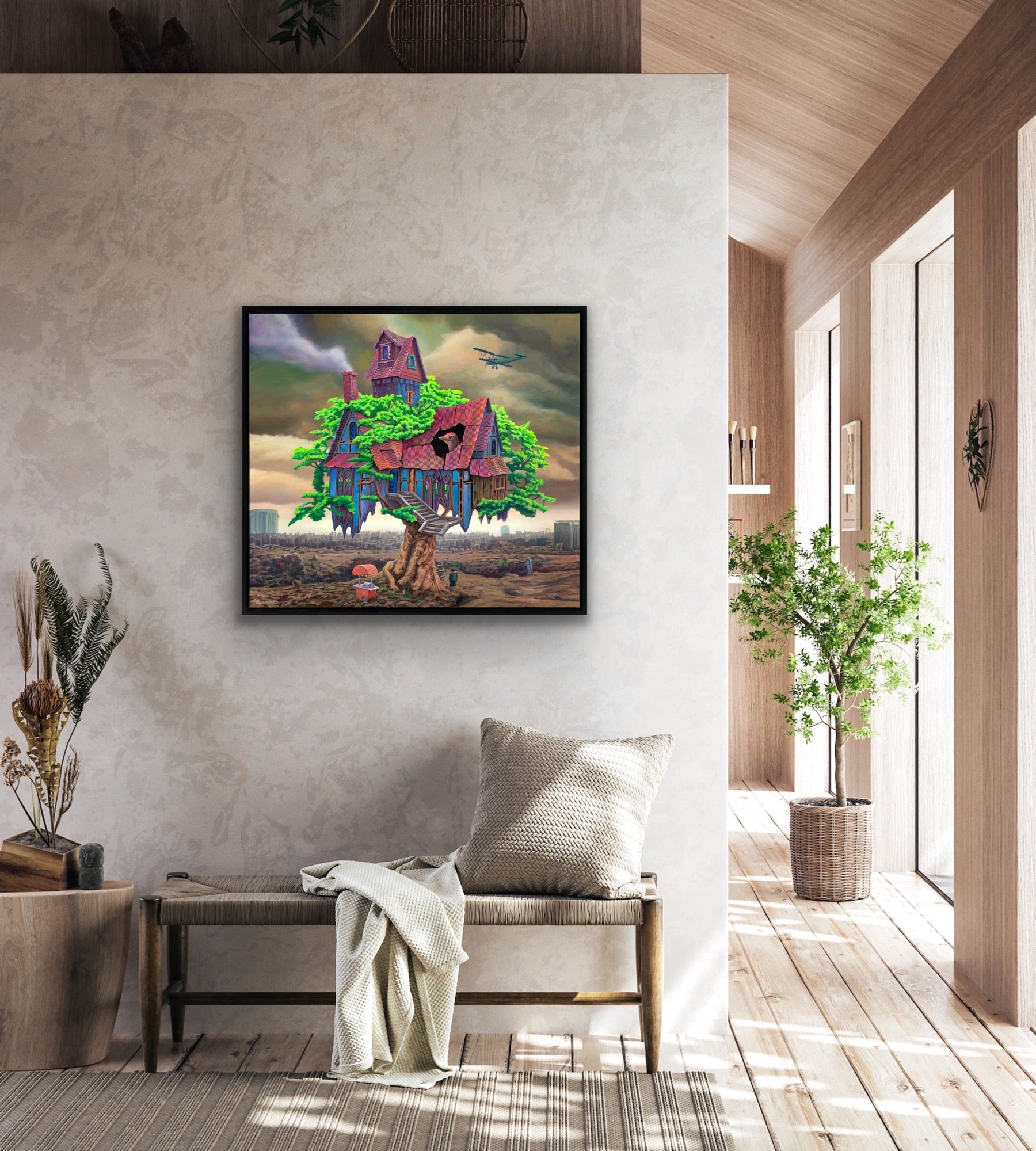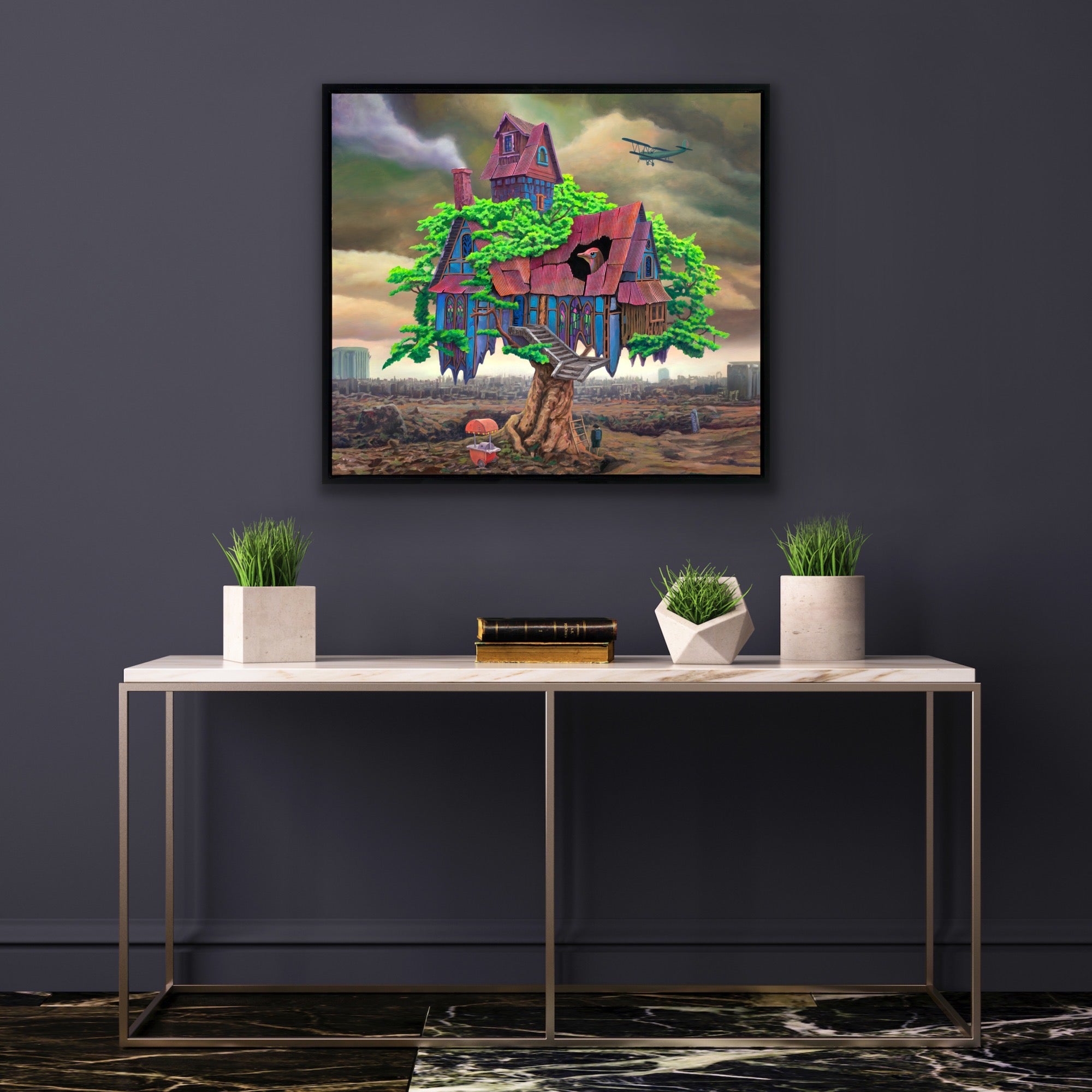 Surrealist treehouse painting by Lobsang Durney, showcasing vibrant colors and post-apocalyptic landscape.