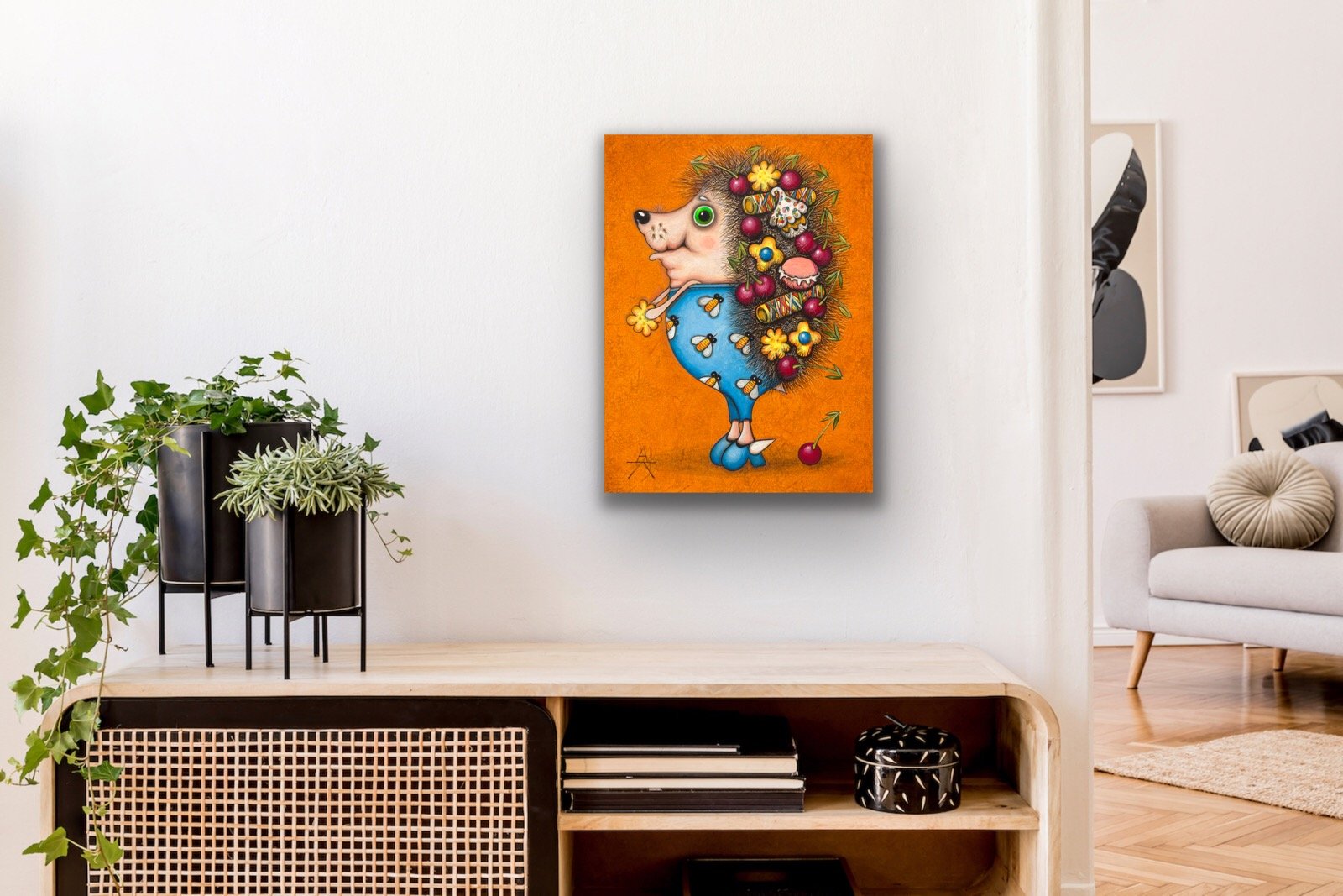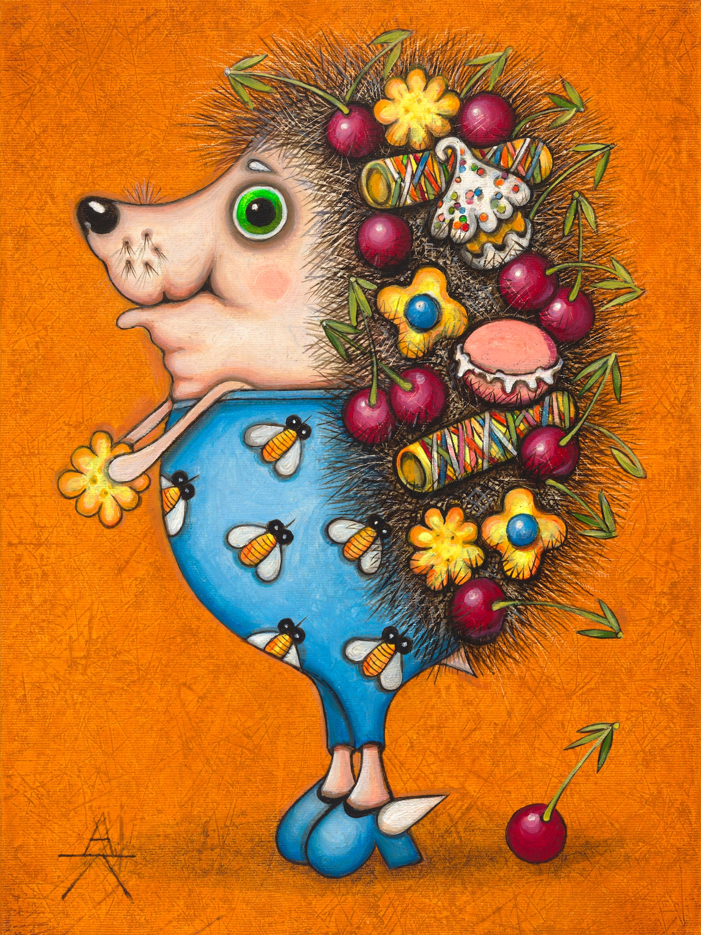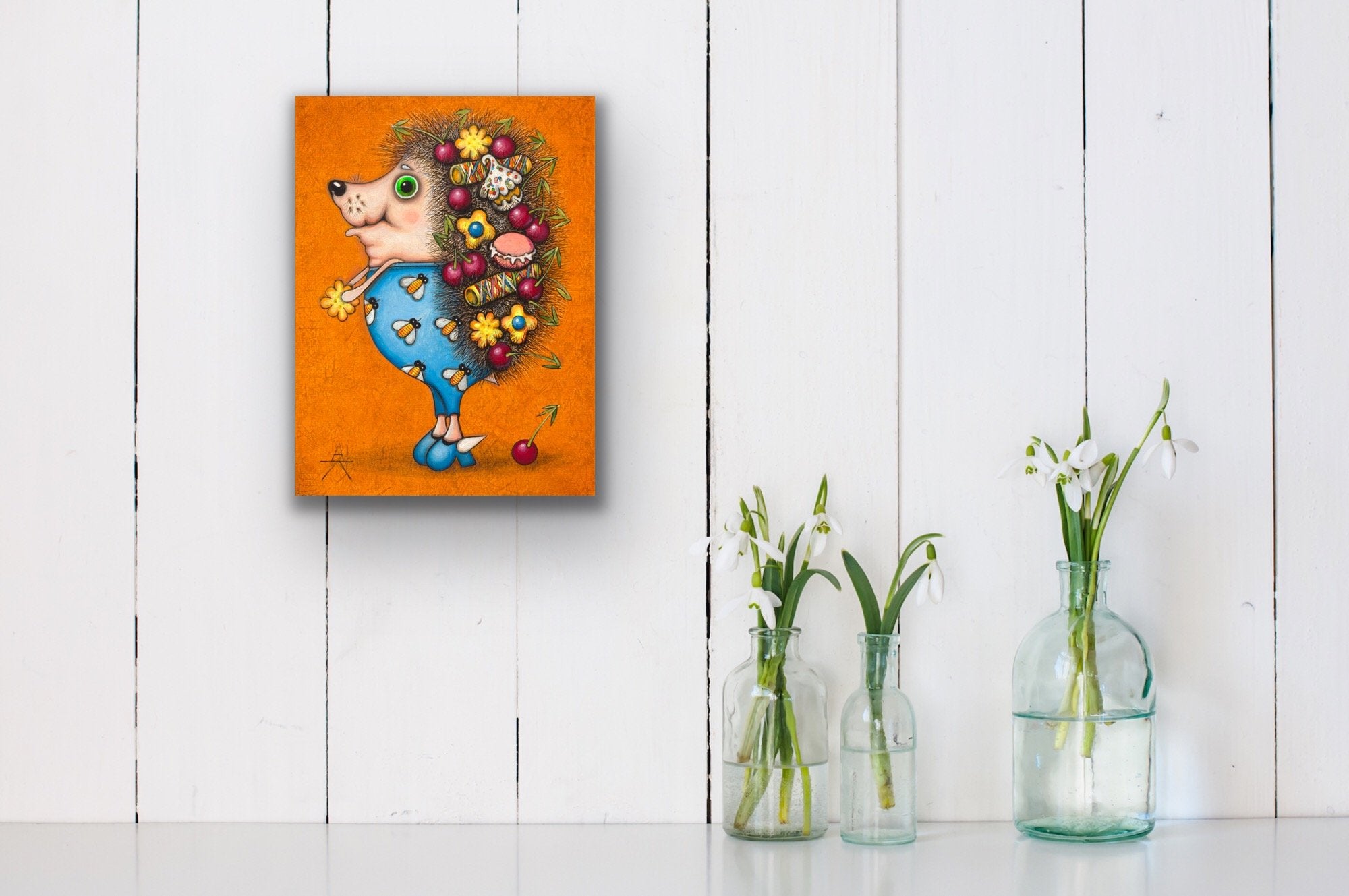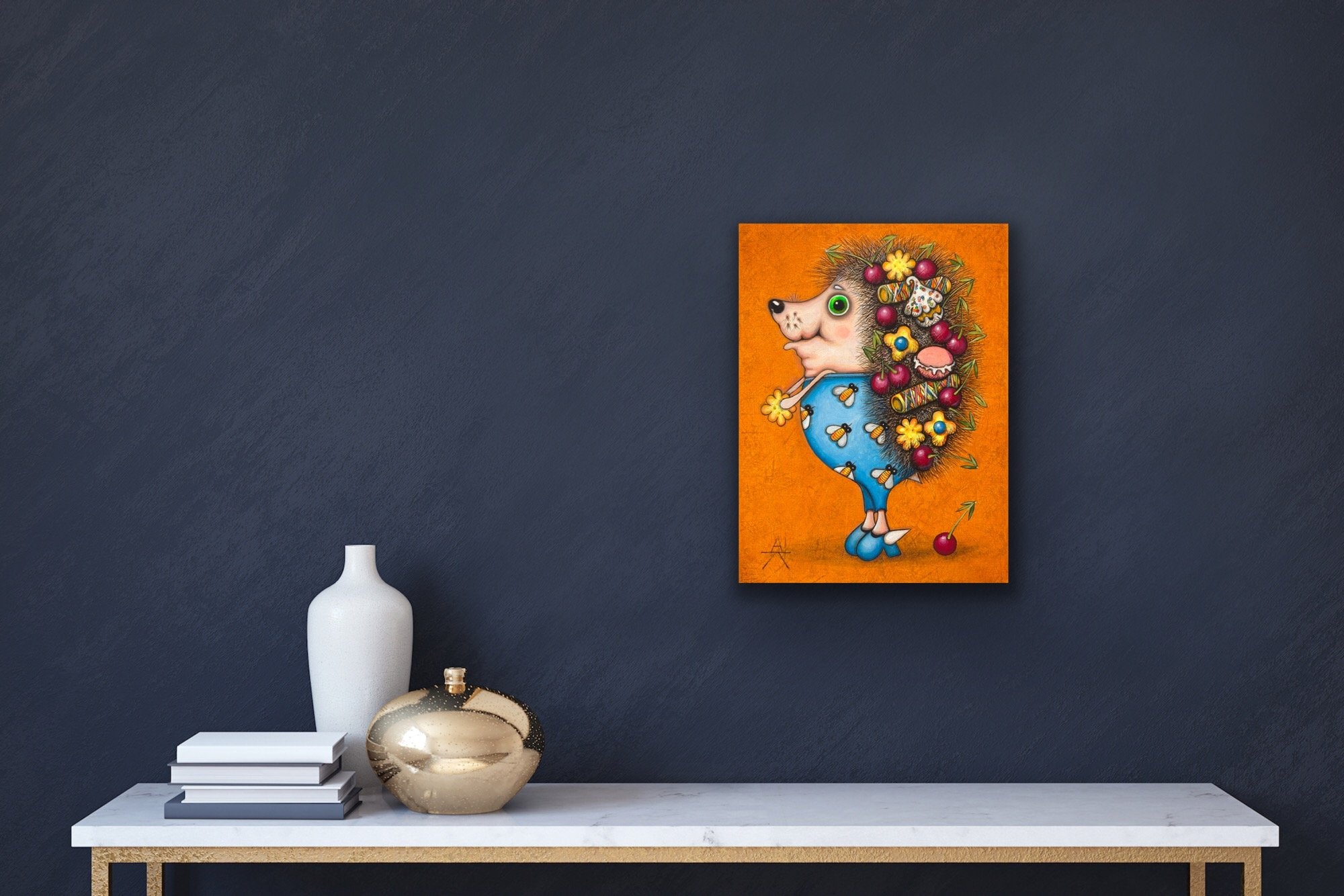 Children room art for sale by Ukrainian artist. Colorful and cute hedgehog with all sorts of sweets on his back