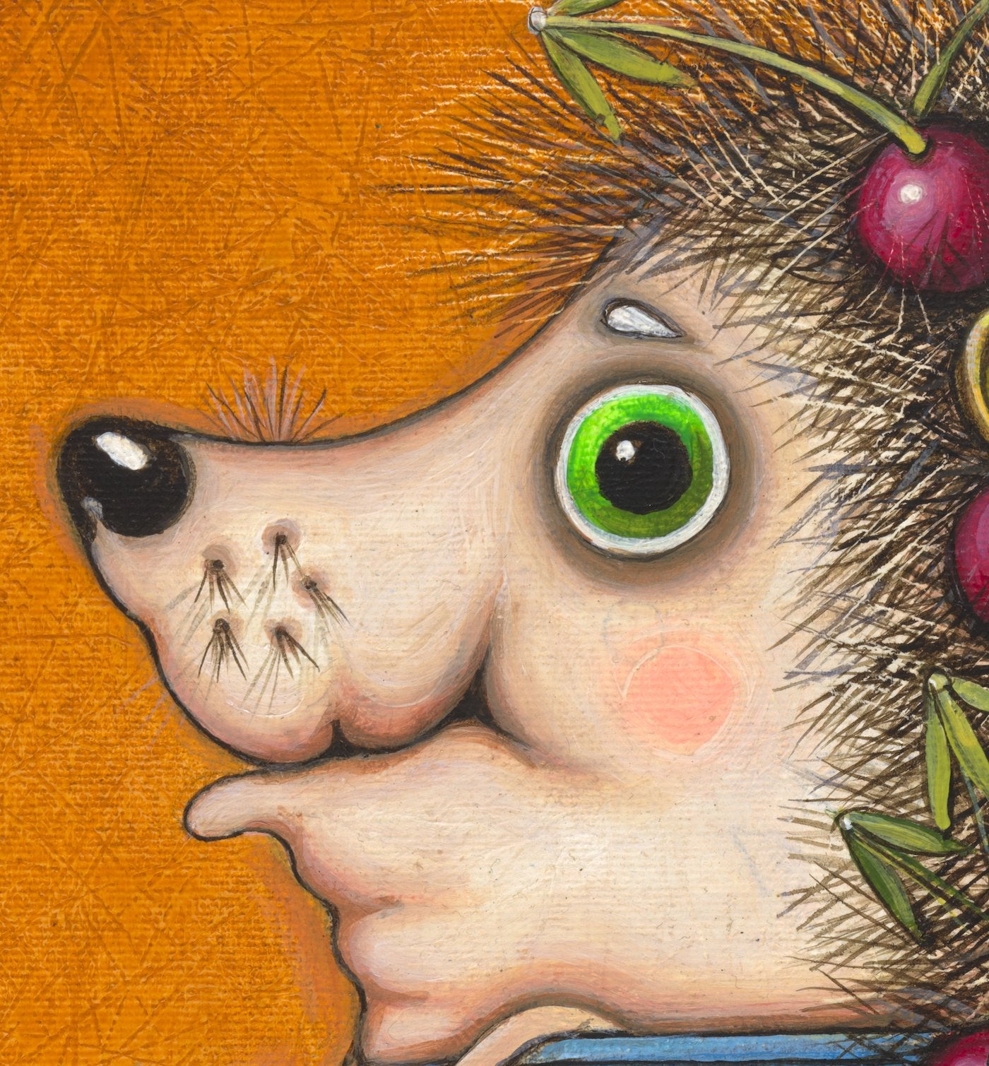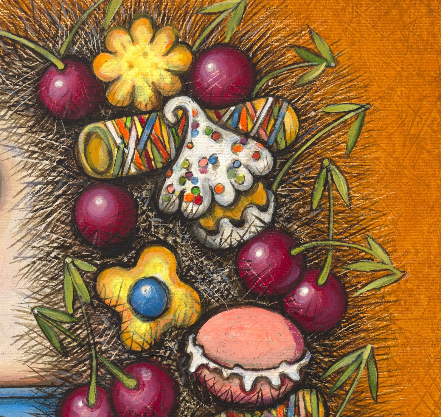Colorful hedgehog illustration by Ukrainian artist Alyona Krutogolova, adorned with sweets and flowers on a vibrant orange background.