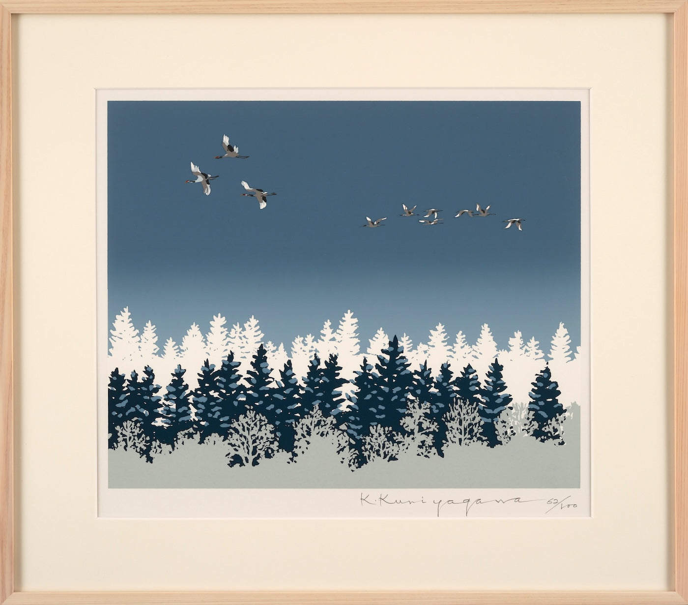 The World of the Red-crowned Crane (Akan) handmade silkscreen print by Kenichi Kuriyagawa, features Japanese landscape artwork.