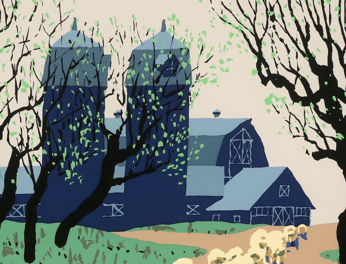 Young leaves revive, a vibrant Japanese landscape artwork depicting a barn and trees in spring.