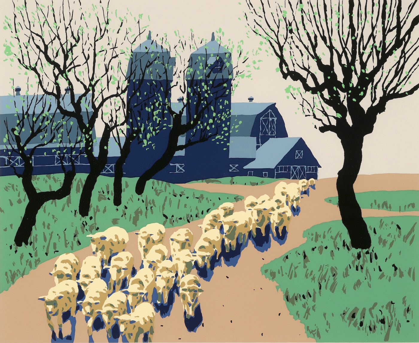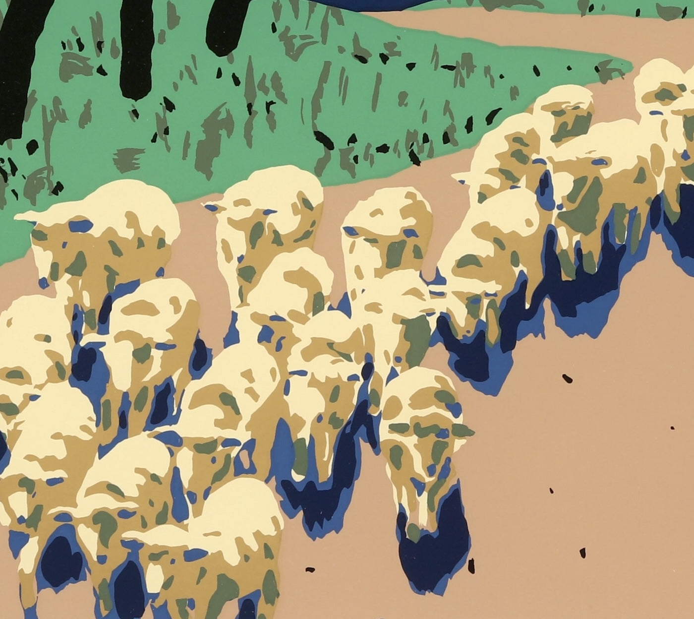 Young leaves revive silkscreen print showing a stylized herd of sheep in a vibrant Japanese landscape.