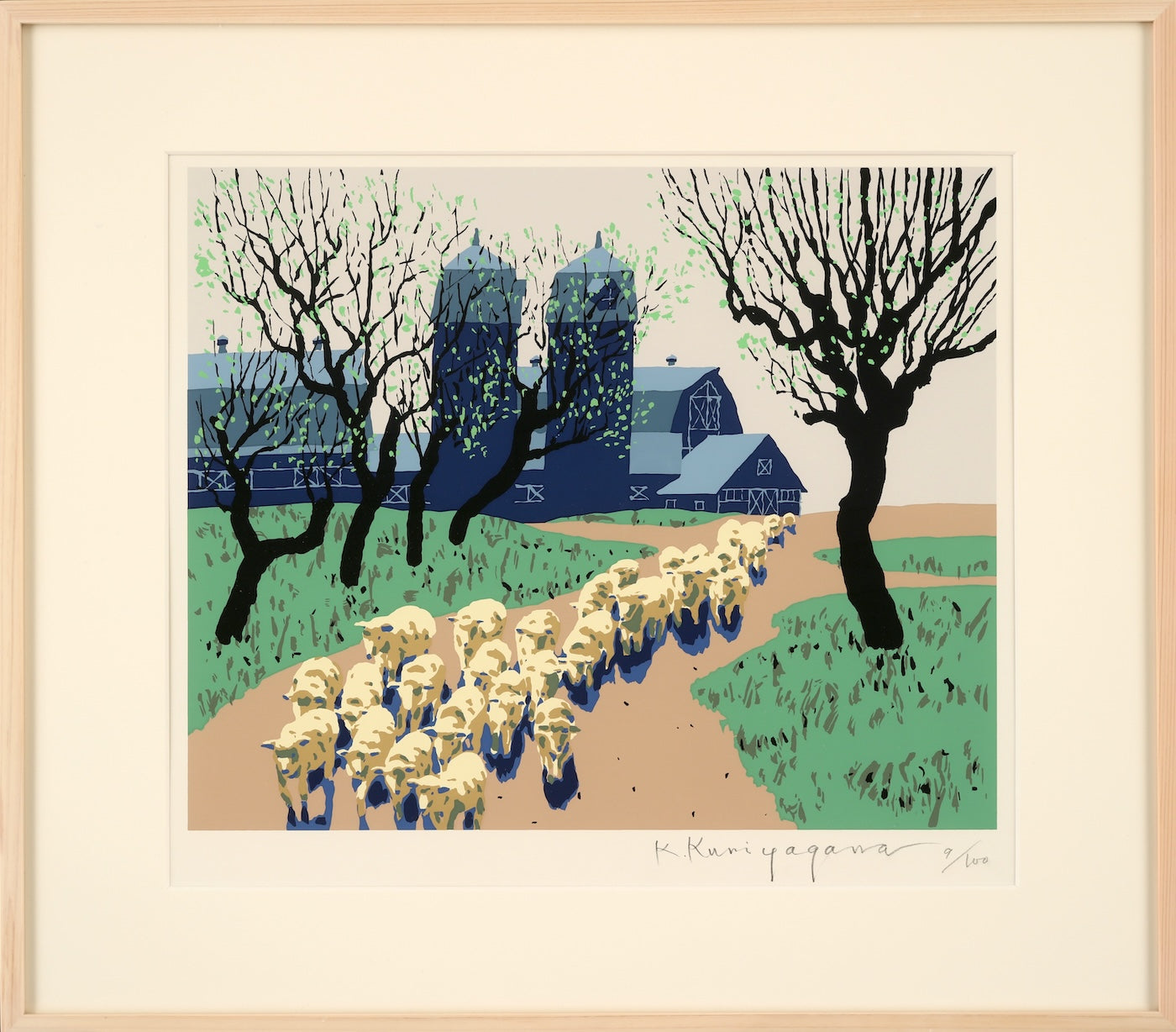 Kenichi Kuriyagawa's 'Young leaves revive', a Japanese landscape artwork depicting sheep in a vibrant countryside scene.