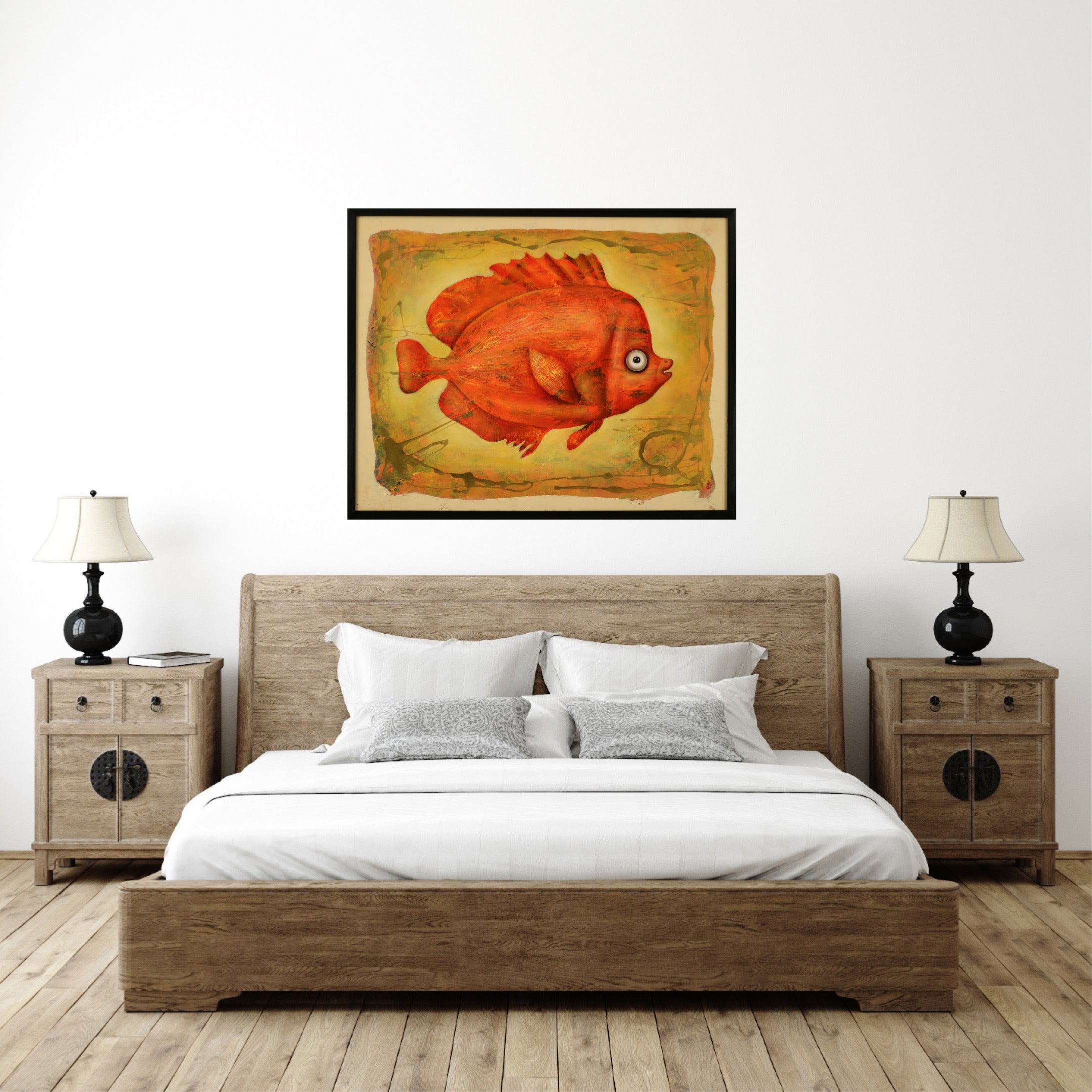 Wish Fish artwork in a modern bedroom, featuring vibrant red fish on canvas, framed in natural wood.