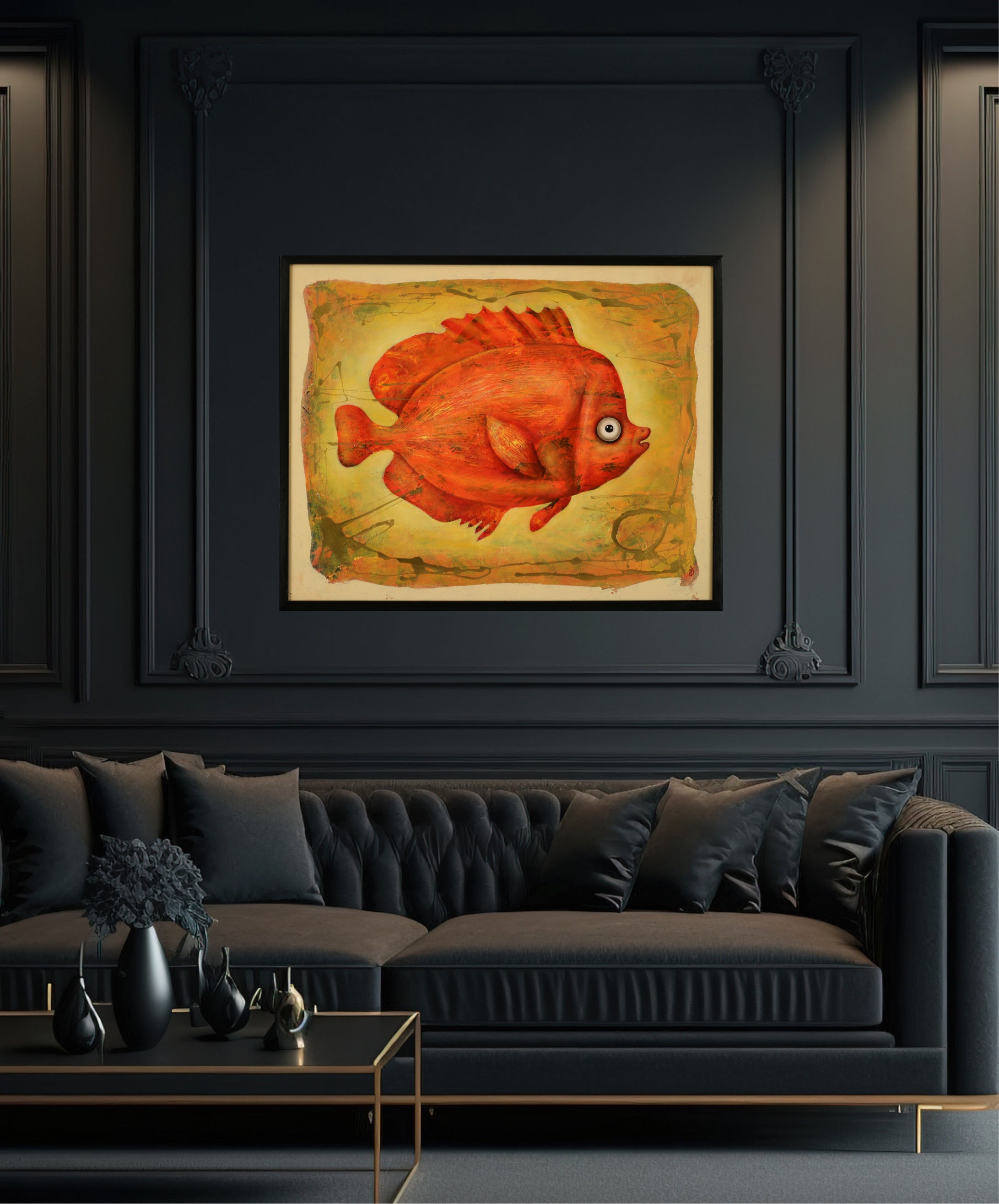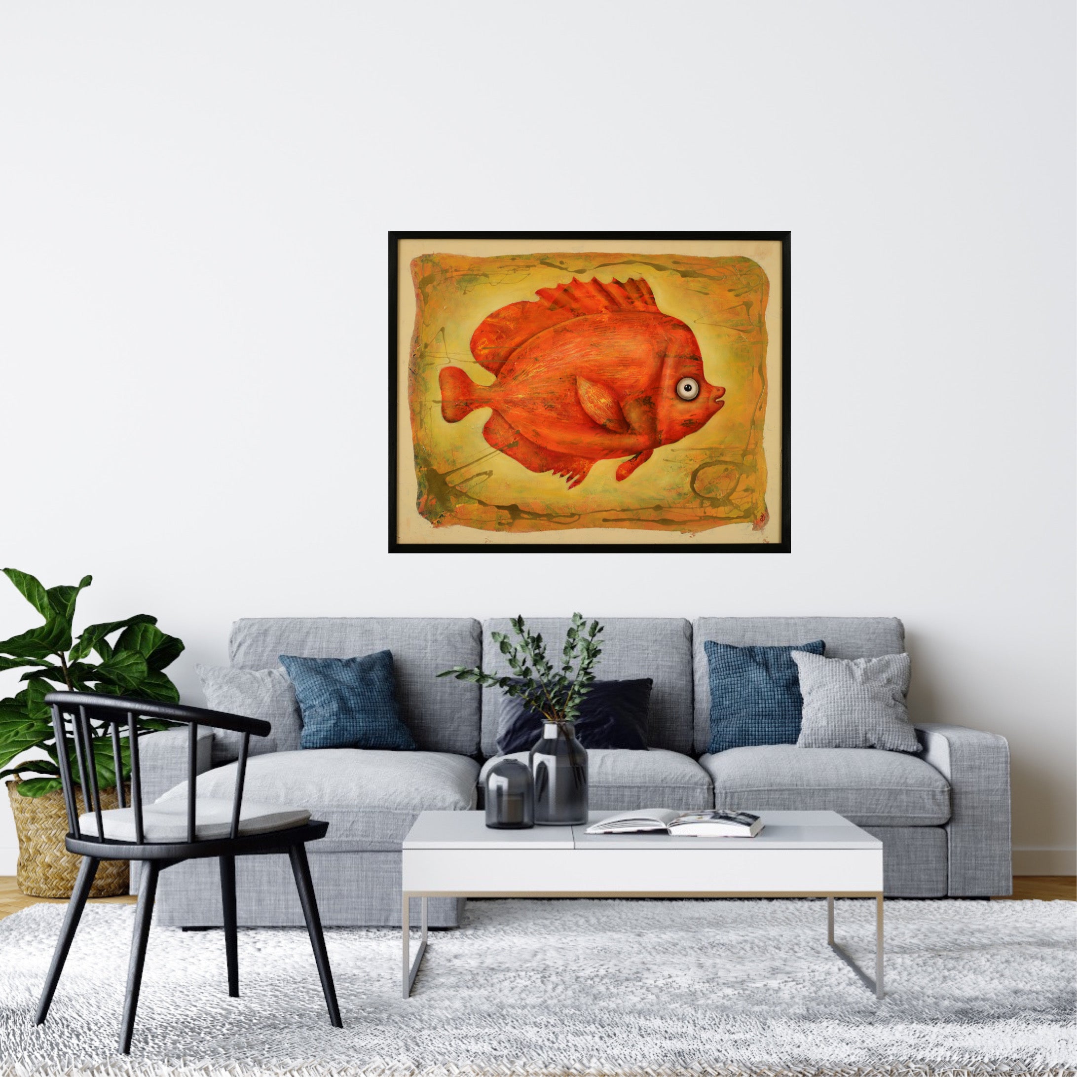 Vibrant orange fish artwork on canvas, framed in modern wood, representing creativity and exploration.