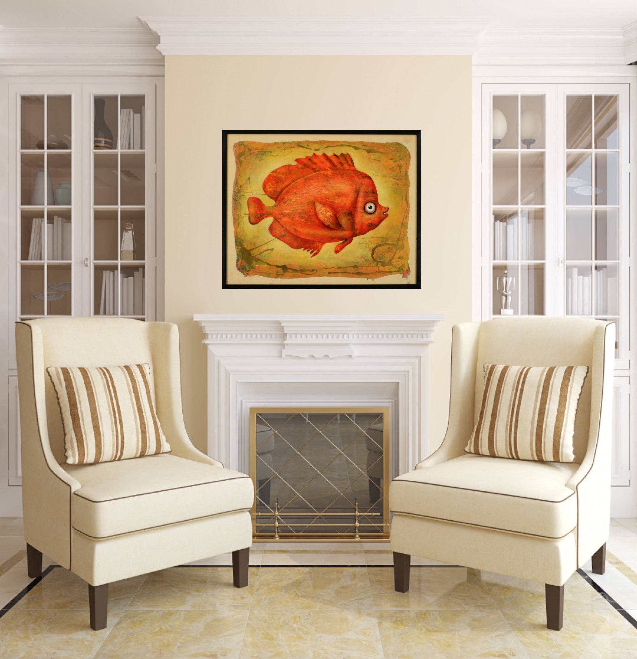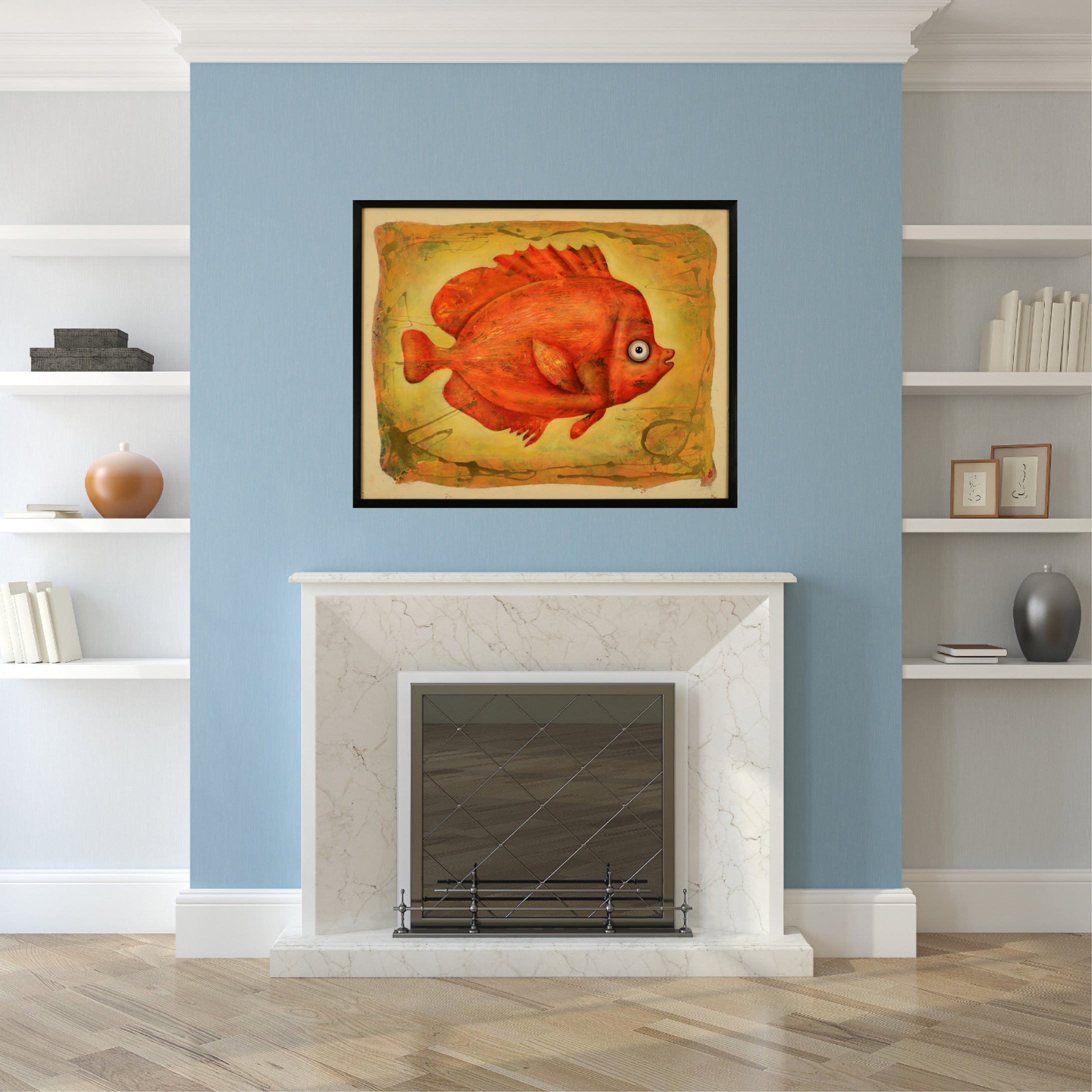 Artistic depiction of a vibrant red fish painting in a modern living room setting with a fireplace.