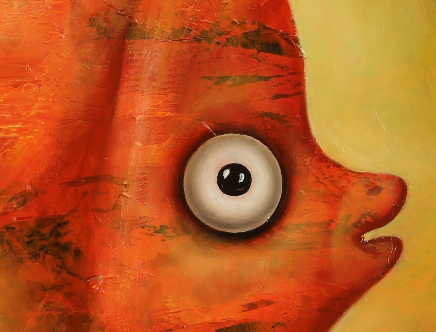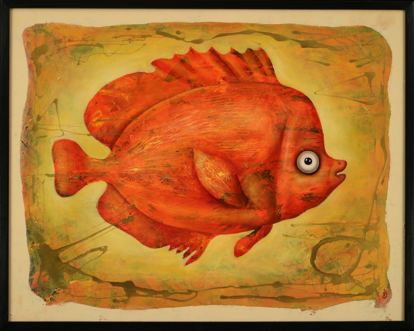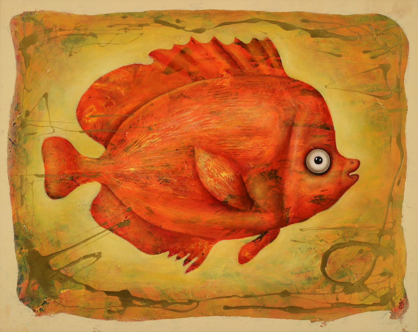Close-up of a whimsical orange fish painting with a large expressive eye on a textured background.