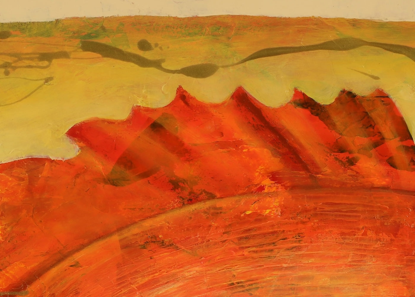 Abstract artwork featuring vibrant orange and green hues, inspired by exploration and creativity.