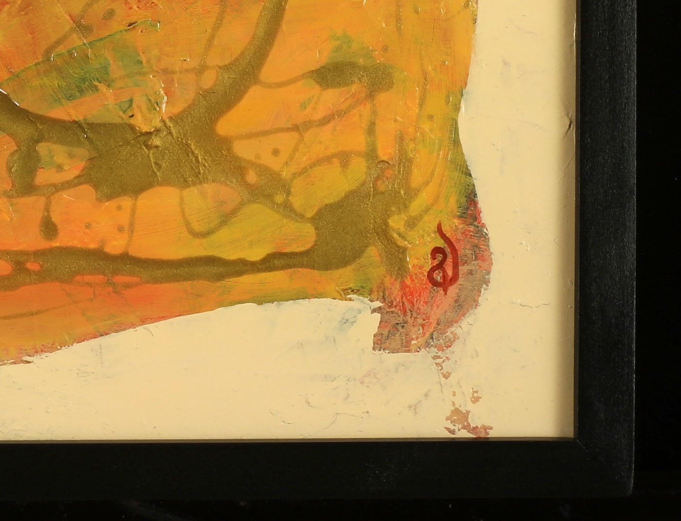 Abstract artwork titled 'Wish Fish' featuring vibrant yellows and greens, framed in natural wood from Tbilisi, Georgia.