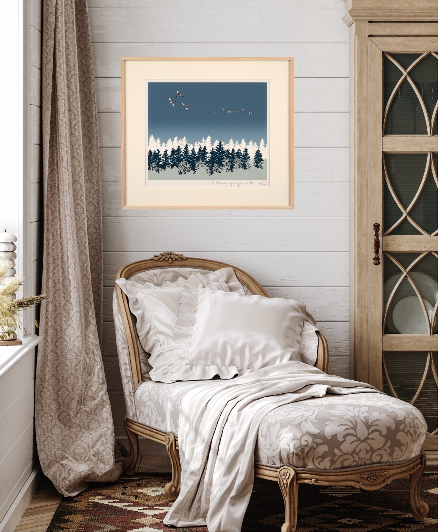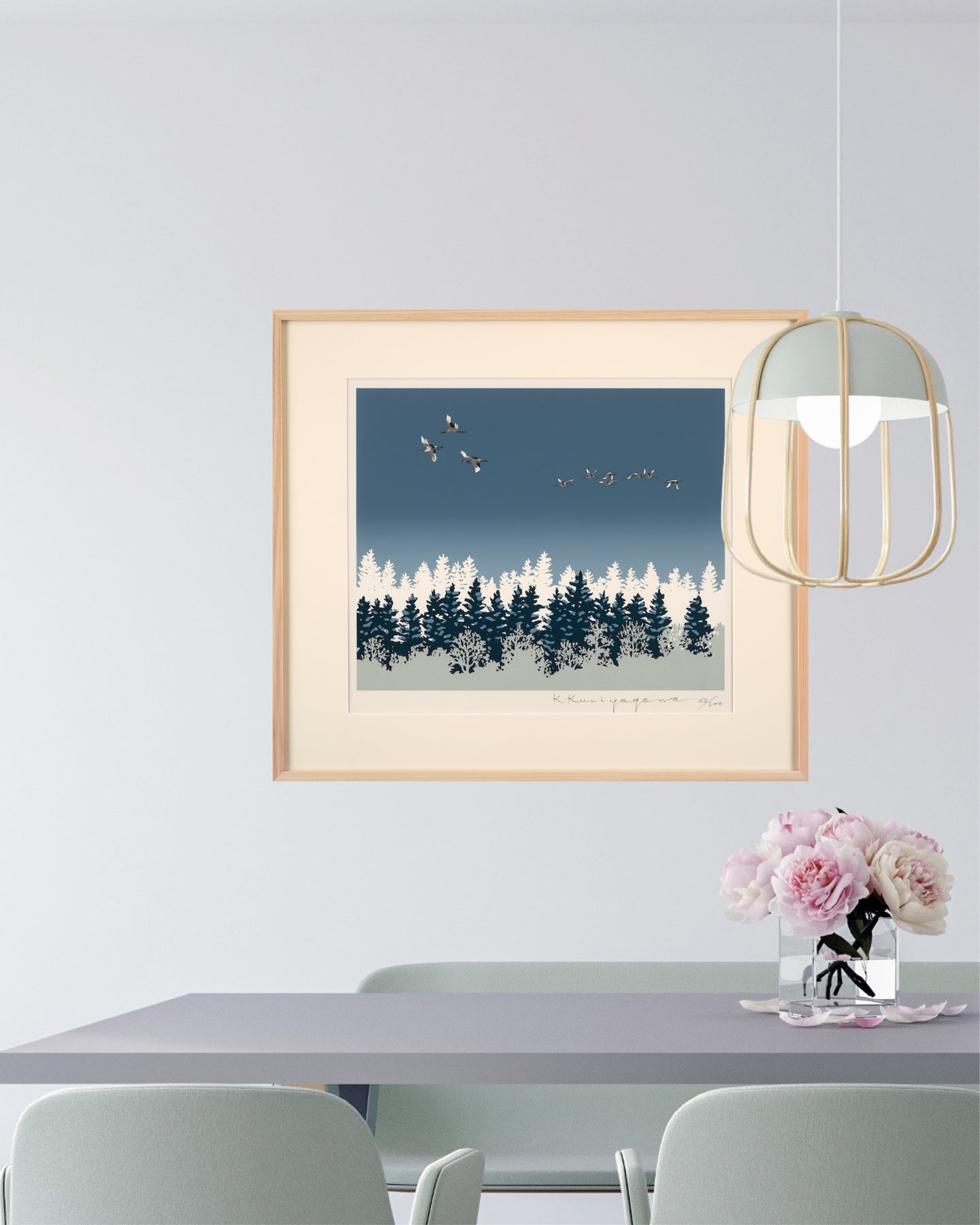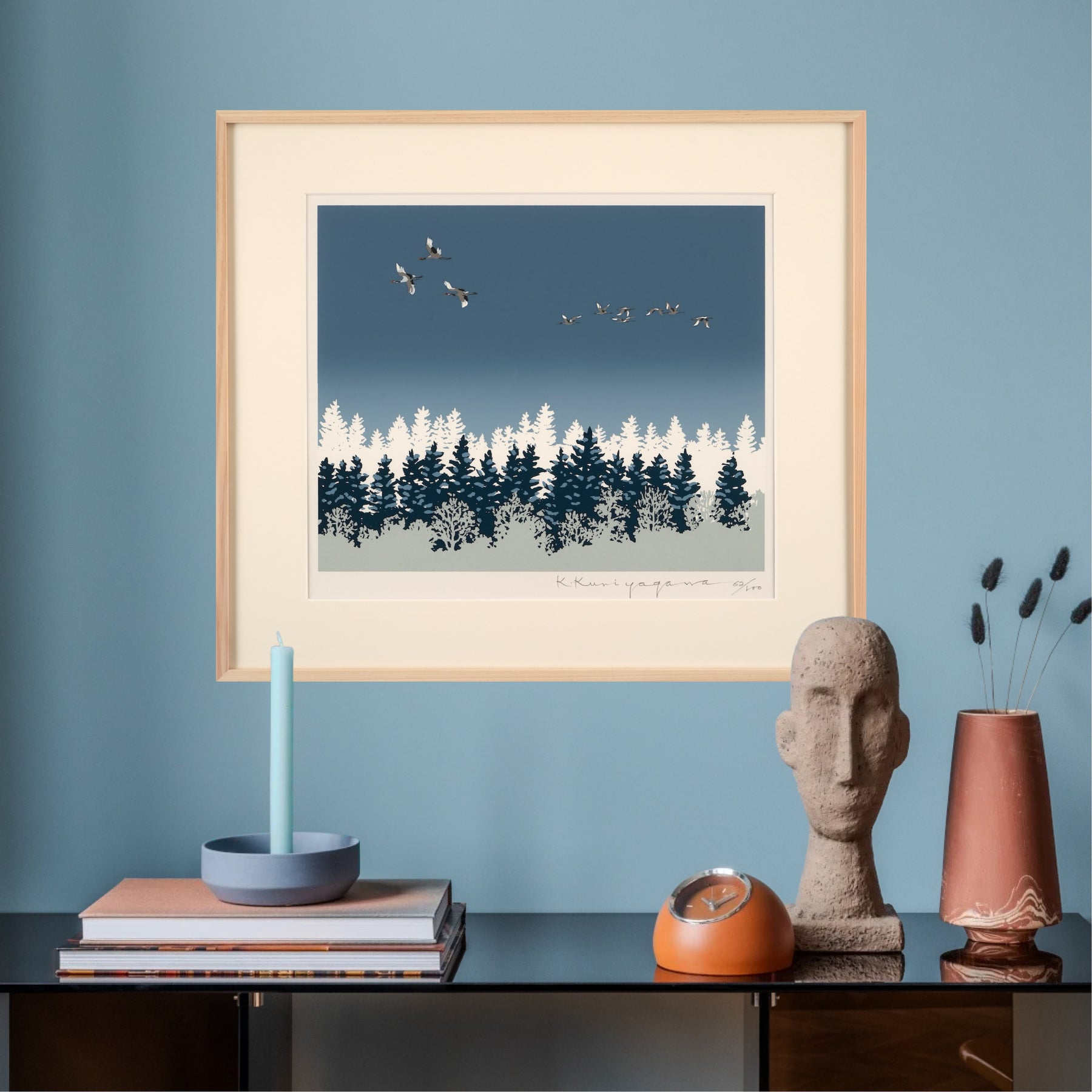 The World of the Red-crowned Crane (Akan) handmade silkscreen print by Kenichi Kuriyagawa, features Japanese landscape artwork.