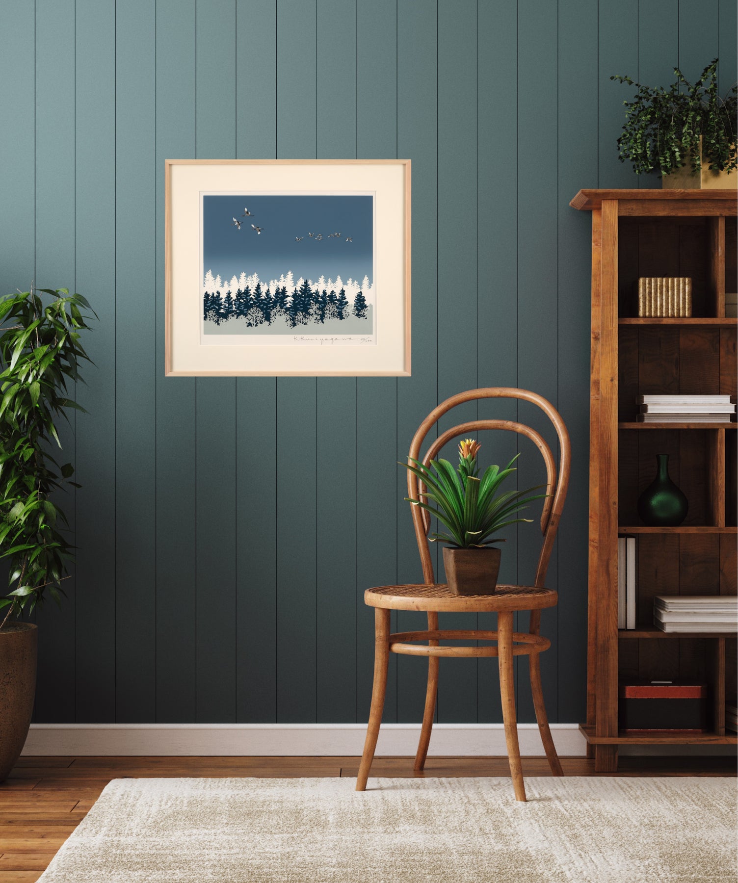 The World of the Red-crowned Crane (Akan) silkscreen print featuring cranes in flight against a blue sky.