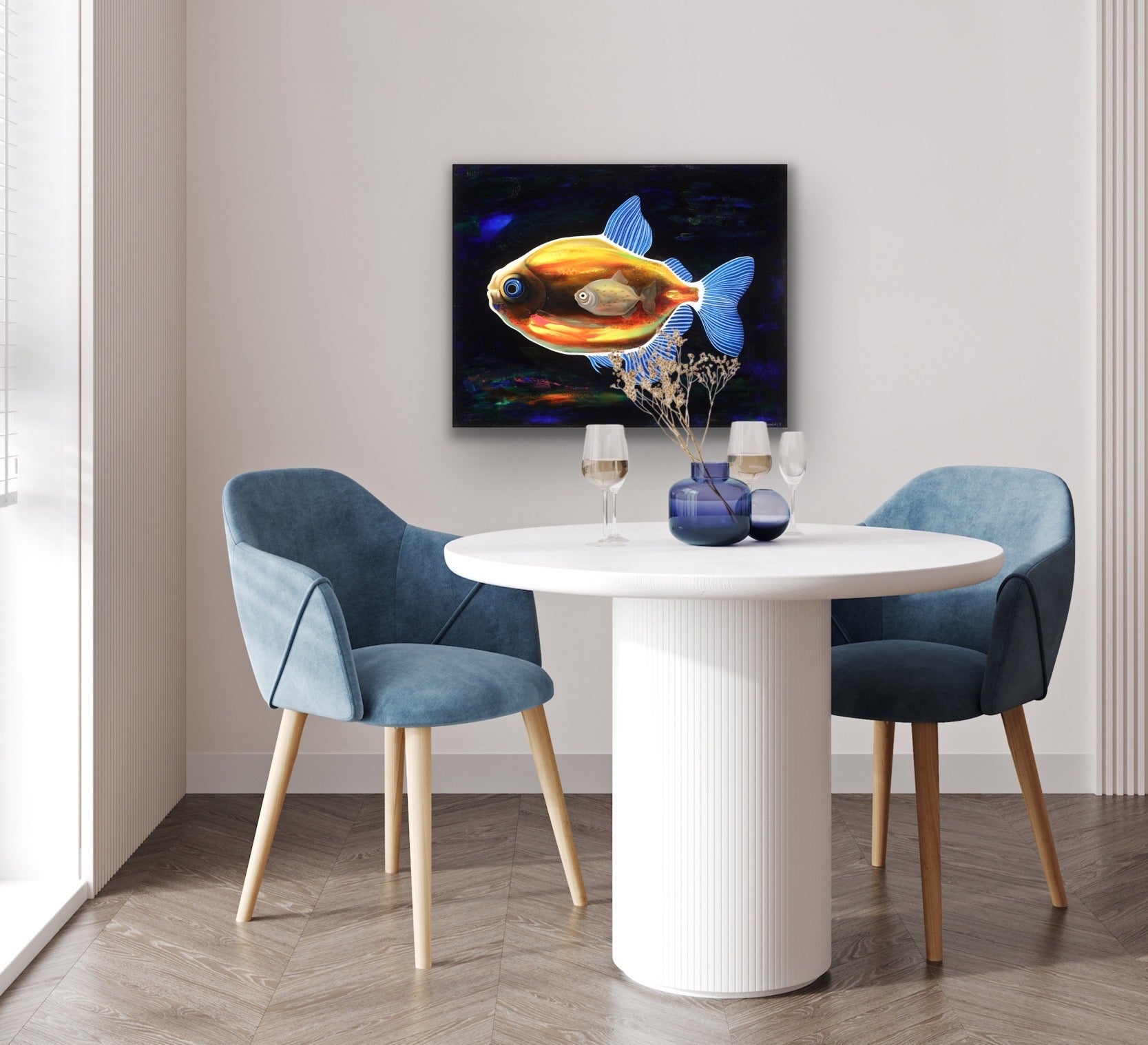 Colorful goldfish art print displayed in a modern workspace with a minimalistic desk and chair.