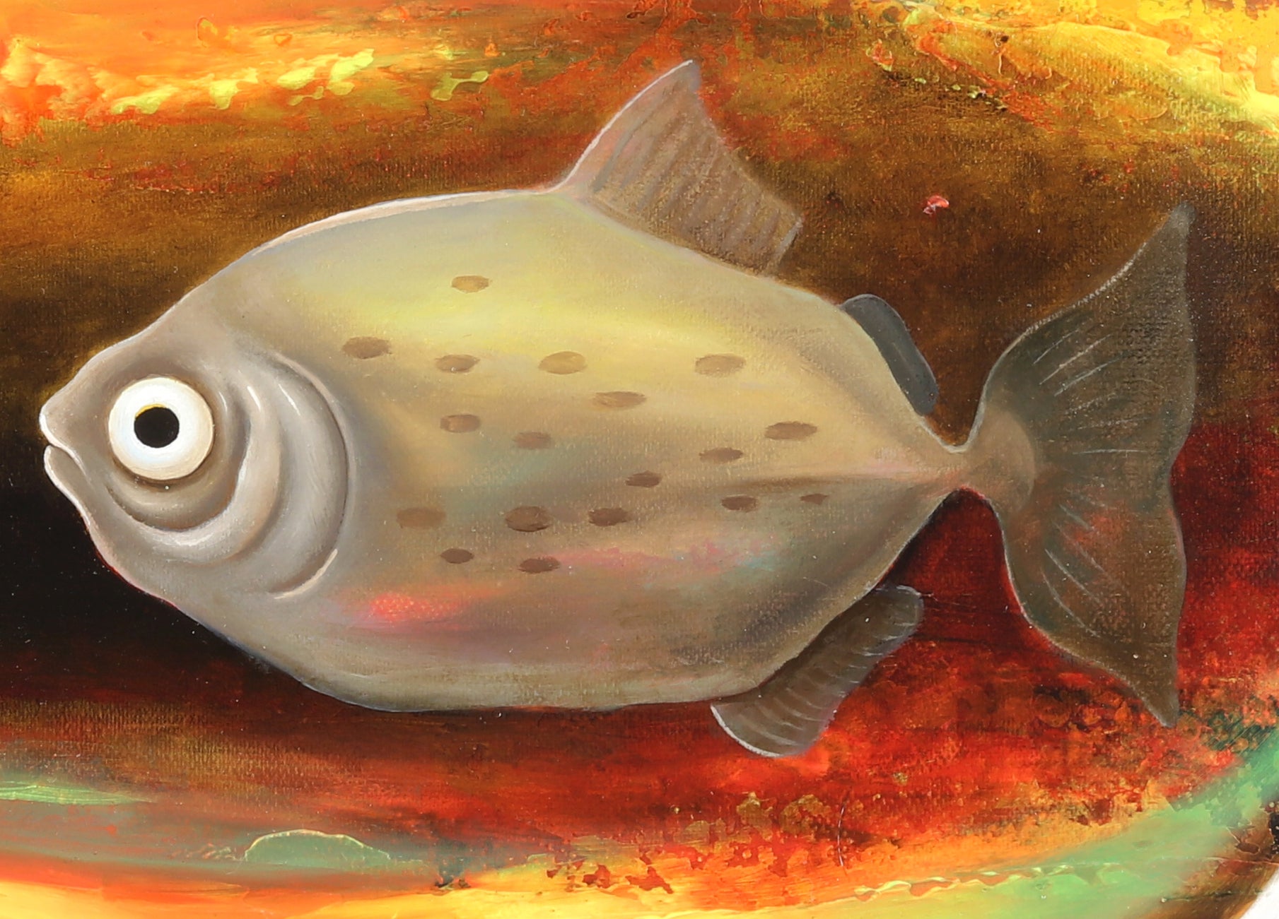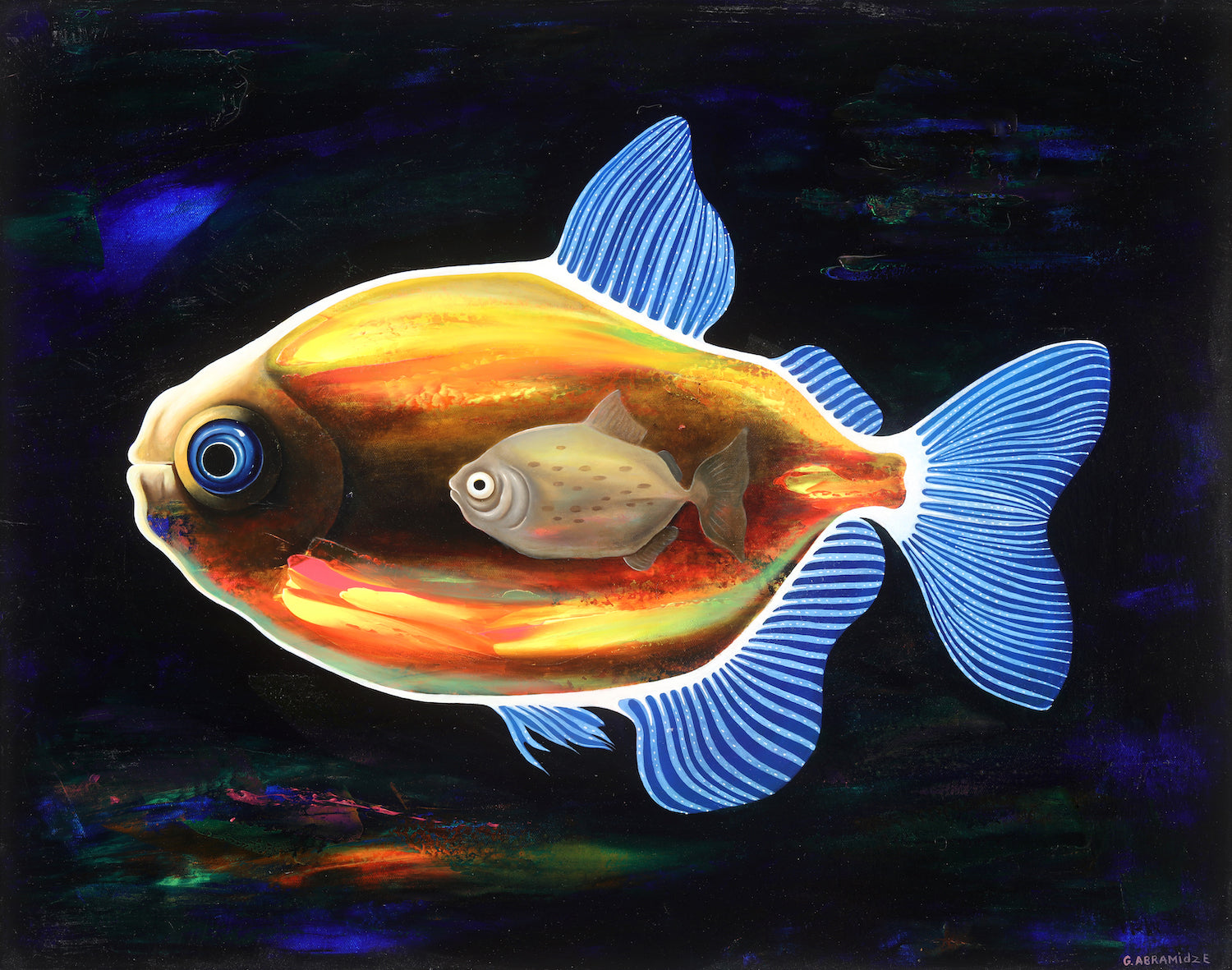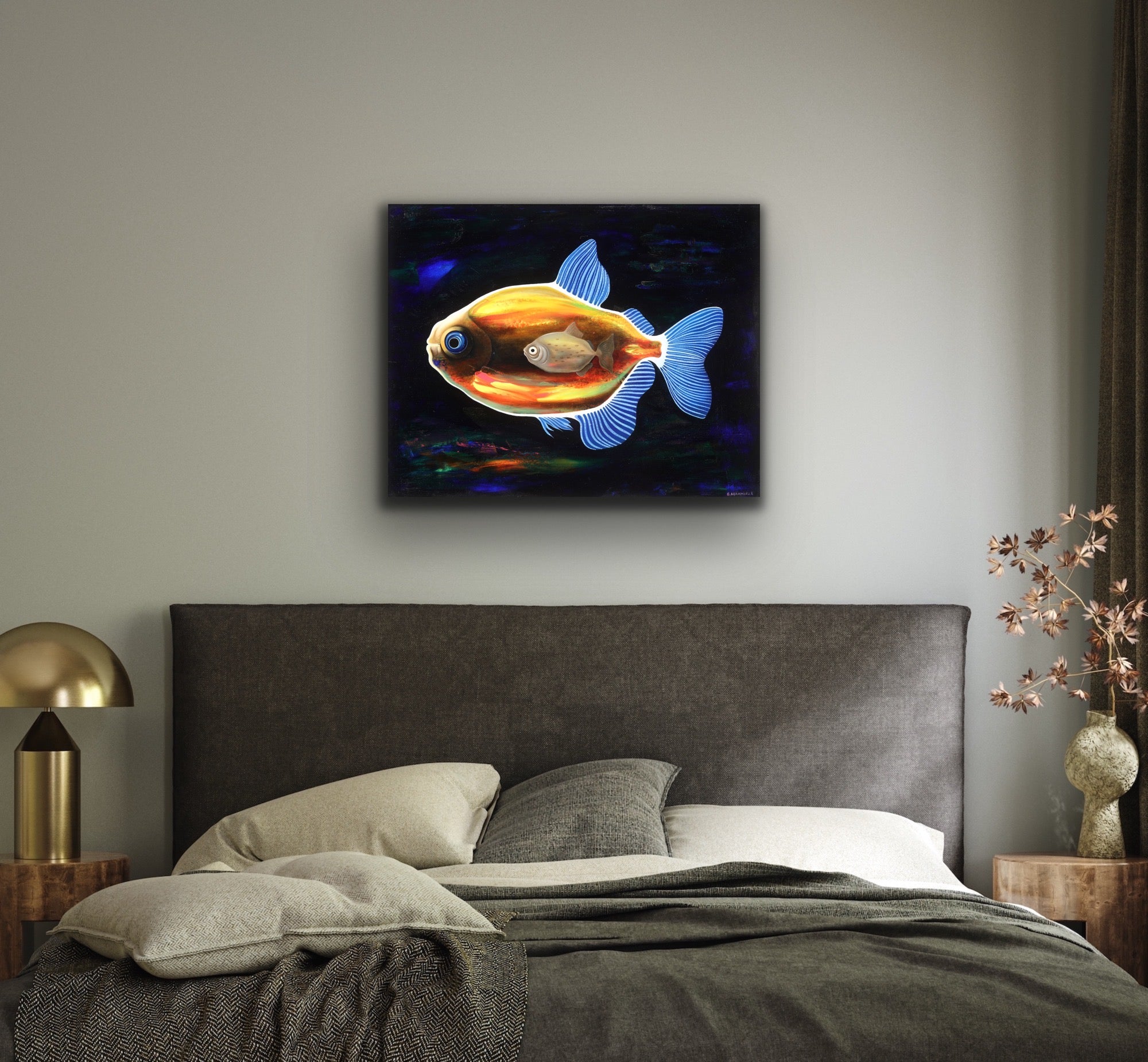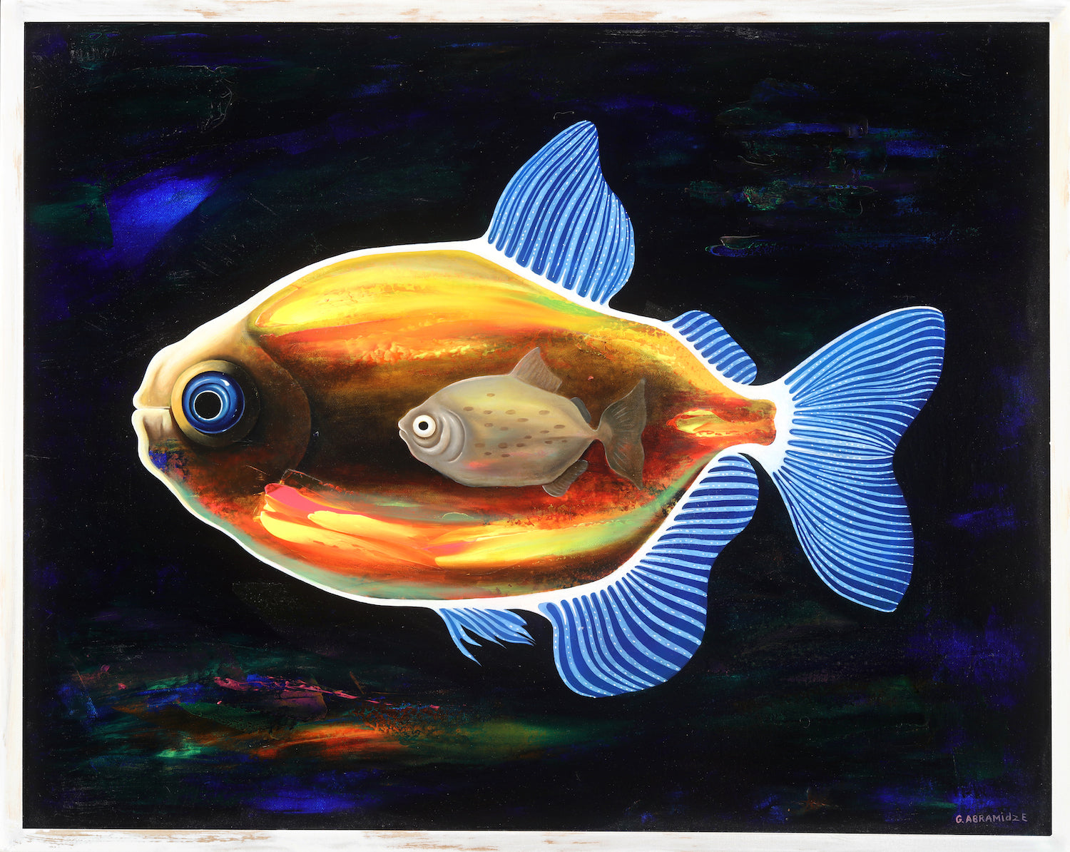 Colorful painting of a vibrant fish with a smaller fish visible inside it, set against a dark background.