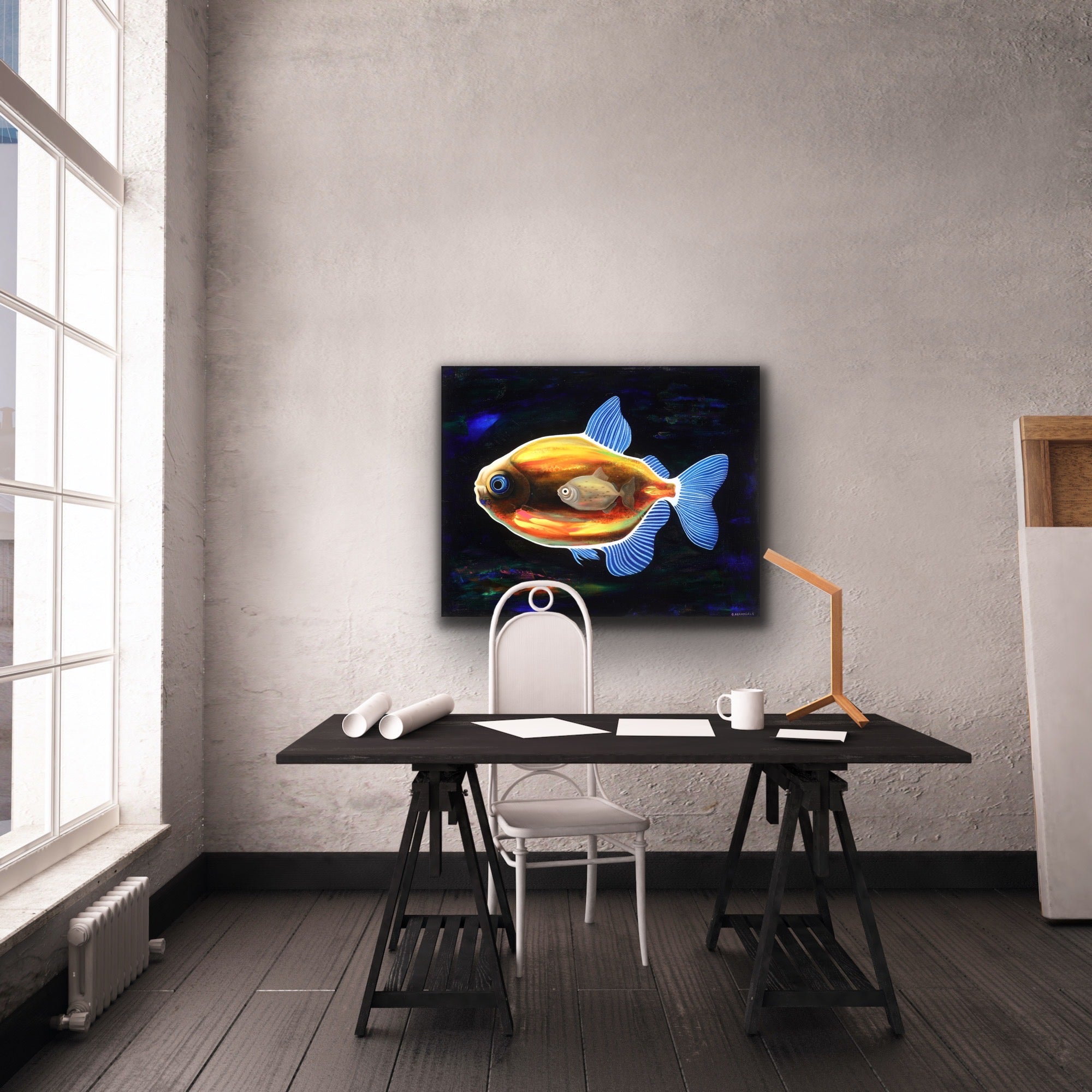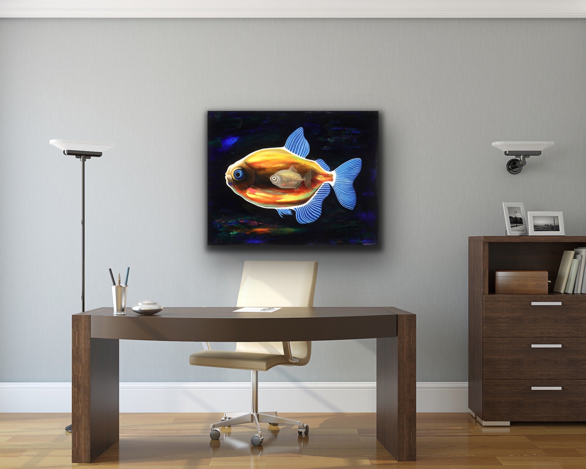 Brightly colored goldfish painting in a modern office setting with wooden desk and contemporary decor.