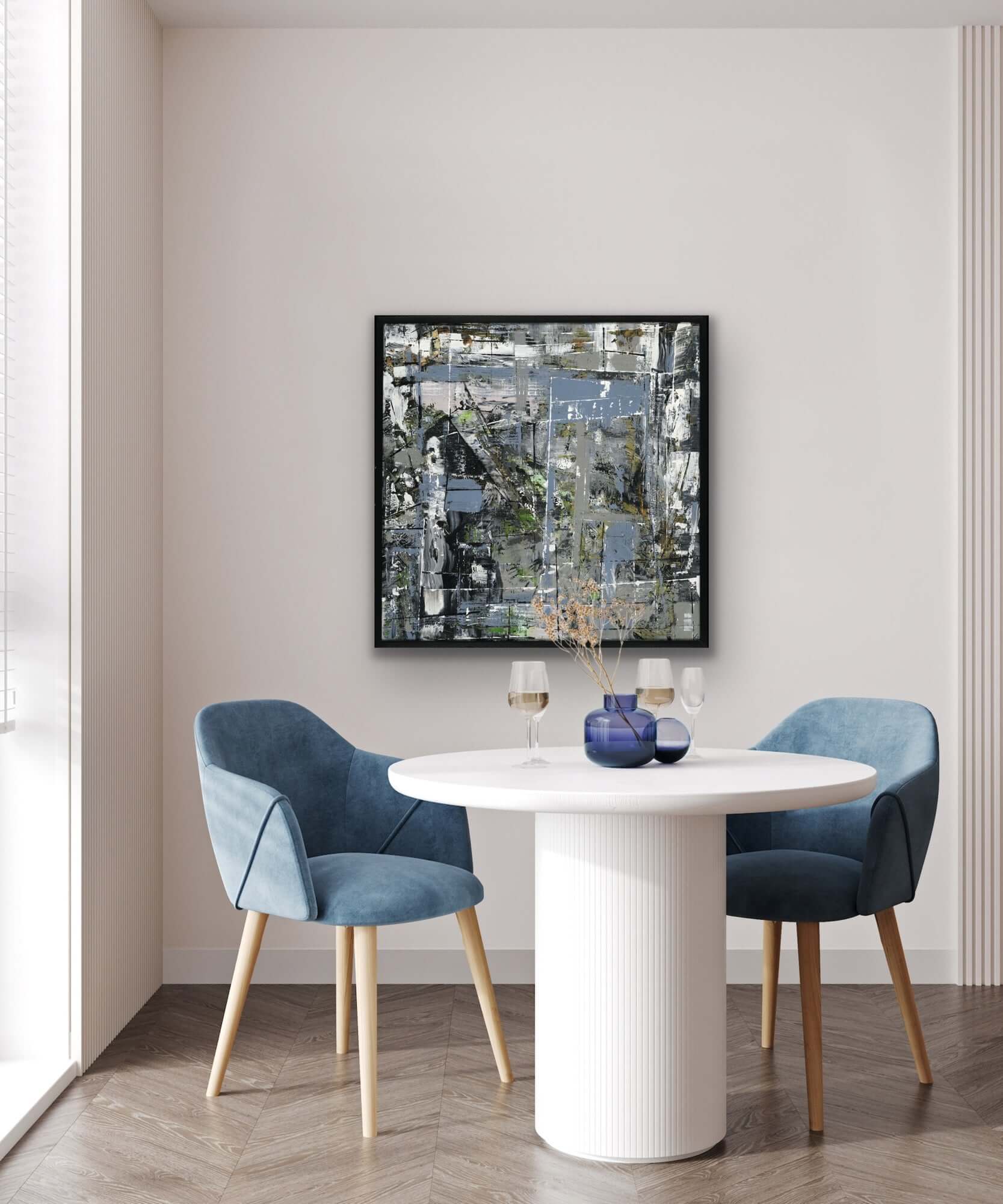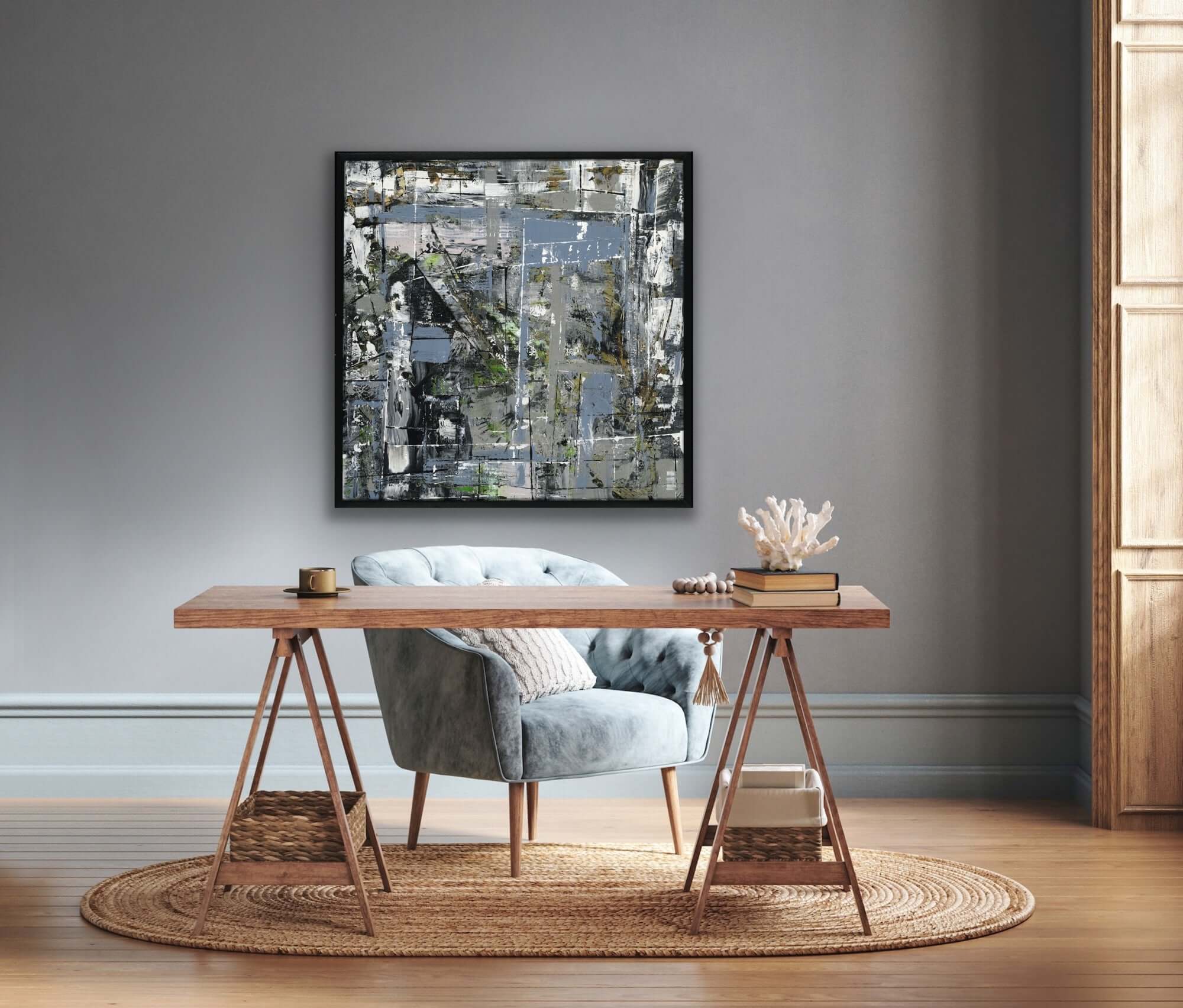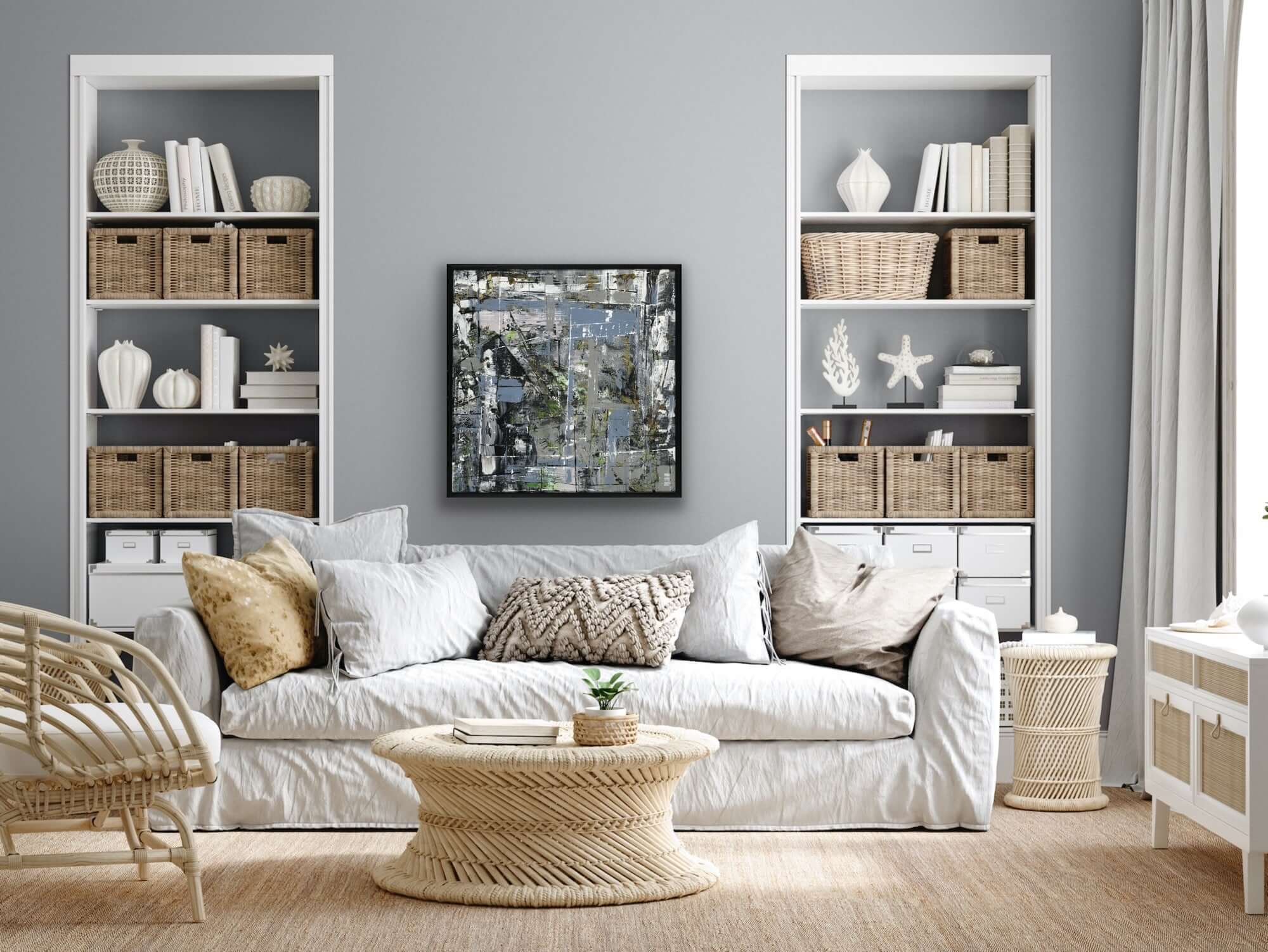 Modern living room featuring a cozy sofa, stylish decor, and abstract art piece on the wall, ideal for home aesthetics.
