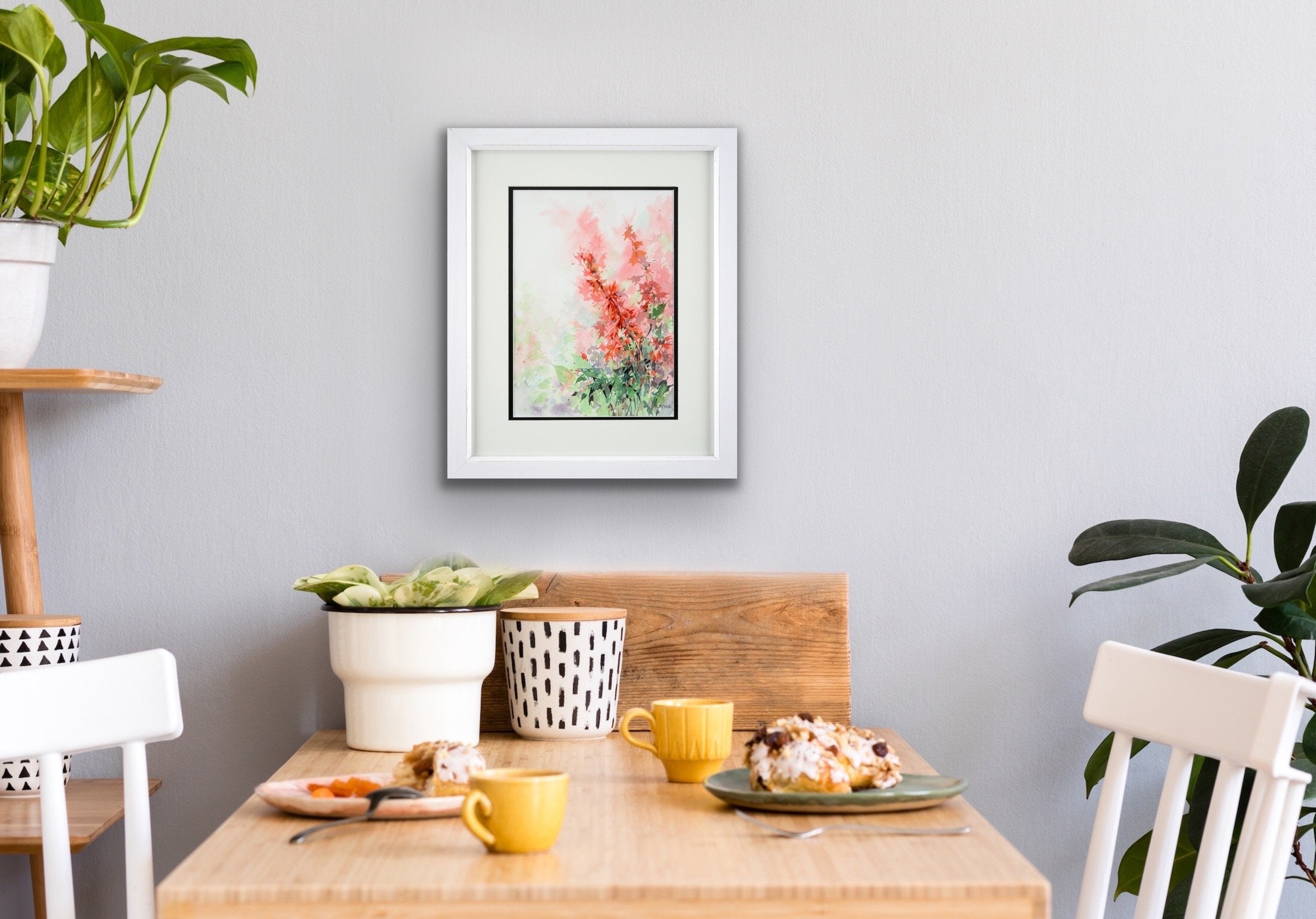 Watercolor garden art for sale by Inna Petrashkevich from Belarus. Salvia September Fire. White wall