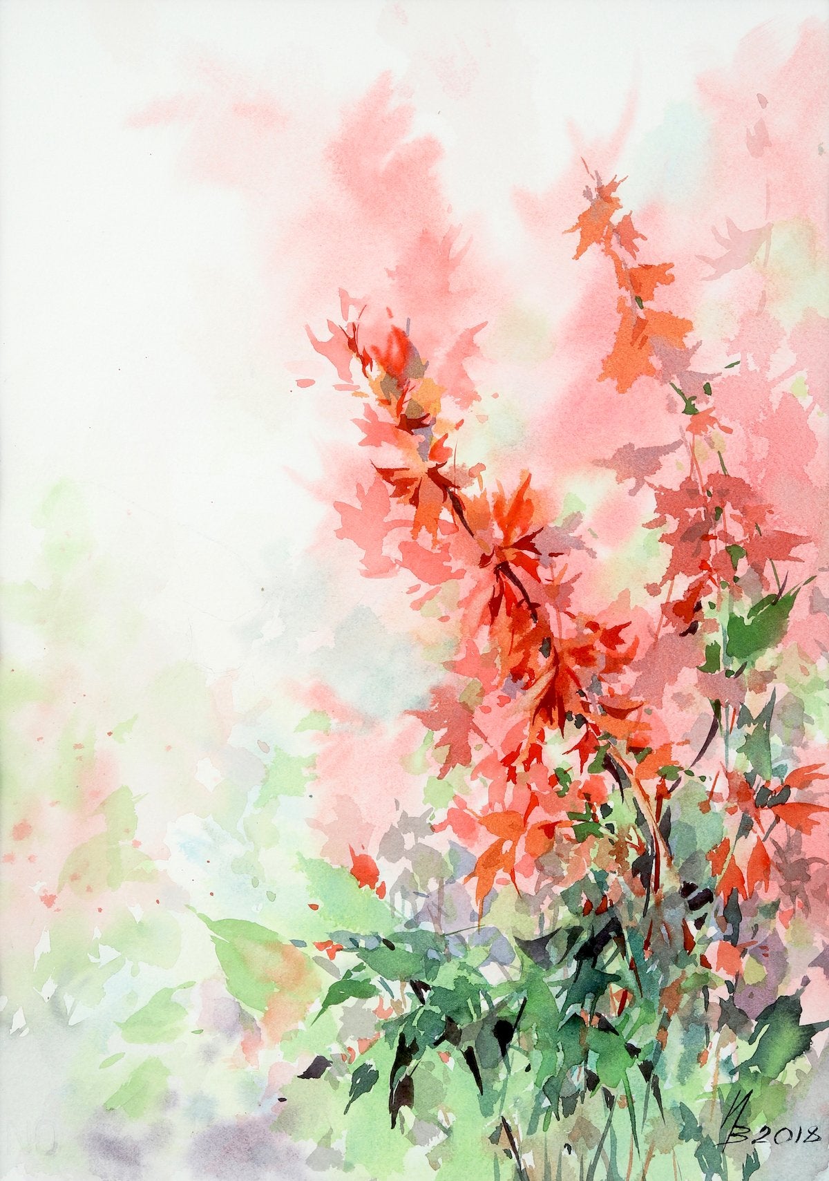 Watercolor garden art for sale by Inna Petrashkevich from Belarus. Salvia September Fire. Closeout