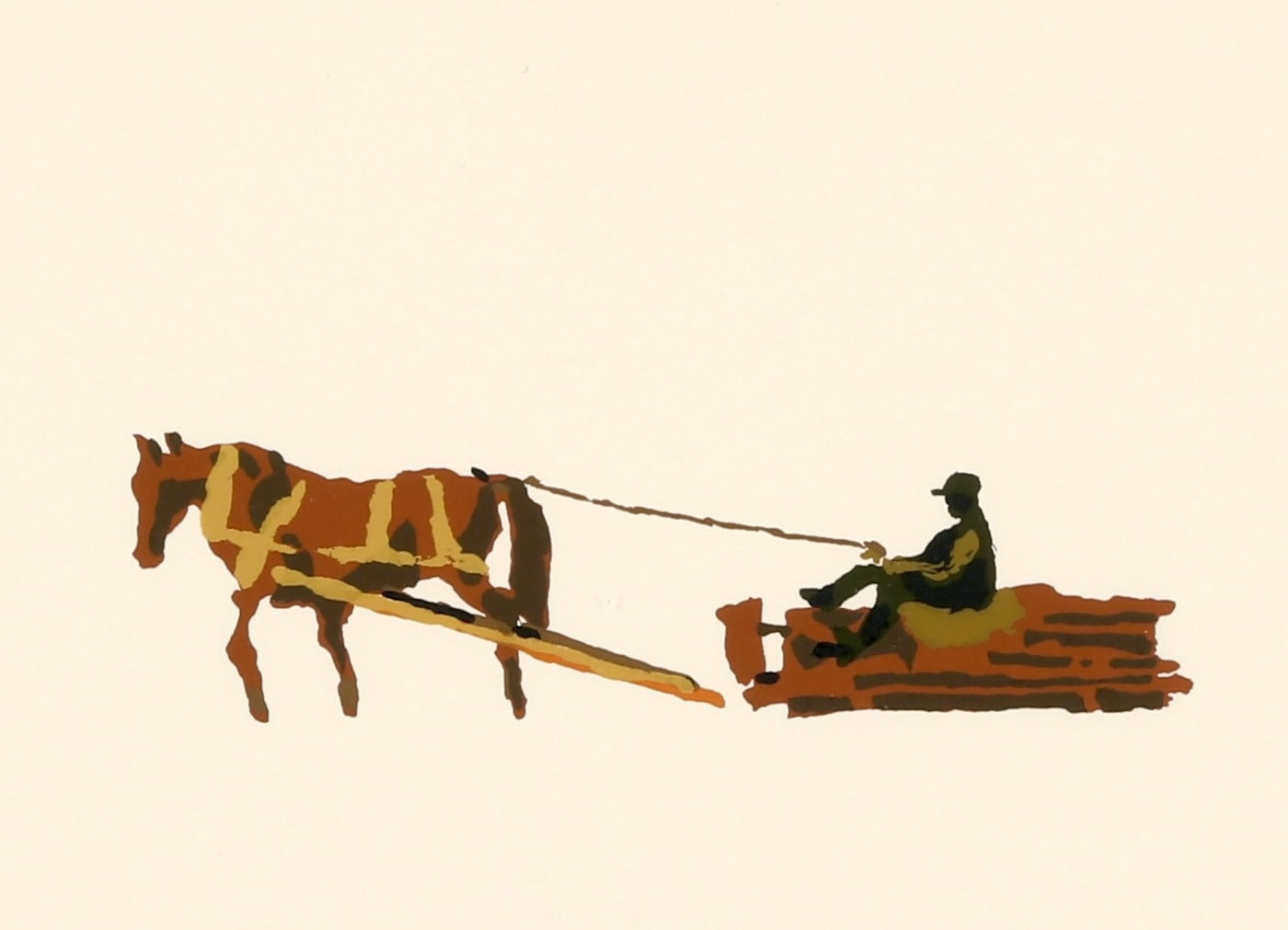 A minimalistic artwork depicting a man guiding a horse pulling a wooden sled.