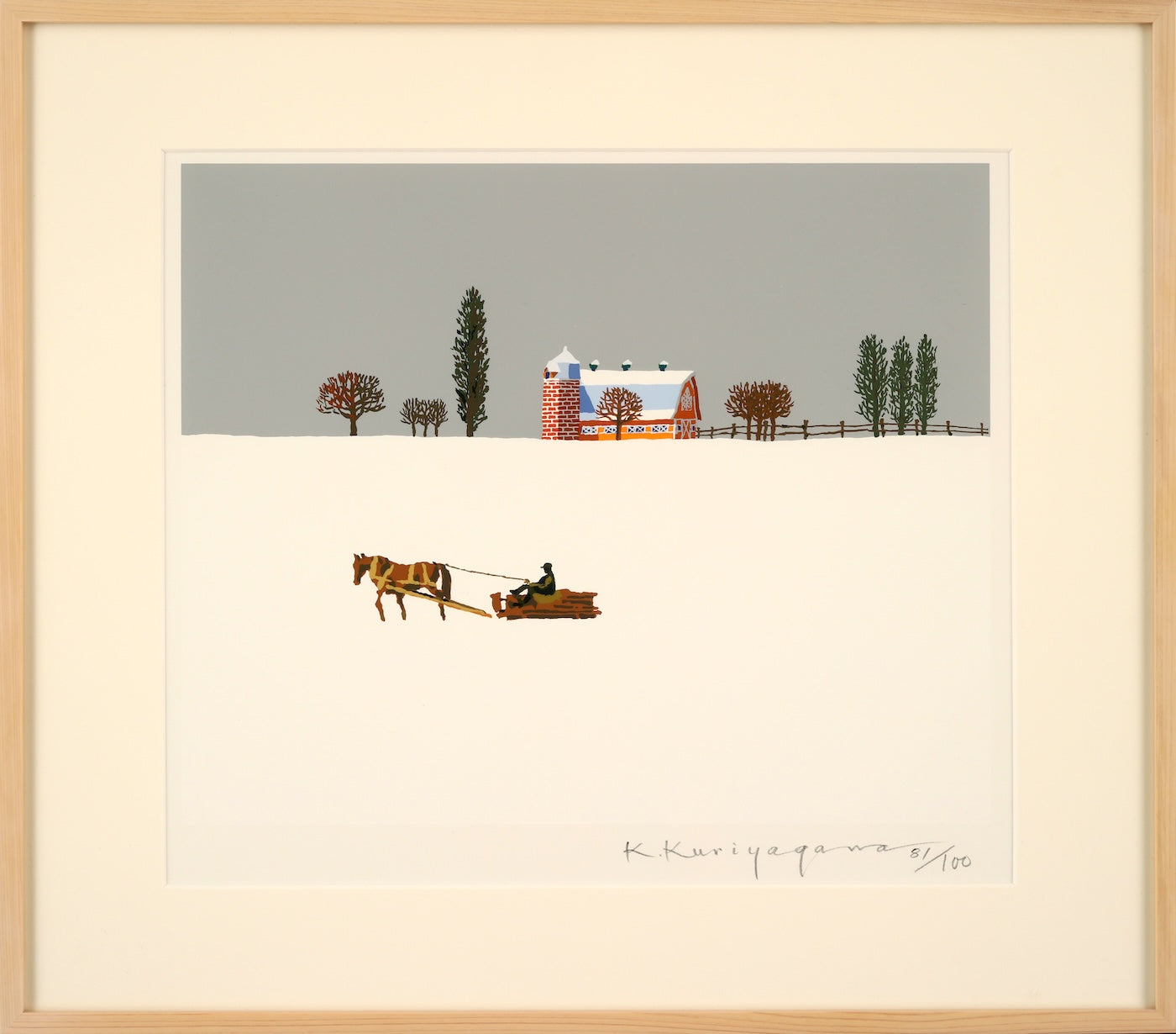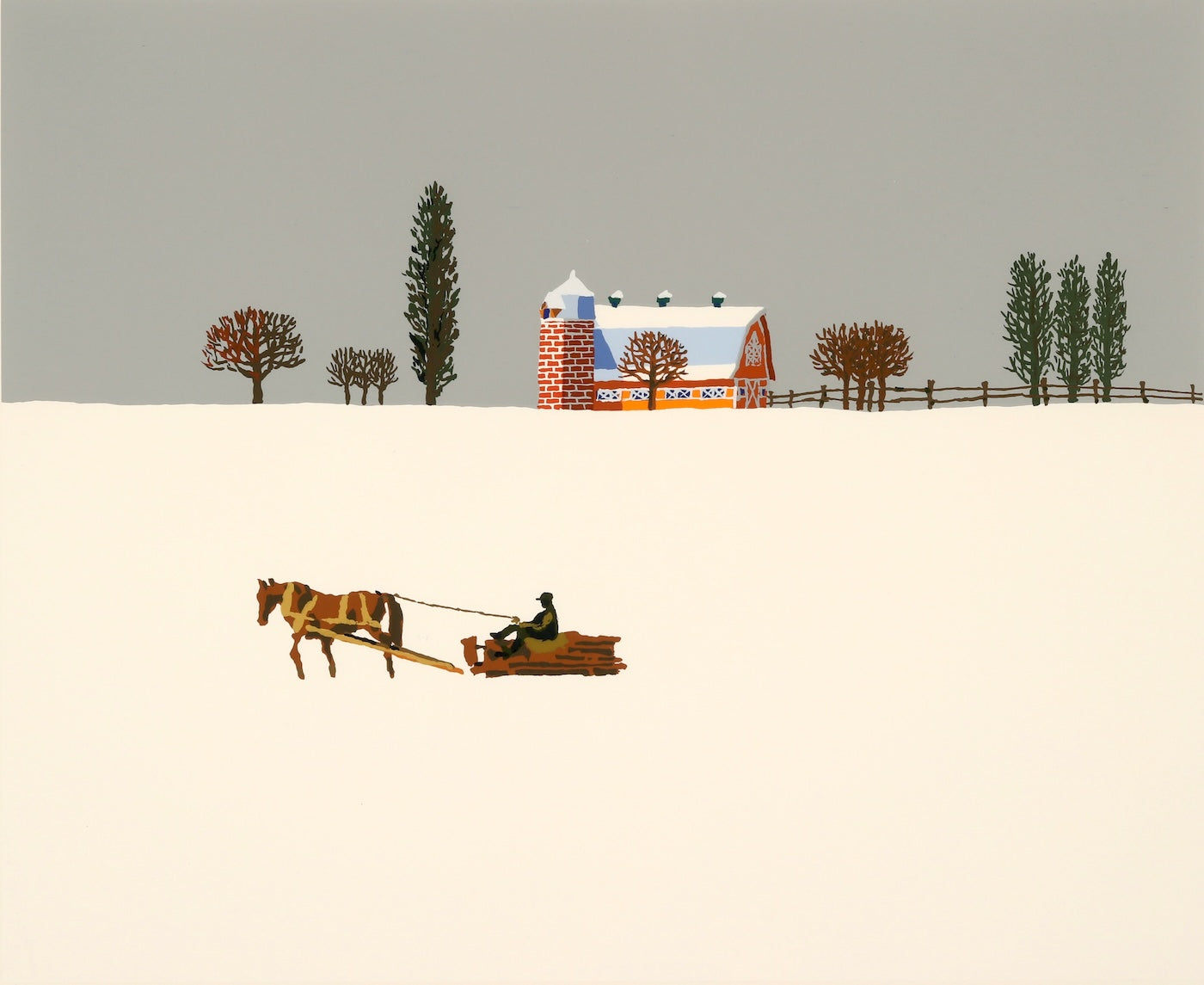 The sound of bells goes (Bokusha) silkscreen print featuring a snow-covered barn and trees.