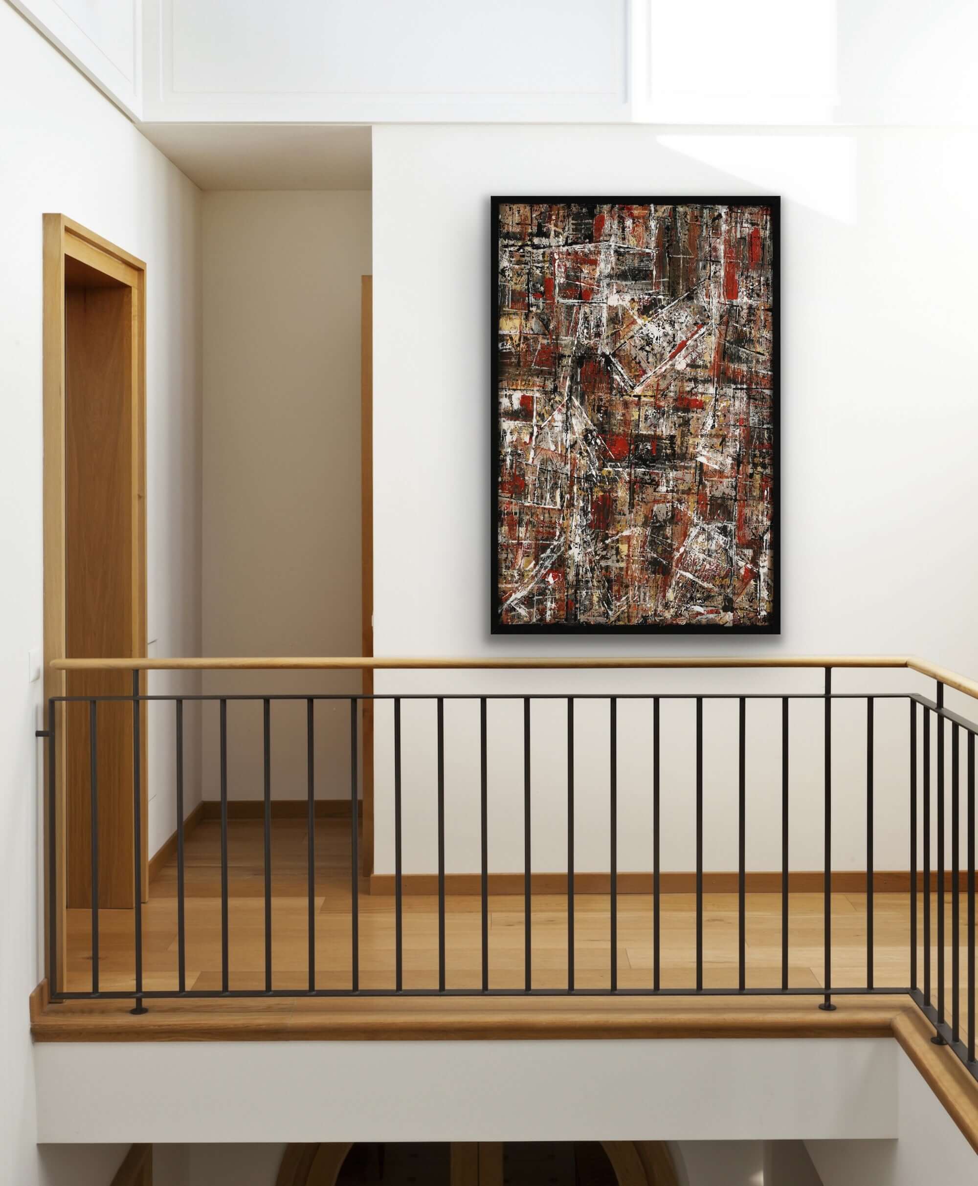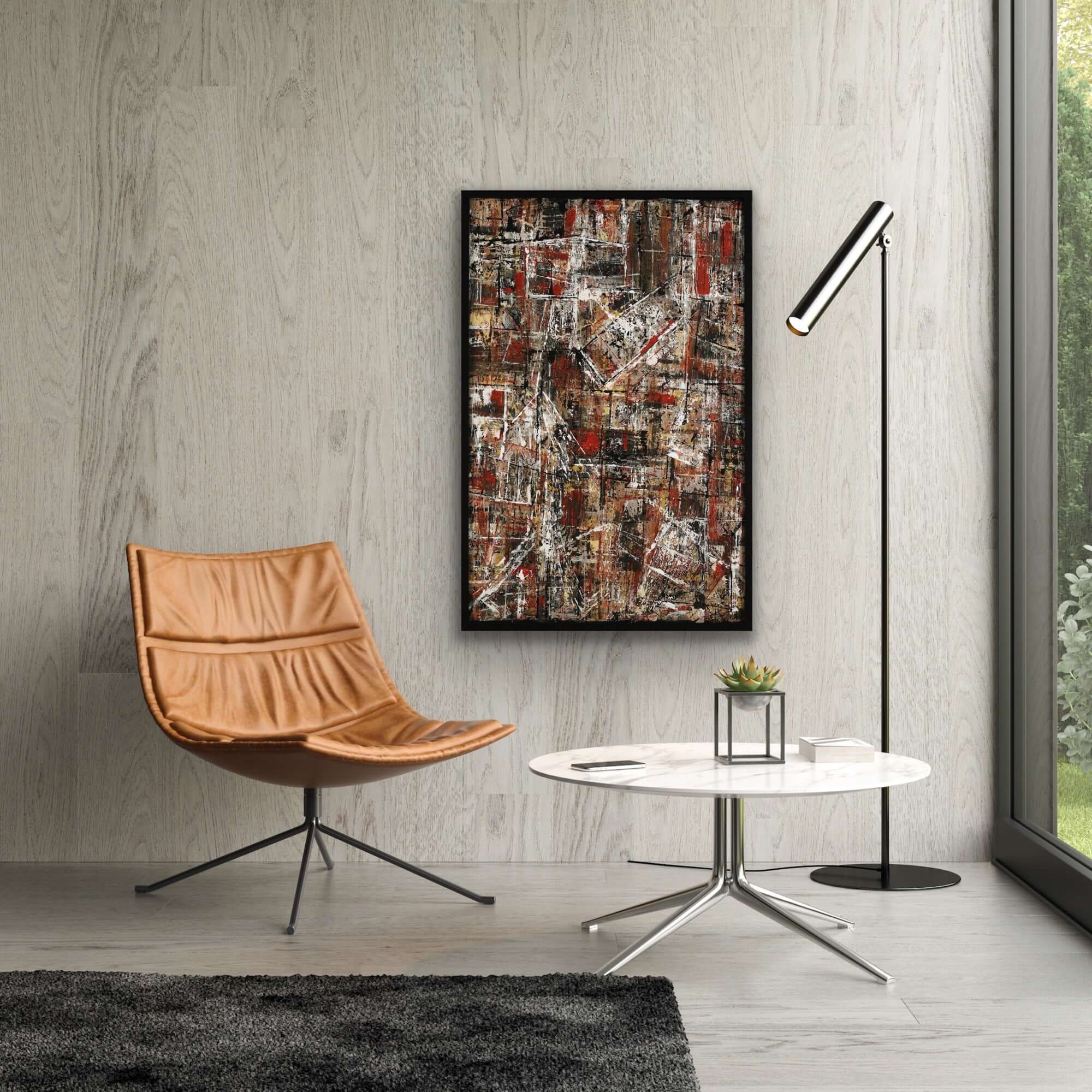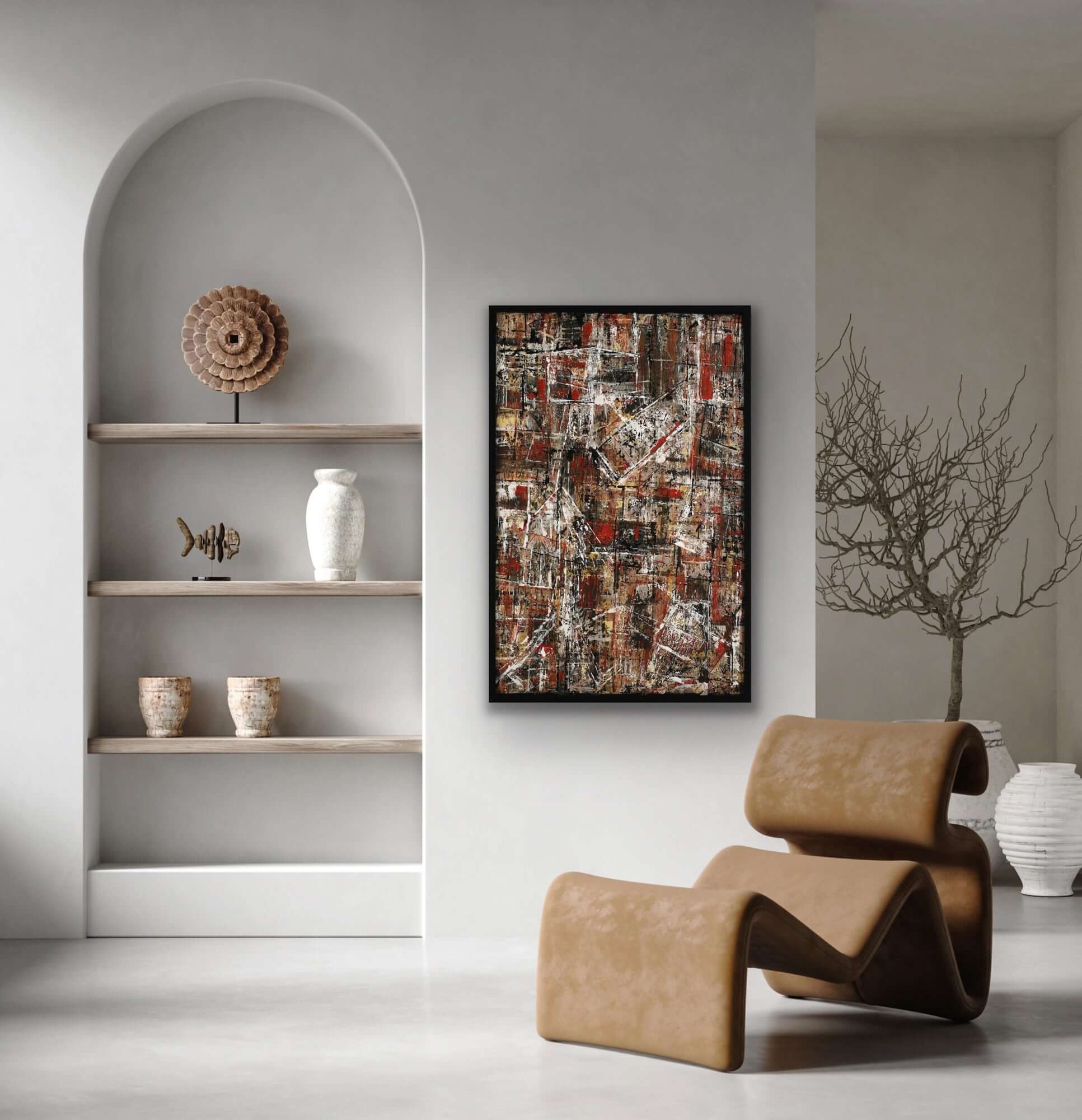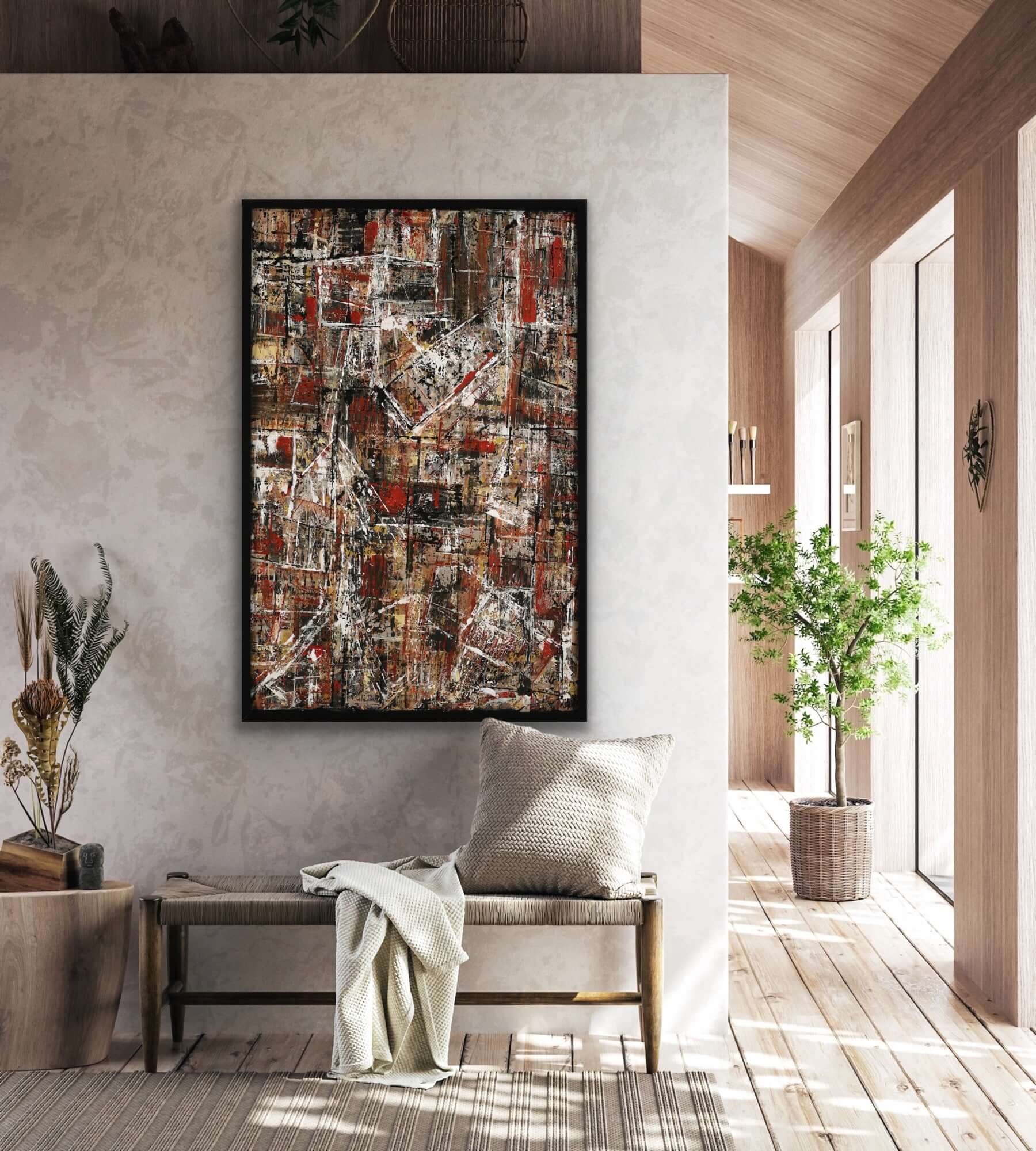 Modern abstract art piece in a stylish living room, featuring earthy tones and framed in custom poplar.