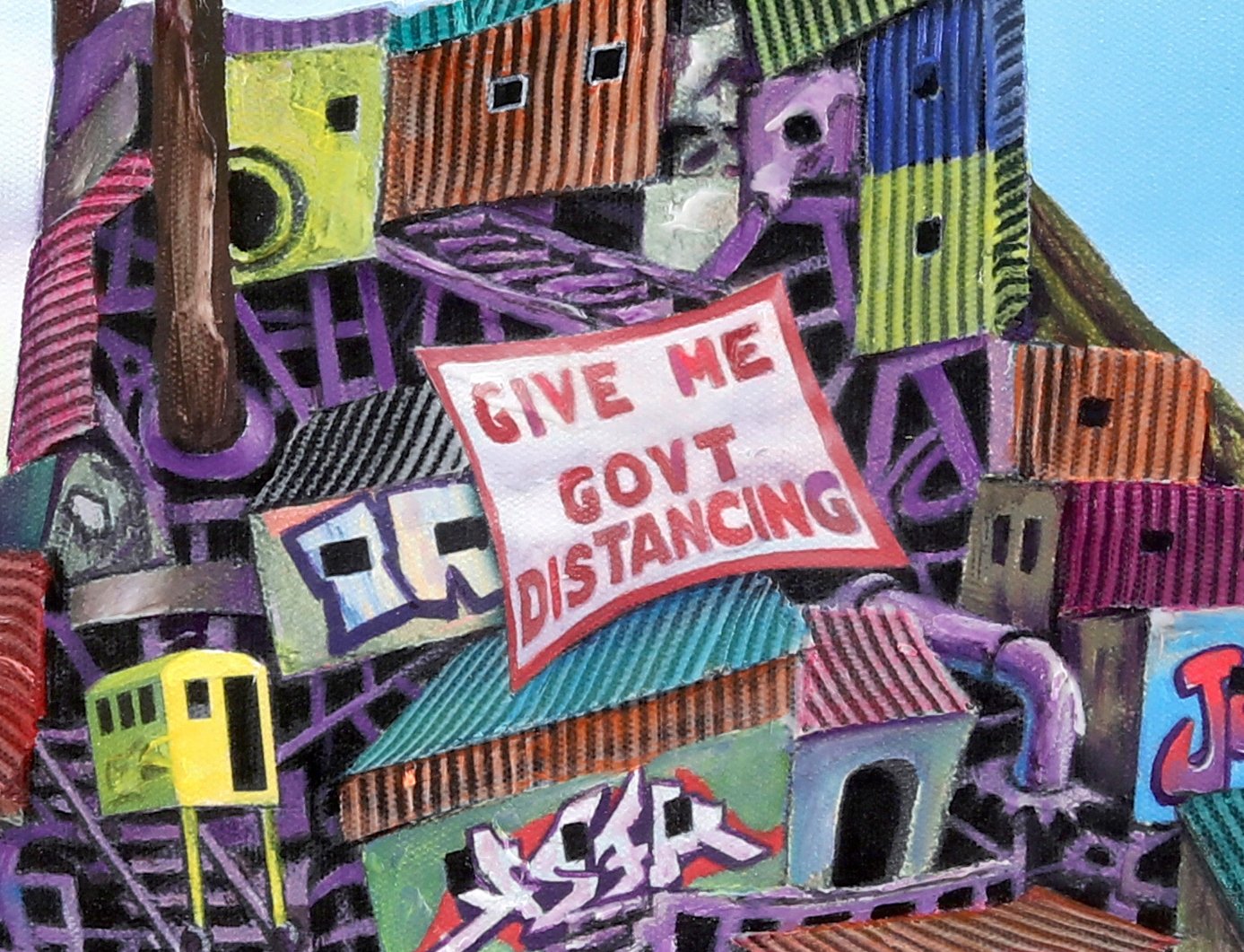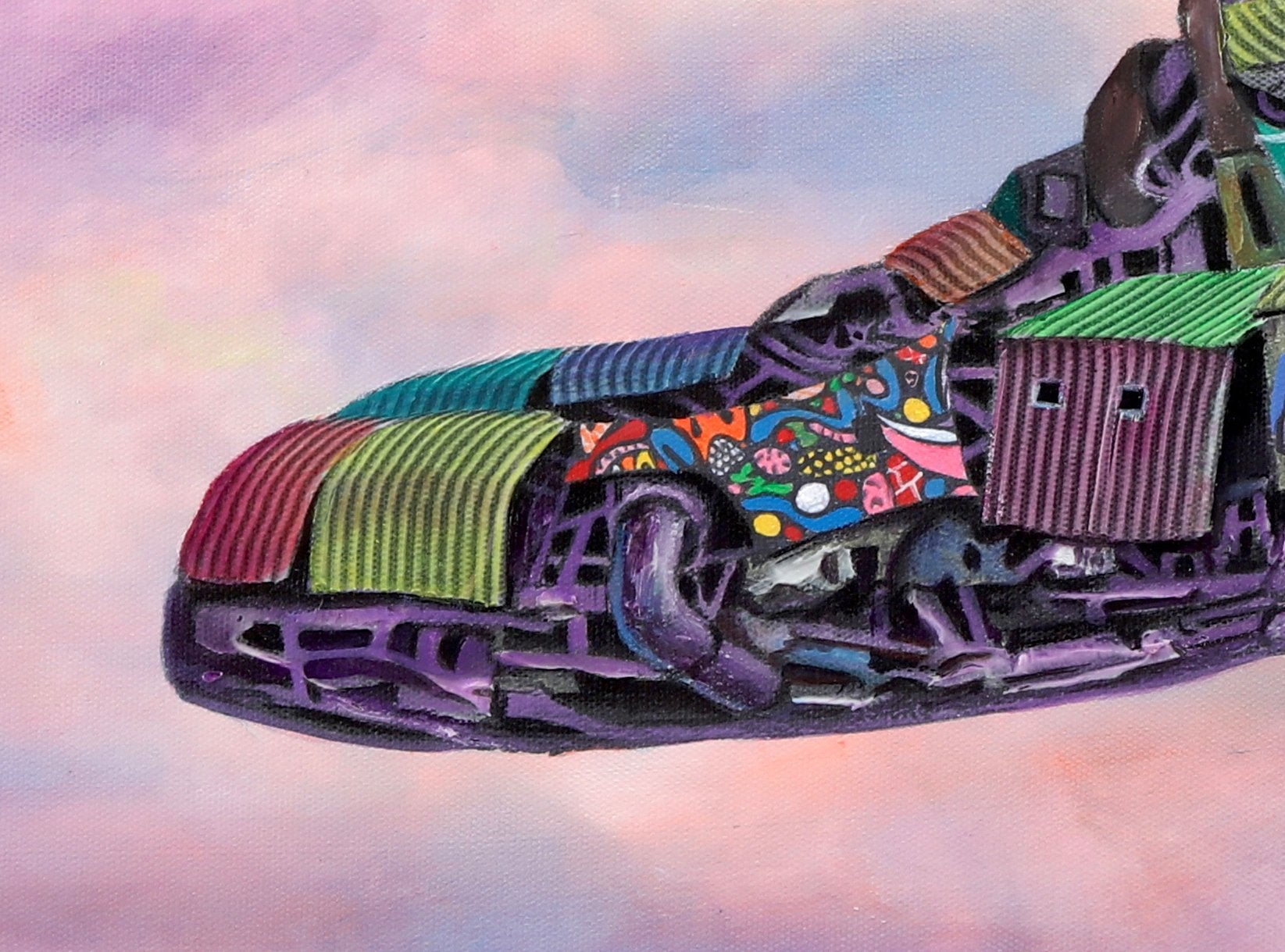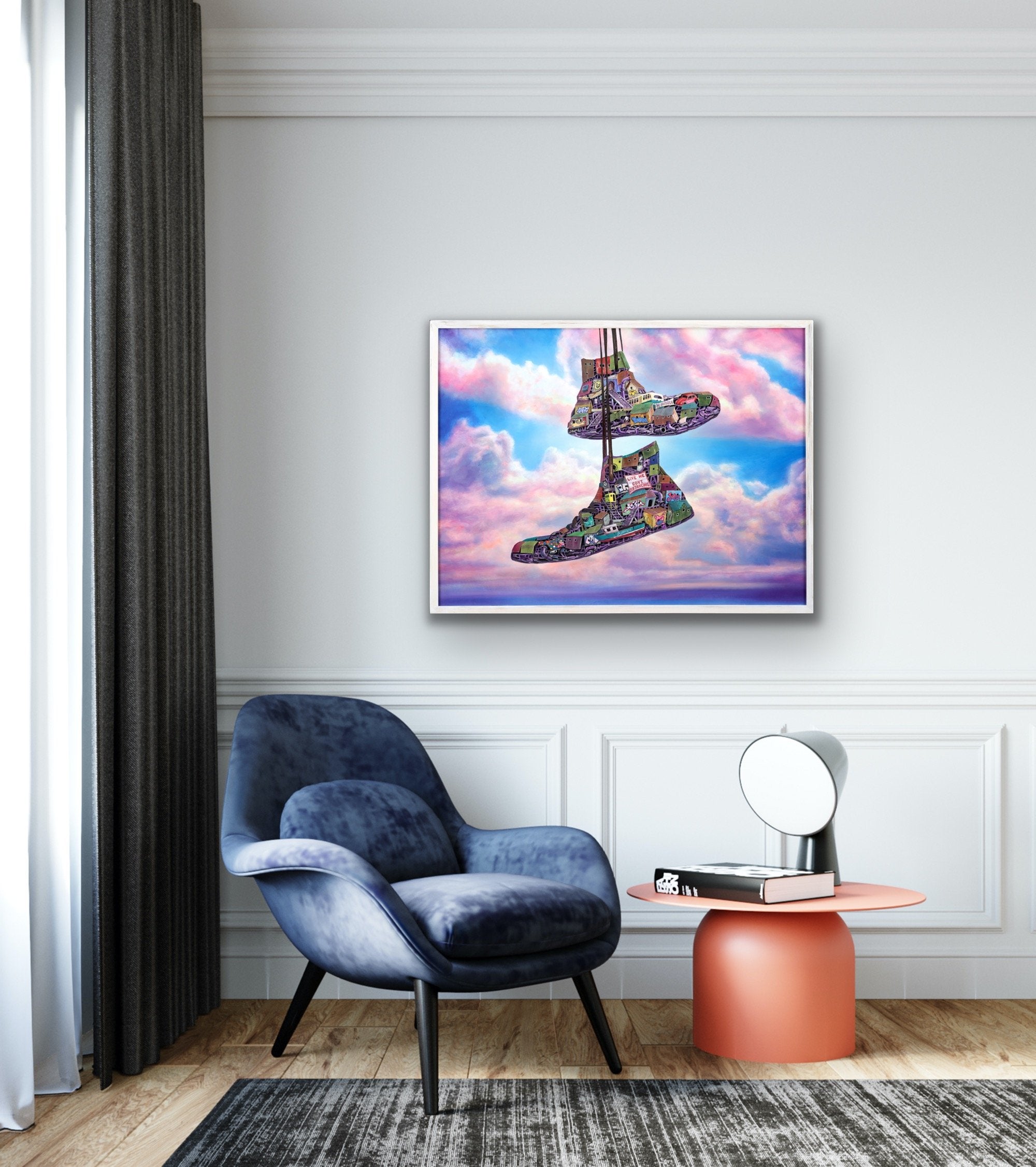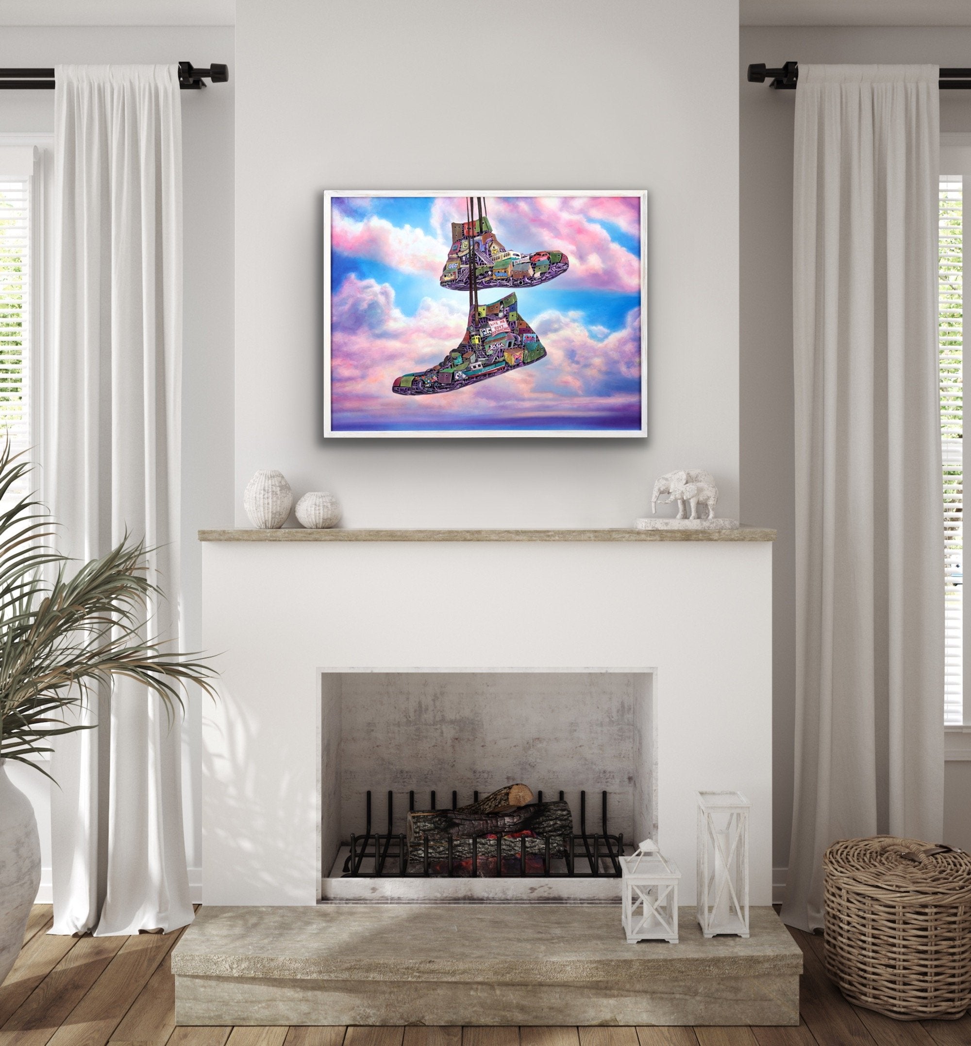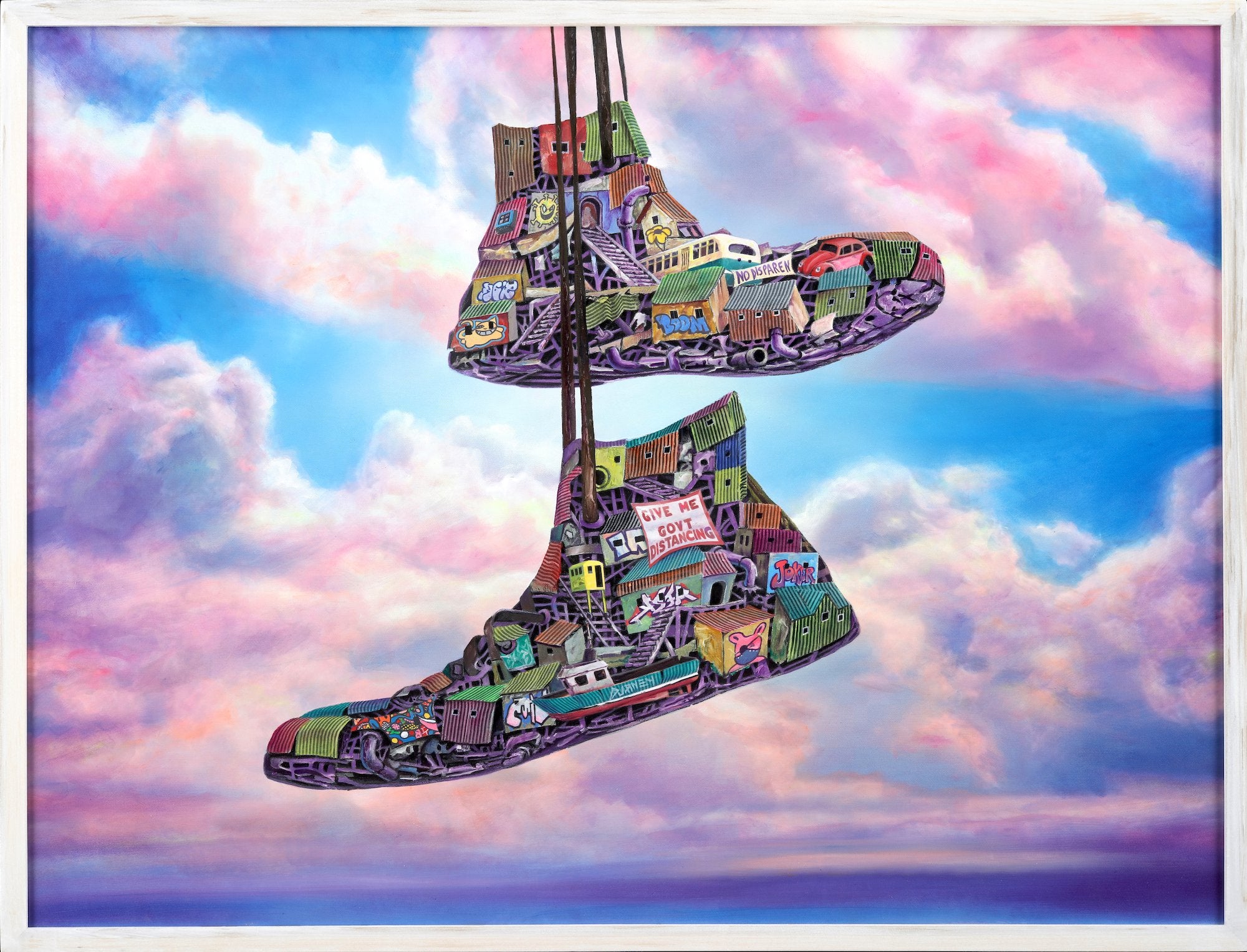 Dystopian art for sale by Lobsang Durney. Two sneakers hanging over a wire. Main view
