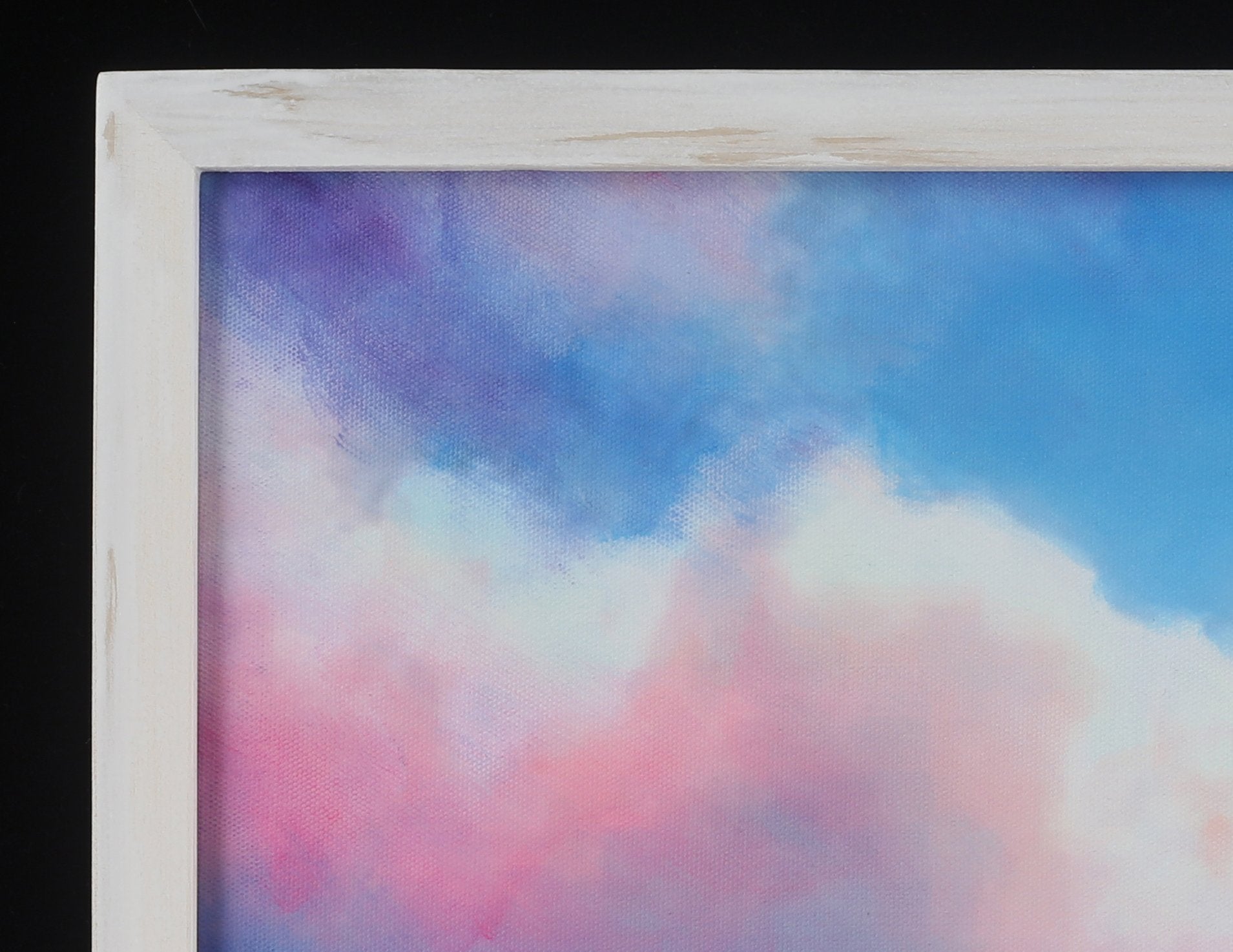 Our paintings are stretched in California on wooden stretcher bars, and stapled on the back of the painting