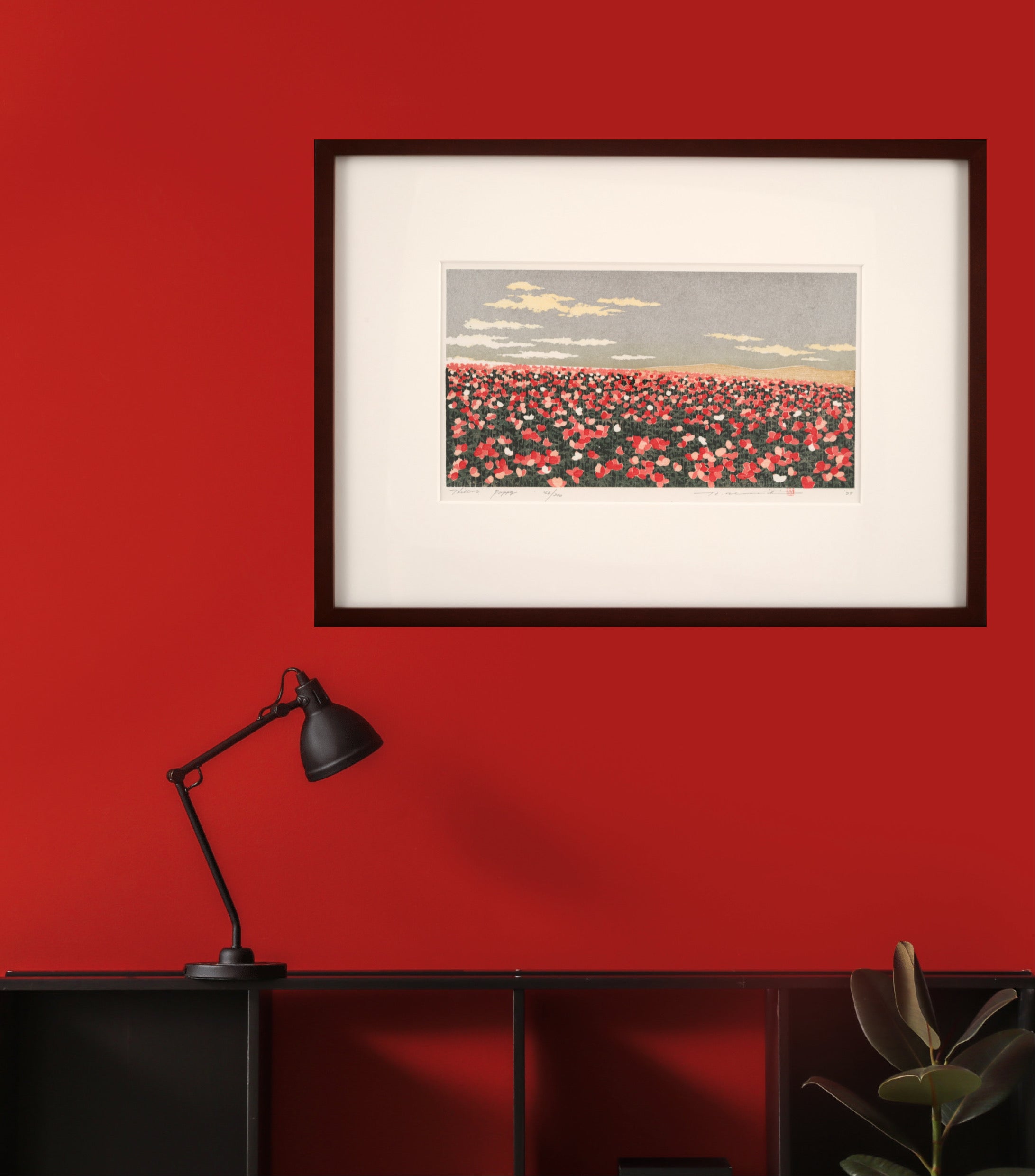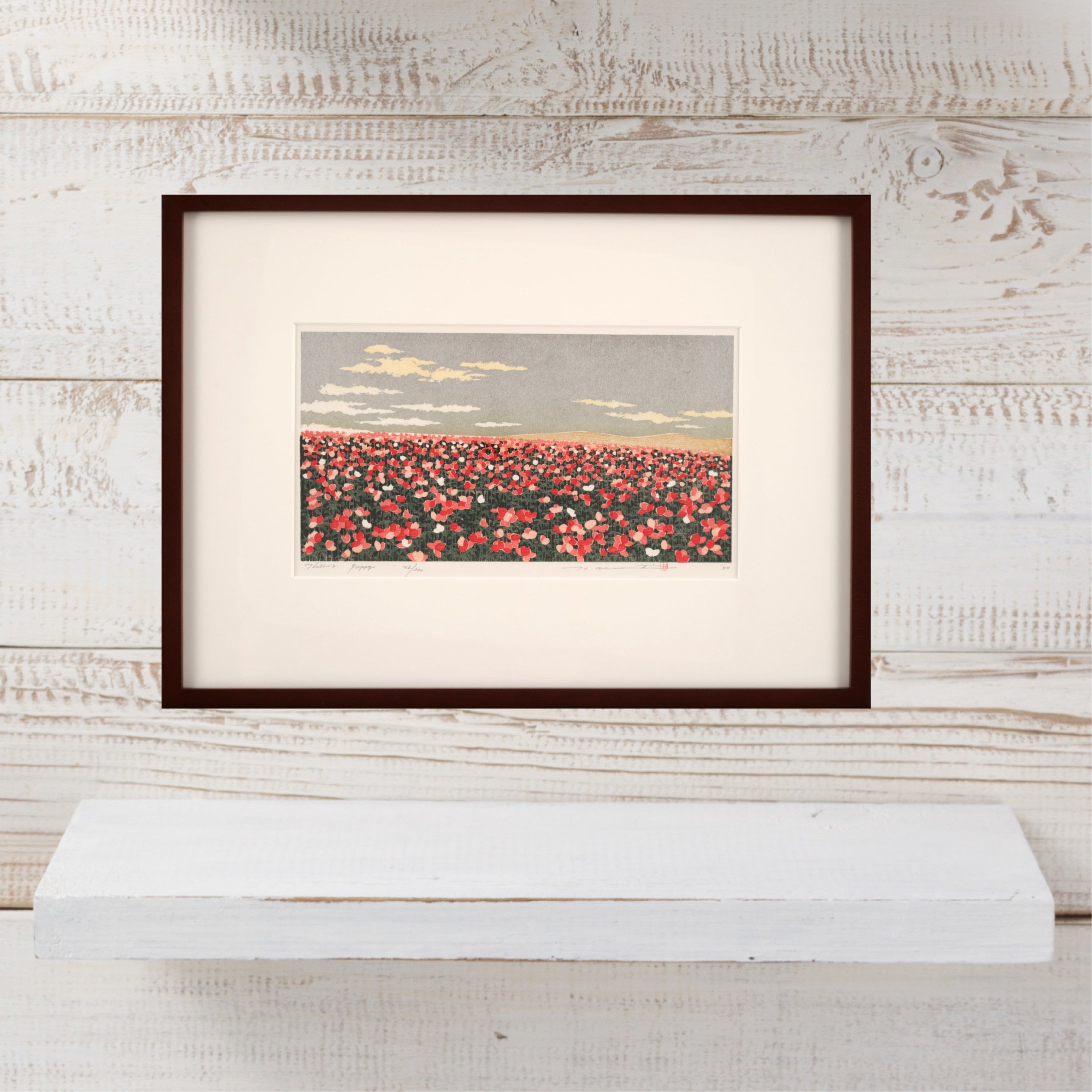 Hill-2 Poppy by Hajime Namiki, handmade woodblock print featuring a vibrant poppy field, framed in cherry wood.