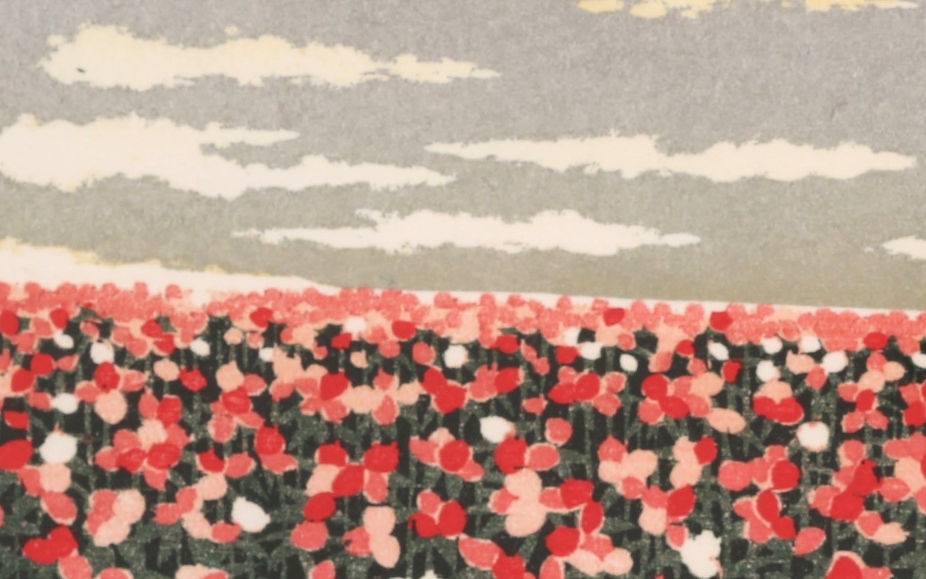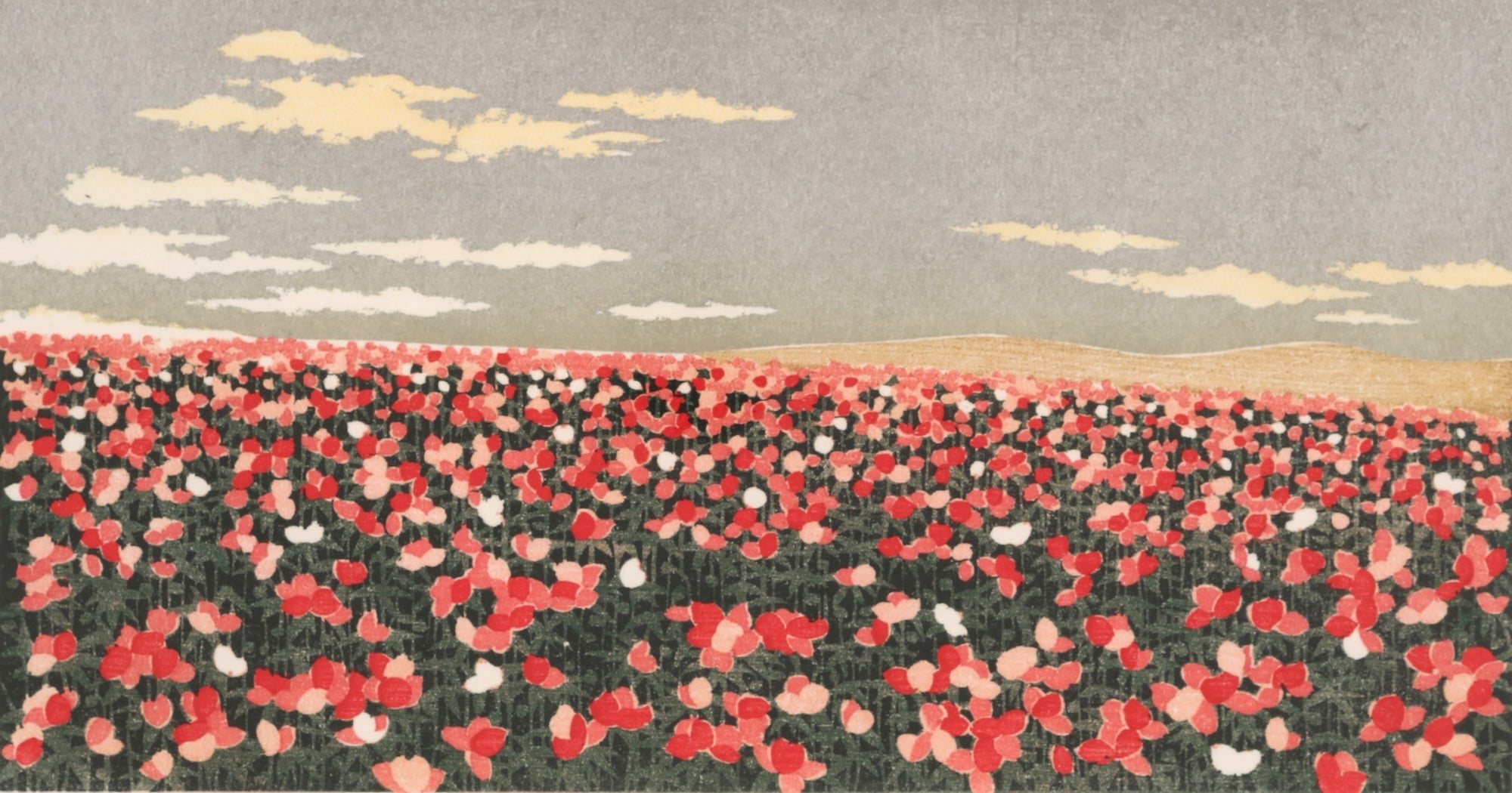Field of vibrant red and pink poppies under a cloudy sky, showcasing Hajime Namiki's woodblock print technique.