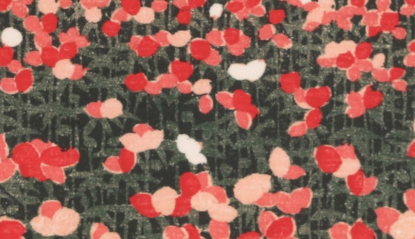 Vibrant close-up of Hajime Namiki's Hill-2 Poppy woodblock print featuring red and pink flowers on a dark background.