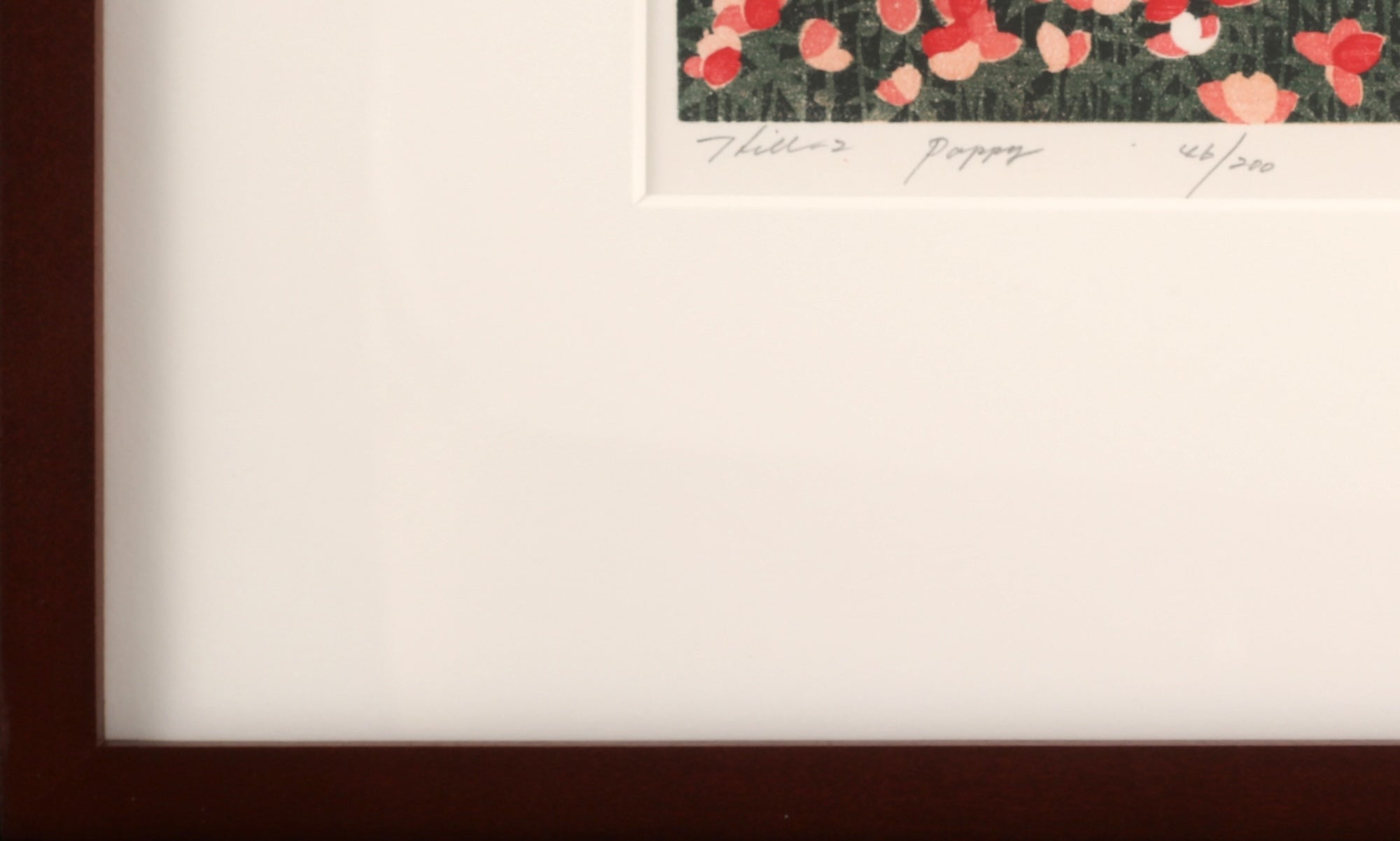Hill-2 Poppy woodblock print by Hajime Namiki, limited edition 46/200, framed in cherry wood.