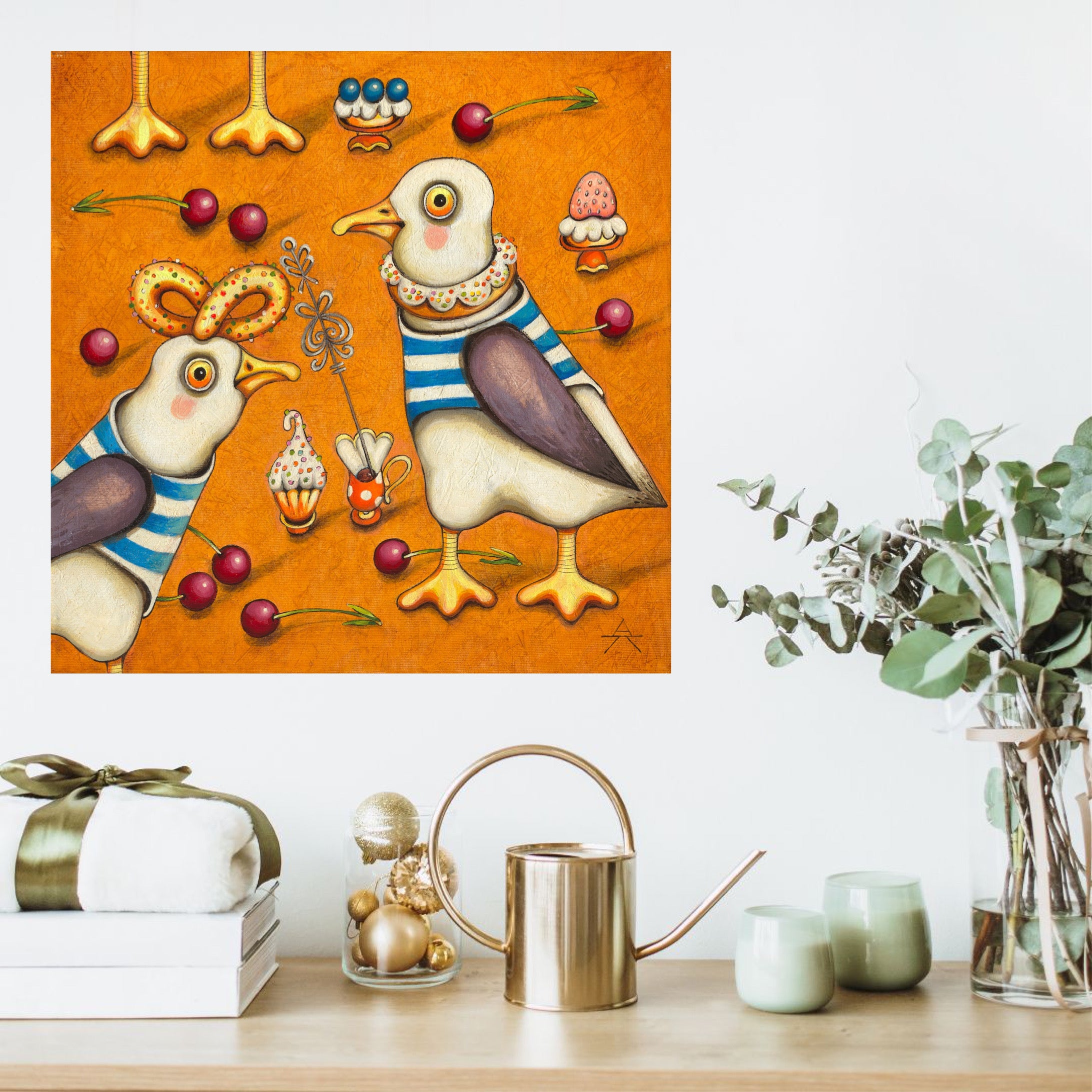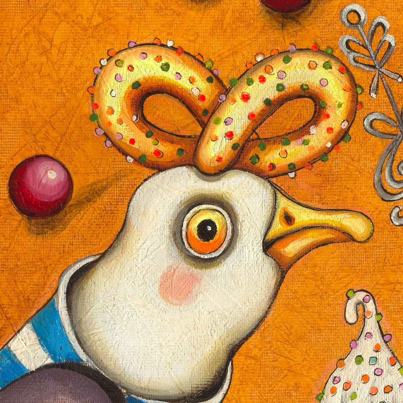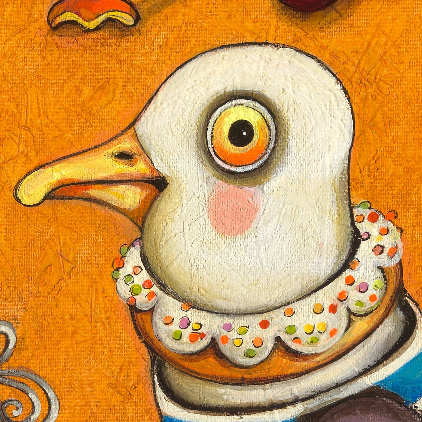 Artwork featuring whimsical seagulls in playful attire, by Alyona Krutogolova, vibrant colors on canvas.