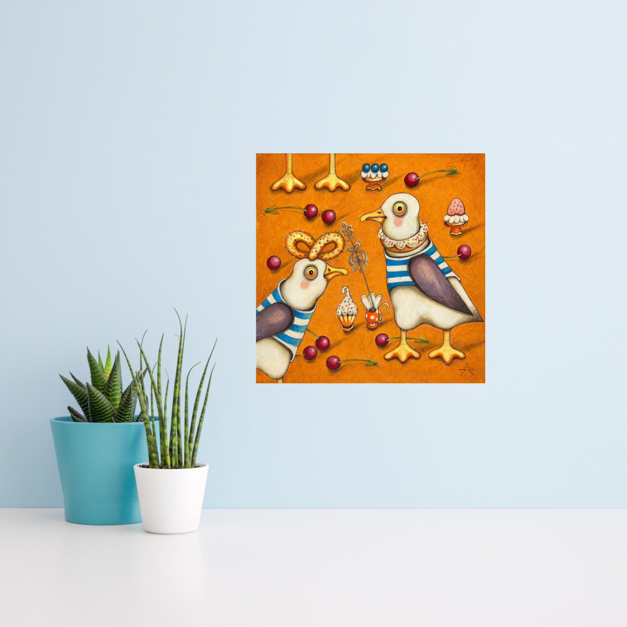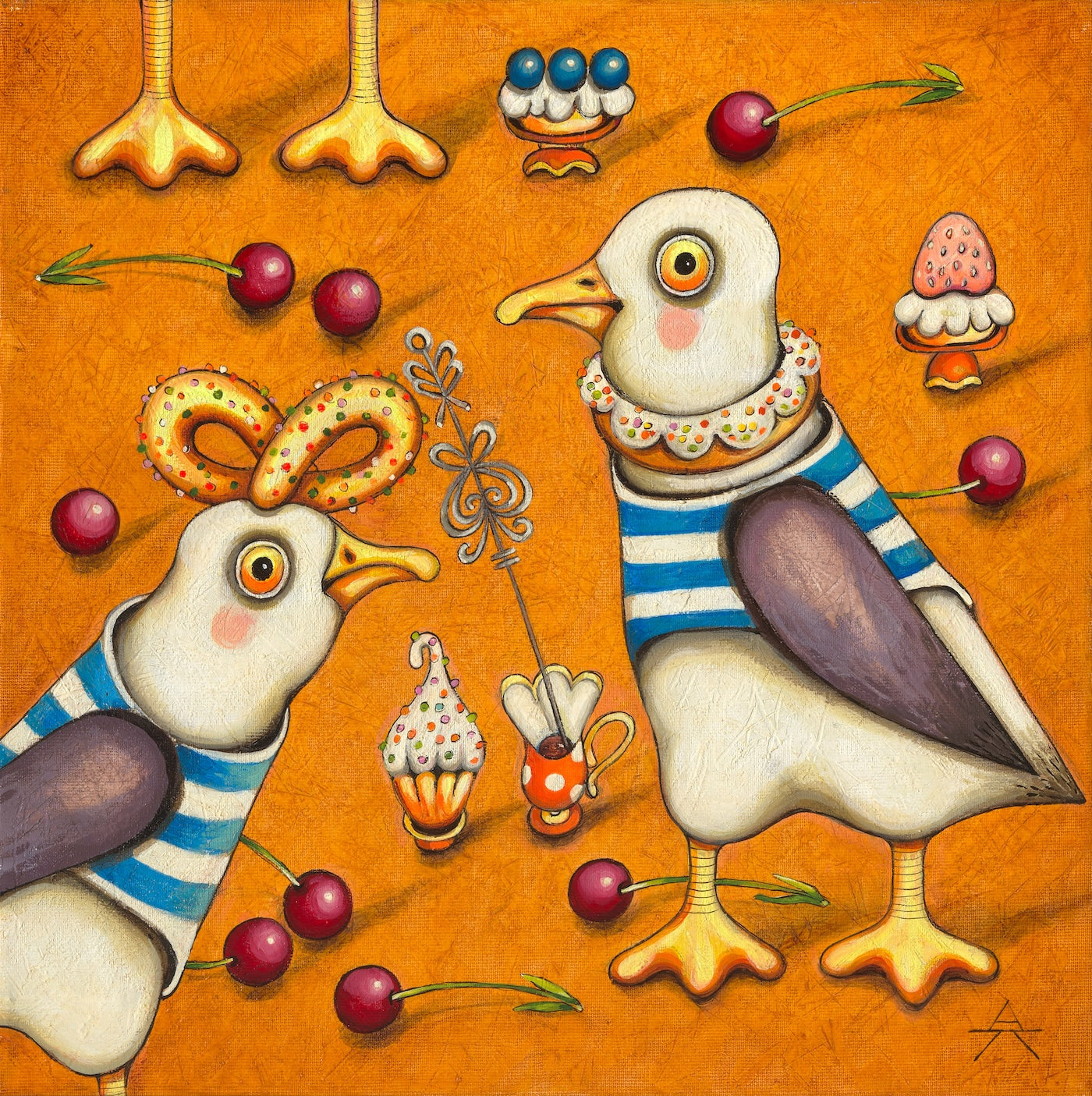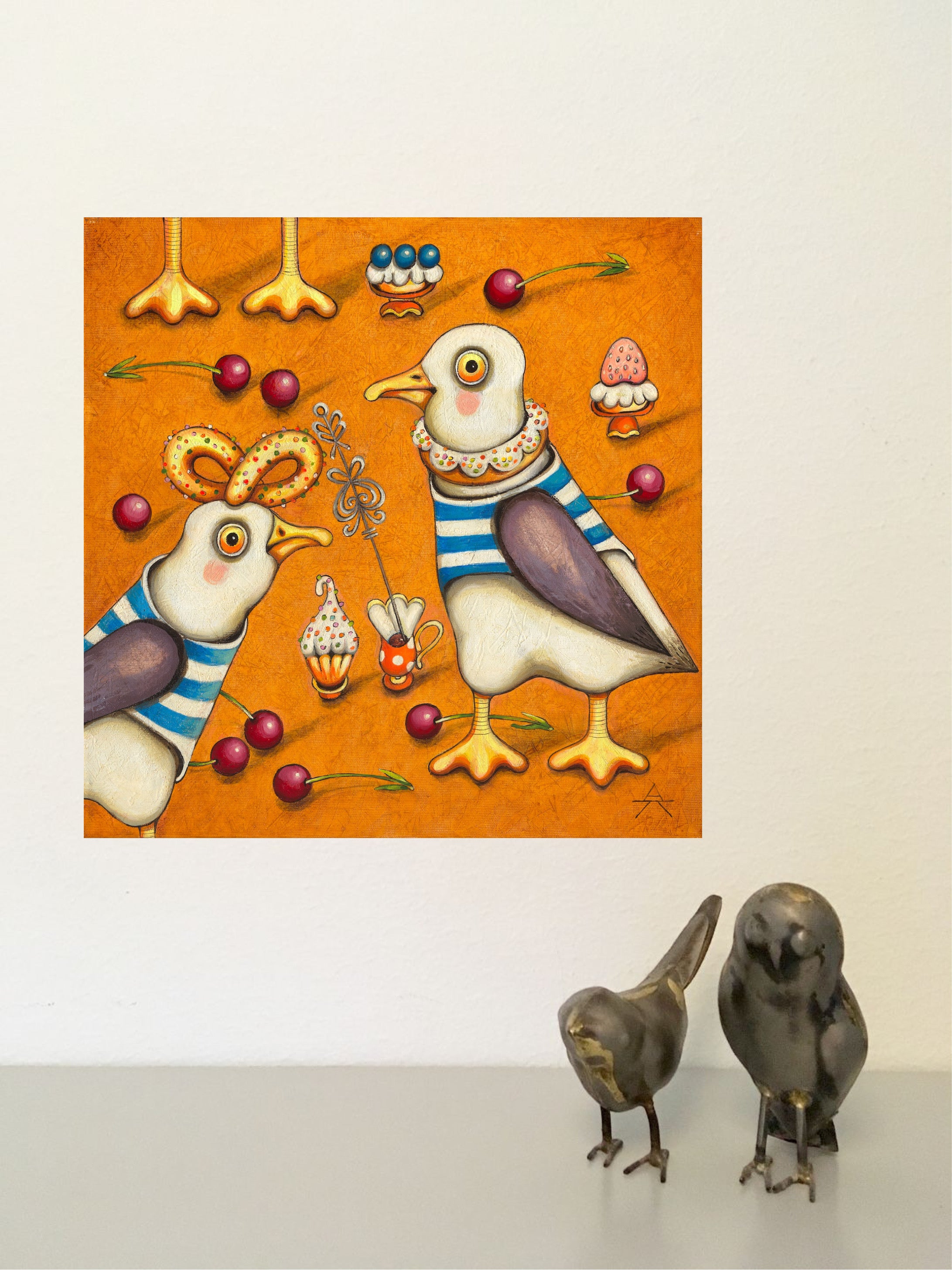 Whimsical painting of two seagulls in striped shirts, surrounded by colorful treats on a warm orange background.