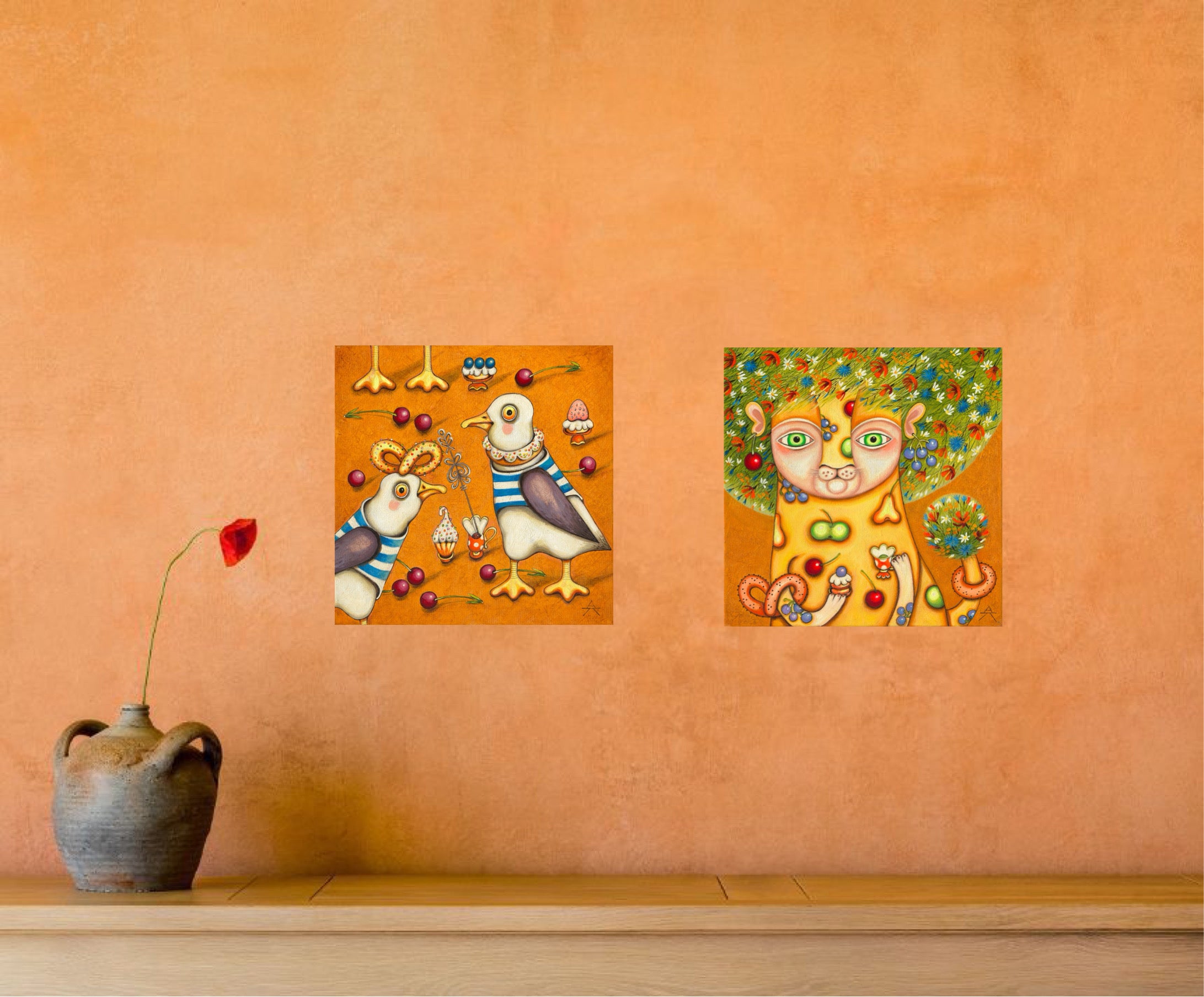 Two vibrant paintings by Alyona Krutogolova depicting whimsical creatures on an orange wall.