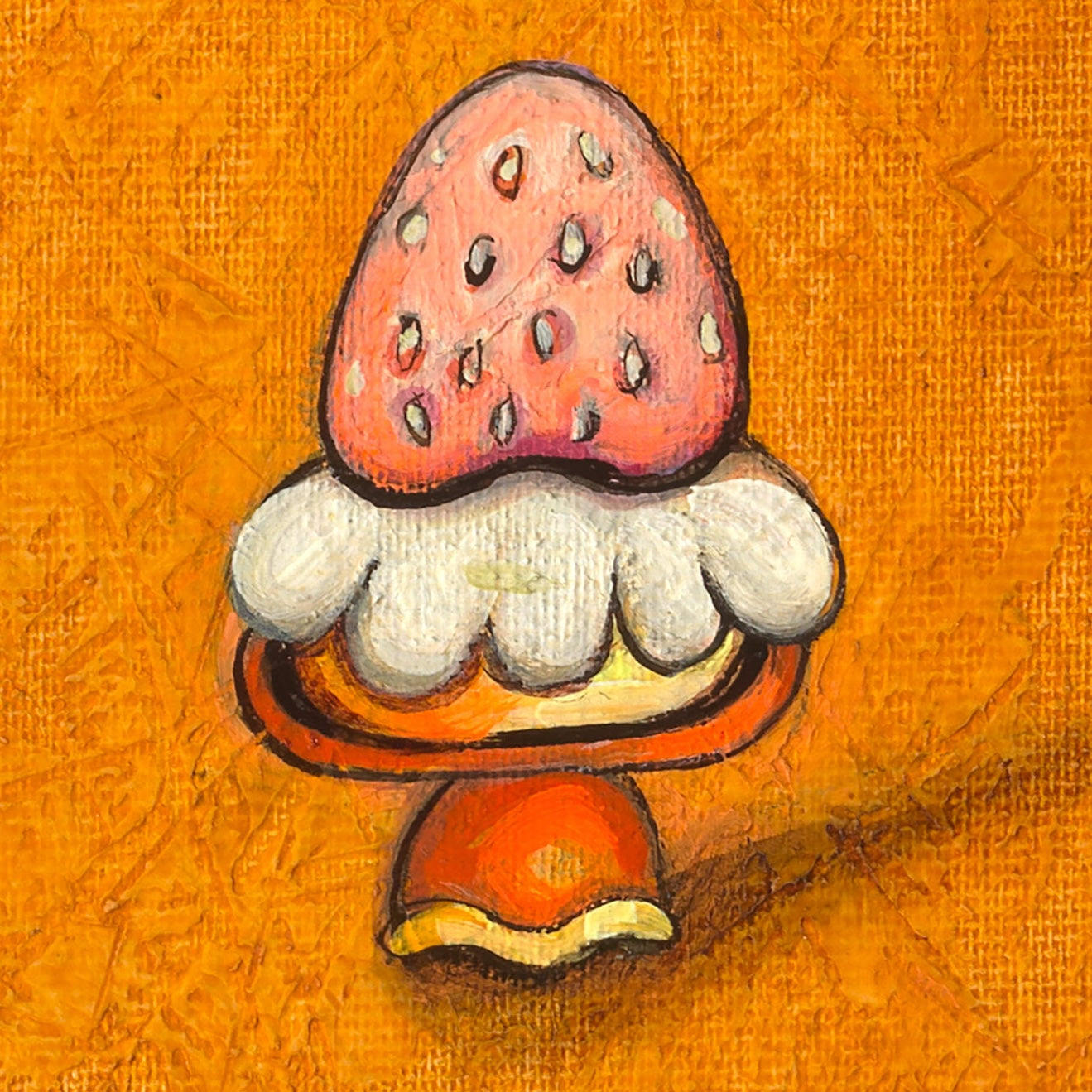 Colorful mushroom illustration with a pink cap and white base on a vibrant orange background.