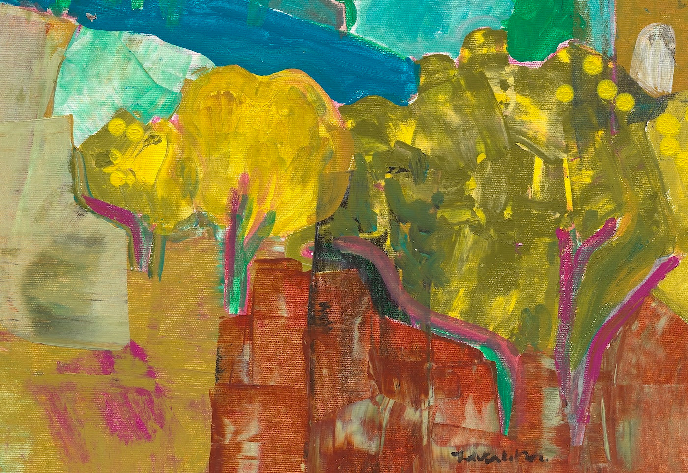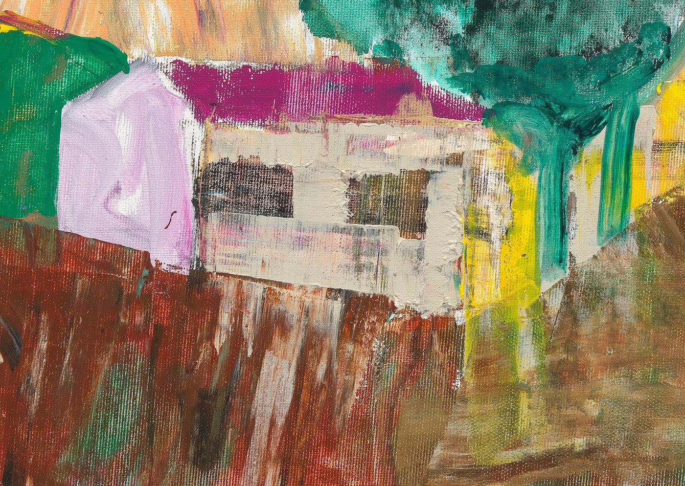 The richly layered arrangement of this scene underpins Tavalina’s considered approach to building a composition. Her additive process -creating registers and layers of paint and color - results in an abstracted, almost geometric, framework.