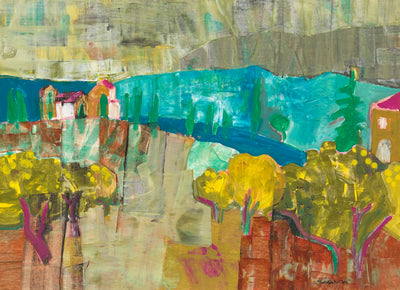 Note here how the surface of the landscape - the mountains, the lakes, the fields - have an almost three dimensional texture, each stroke creating a shape distinct from its neighbor but melding into a unified, abstracted whole.