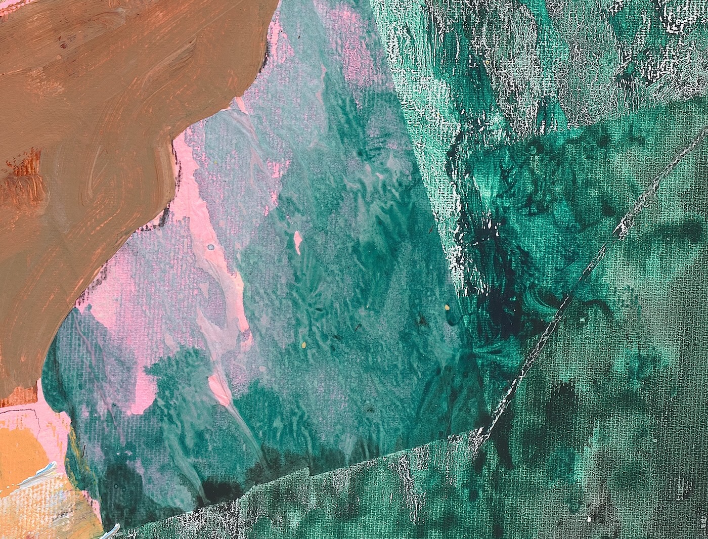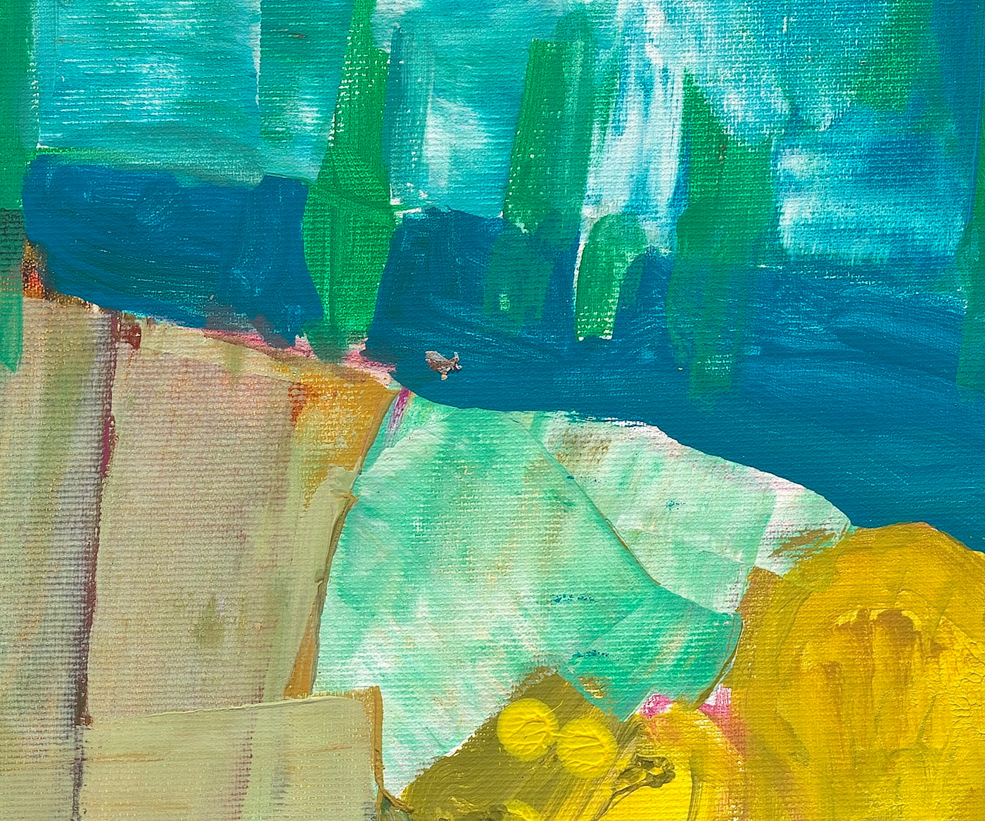 This lends a poignancy to her domestic still lifes, views she has created or noticed within her home. Explorations in this series focus on blocks of color: warm, intimate, and grounded.