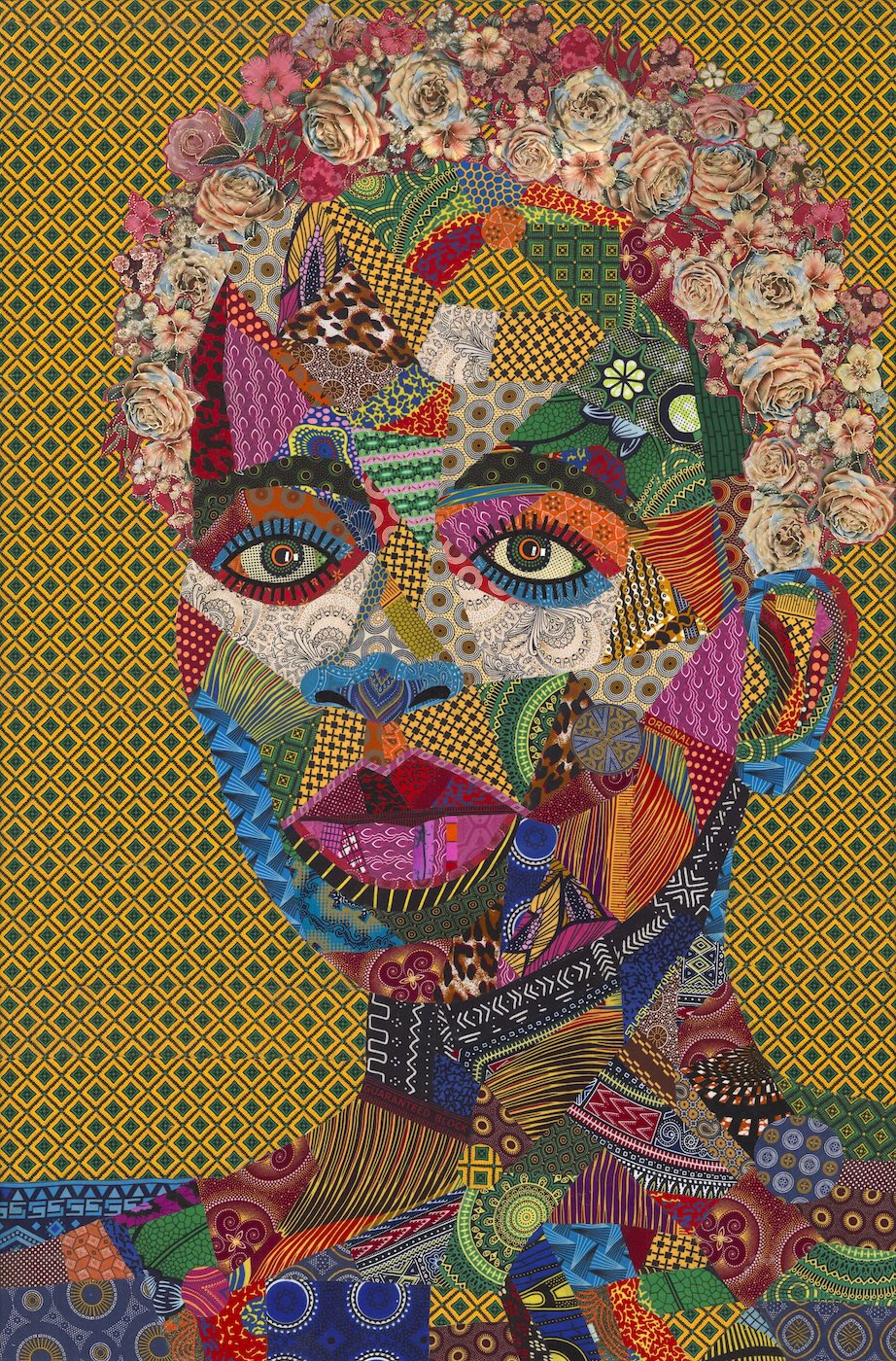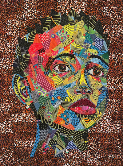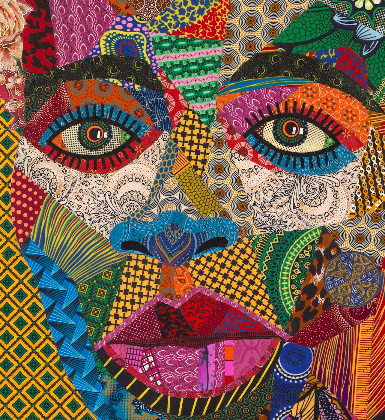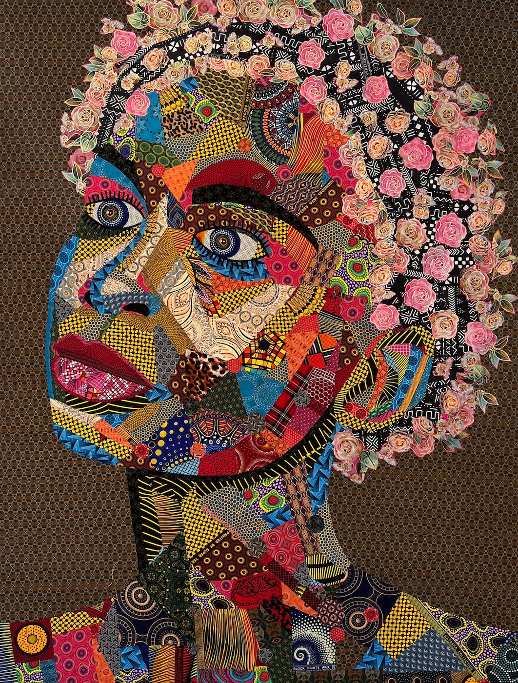For his artwork, Splash collects fabric from different tribes and cultures in Africa. He then cuts them out in a unique mosaic fashion and glues them to canvas. Each portrait is created from hundreds of oddly shaped pieces of patterned fabric.