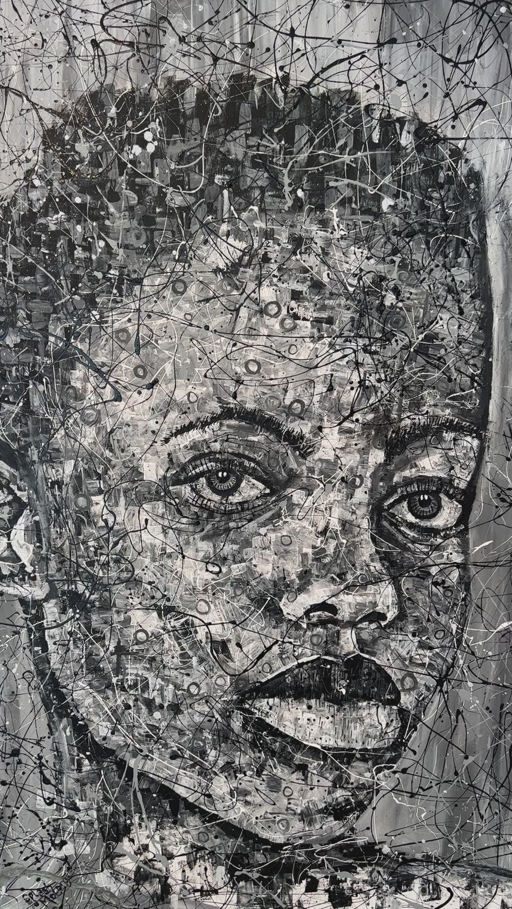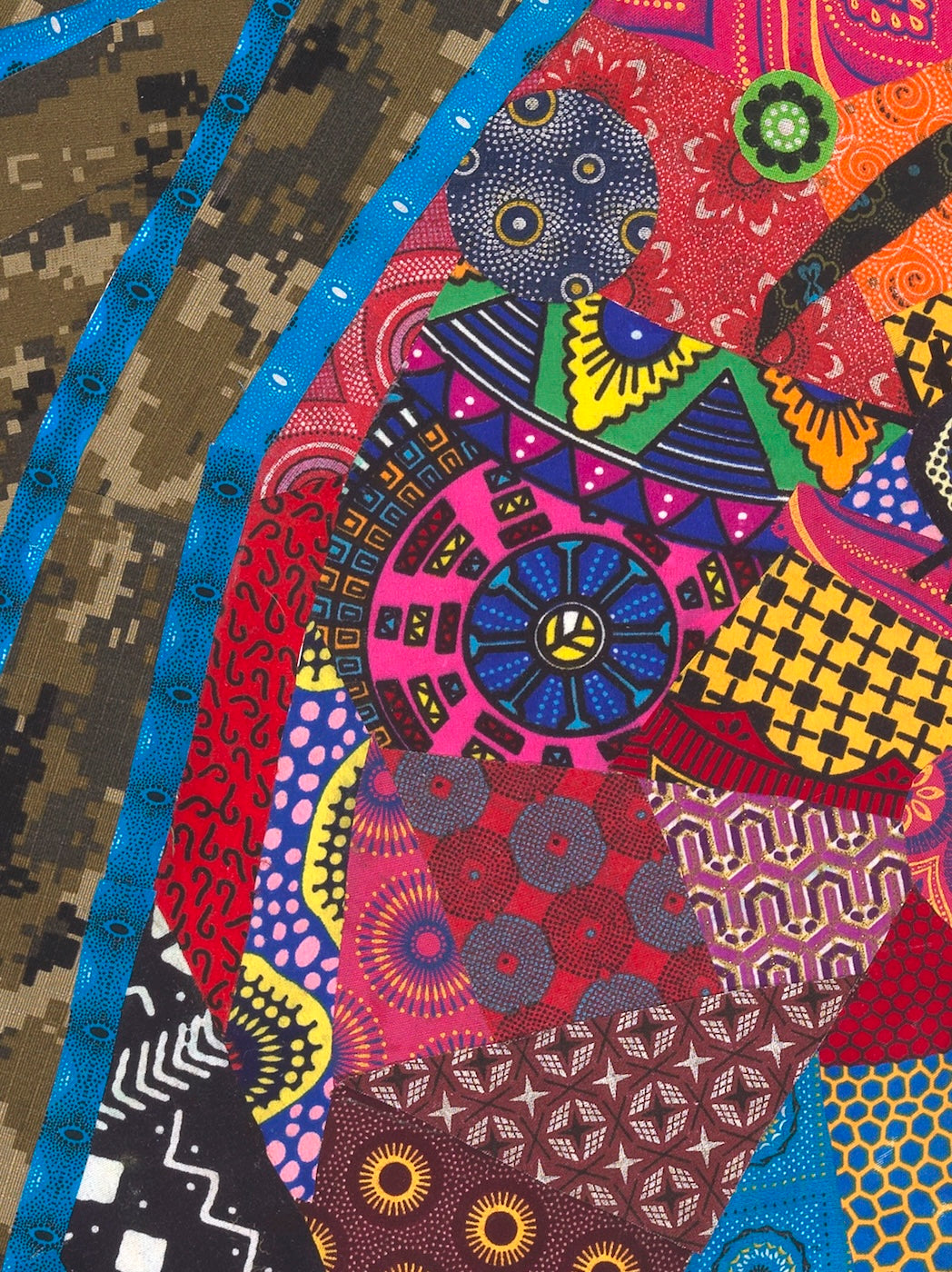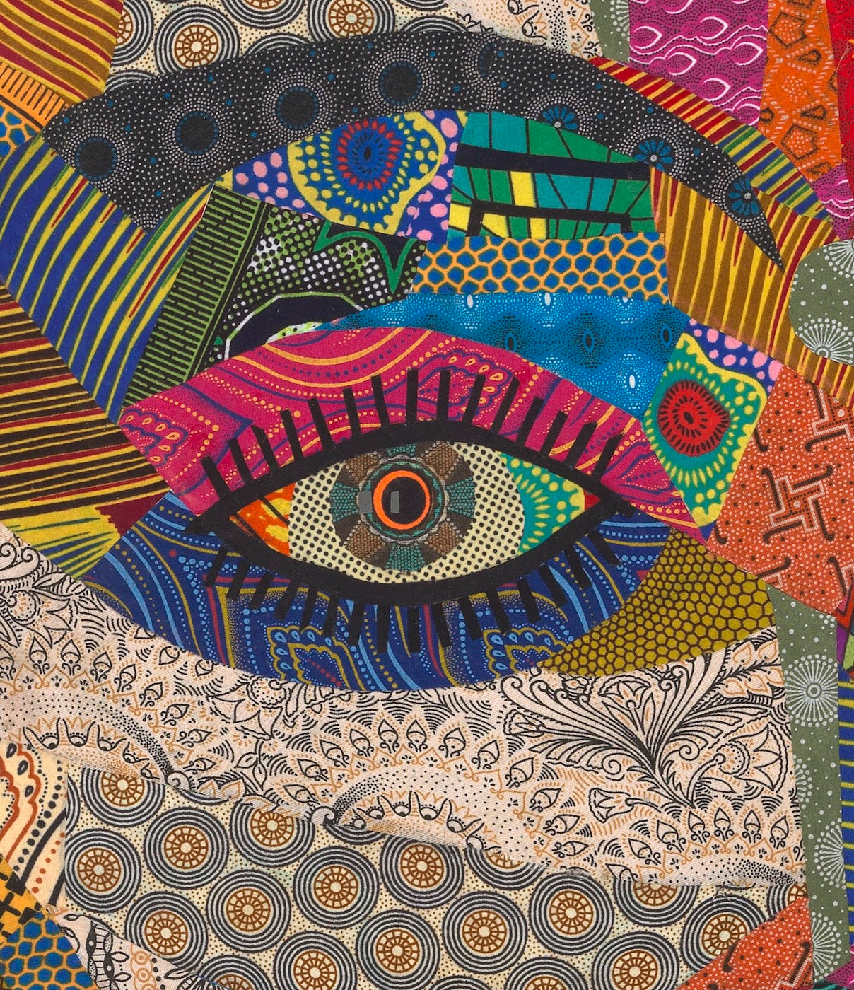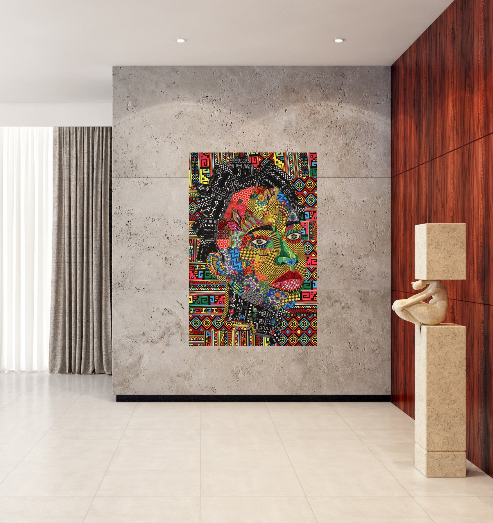 For his artwork, Splash collects fabric from different tribes and cultures in Africa. He then cuts them out in a unique mosaic fashion and glues them to canvas. Each portrait is created from hundreds of oddly shaped pieces of patterned fabric.