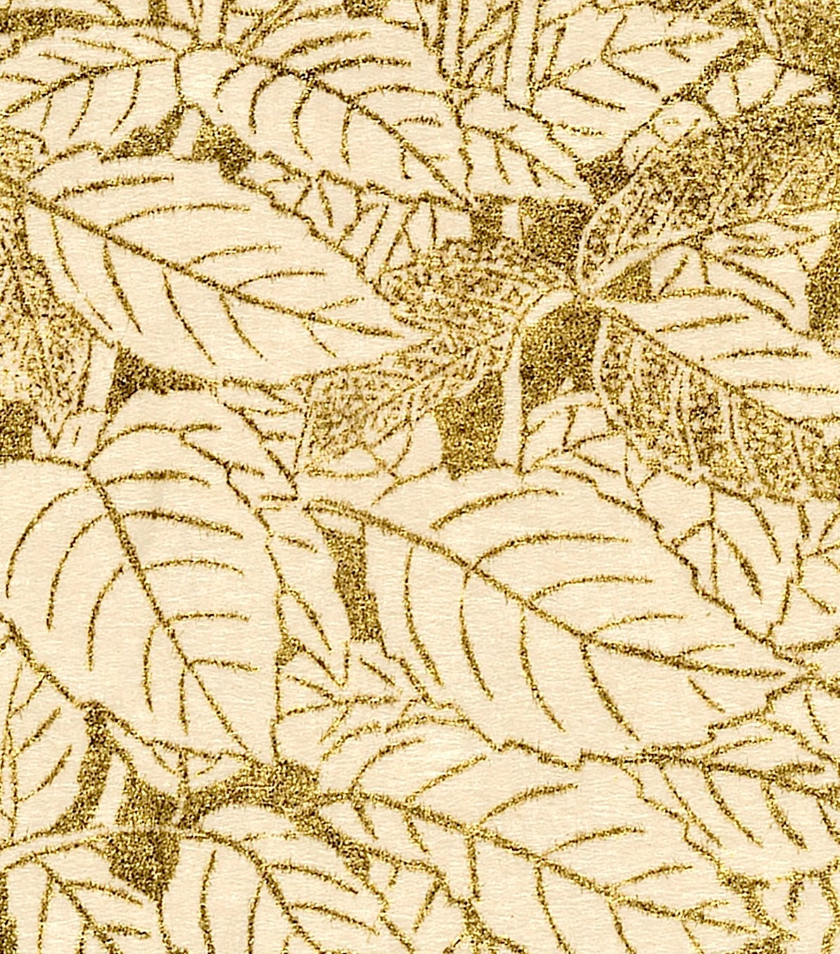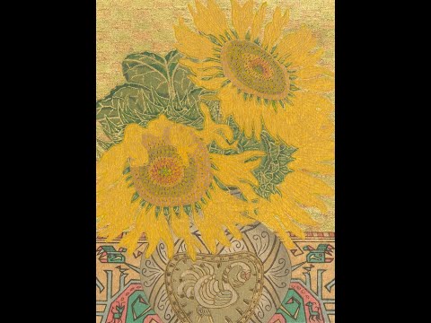 While the ink is still wet, he presses the sheets of gold leaf on the whole surface of the paper. With the sticky ink serving as glue, the gold leaf adheres to the inked areas.