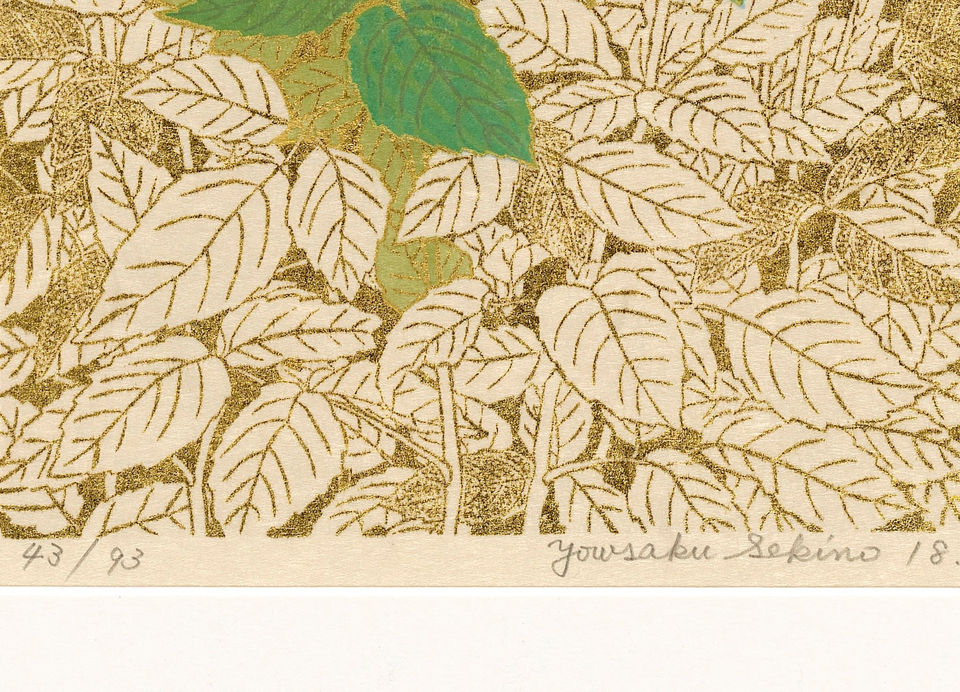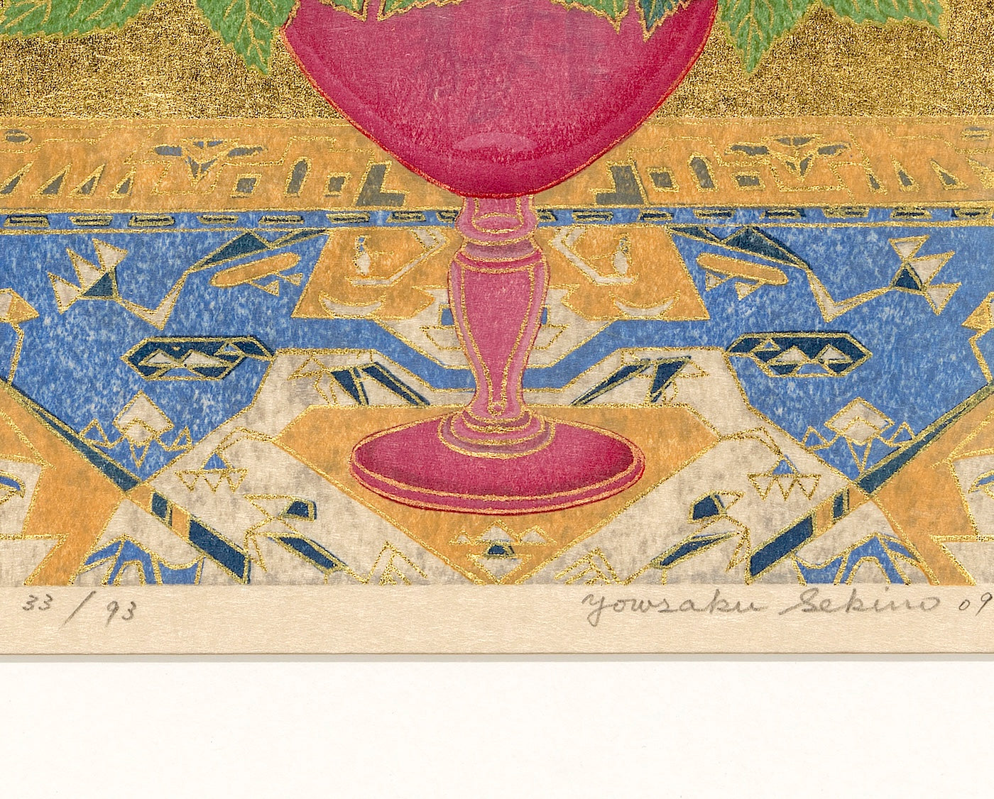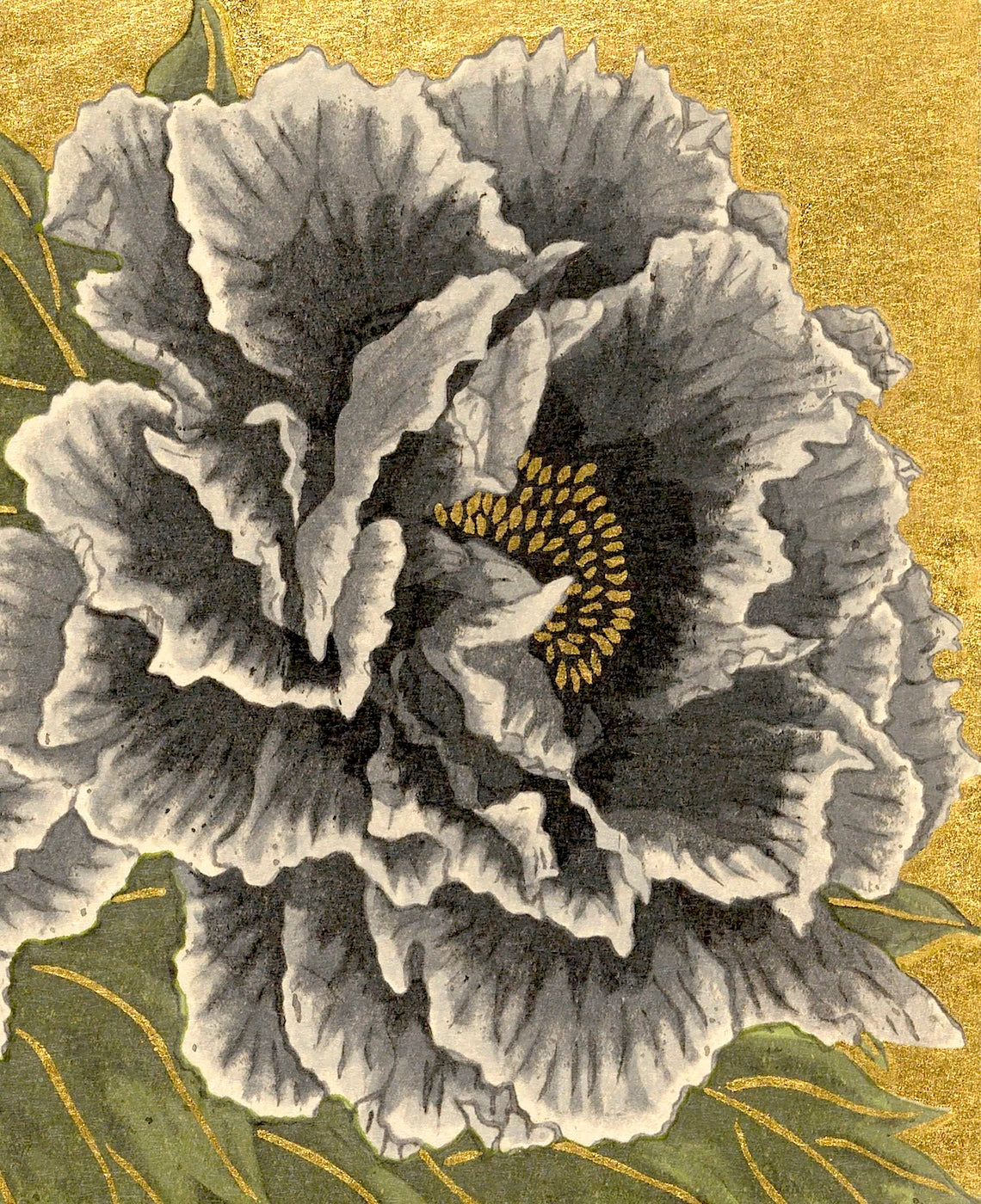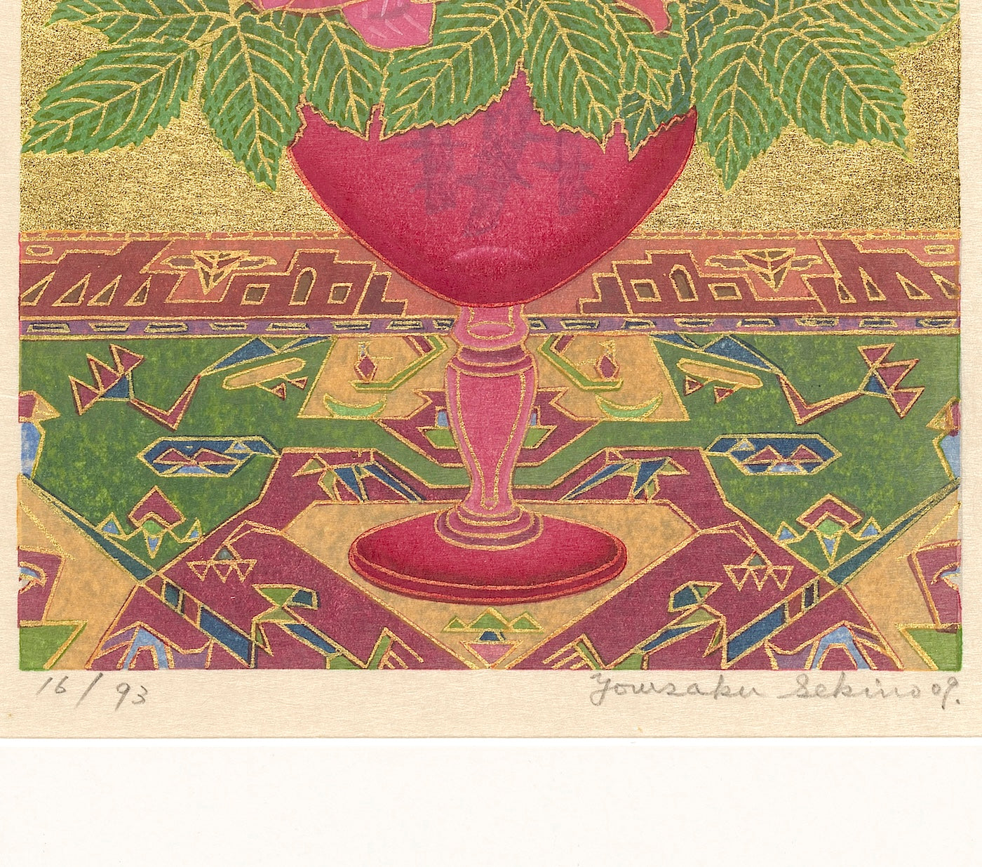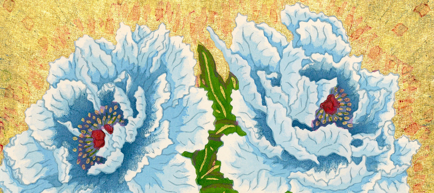 Outlining in gold is the technique uniquely his own. Sekino covers a carved block with oil-based ink to print the outlines and background.