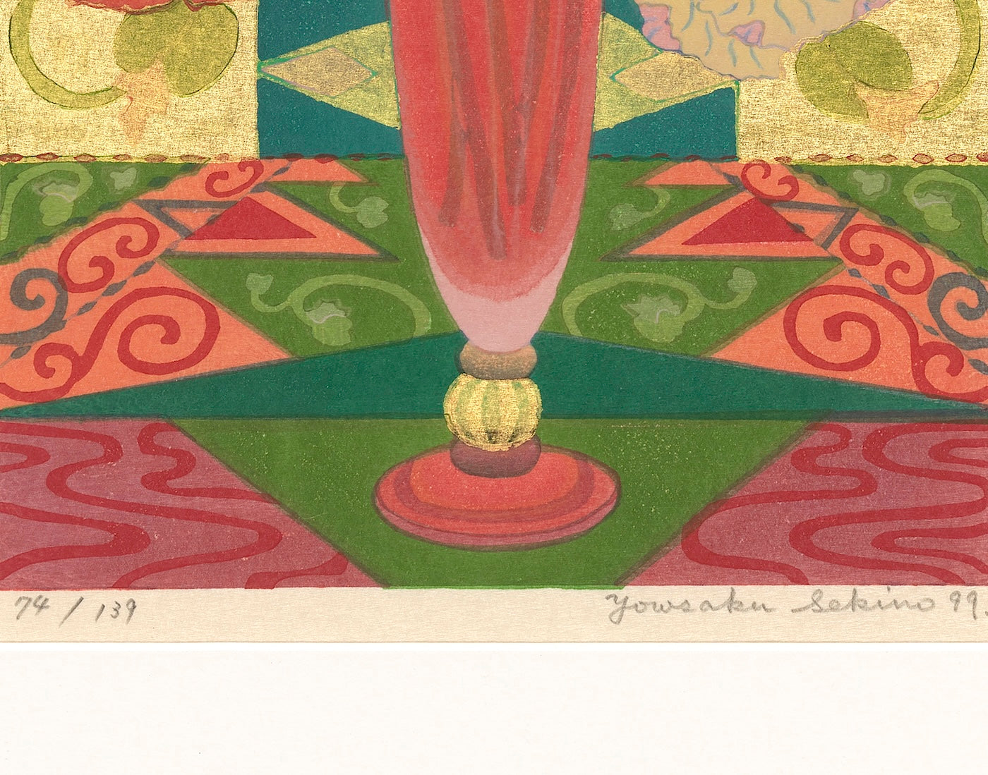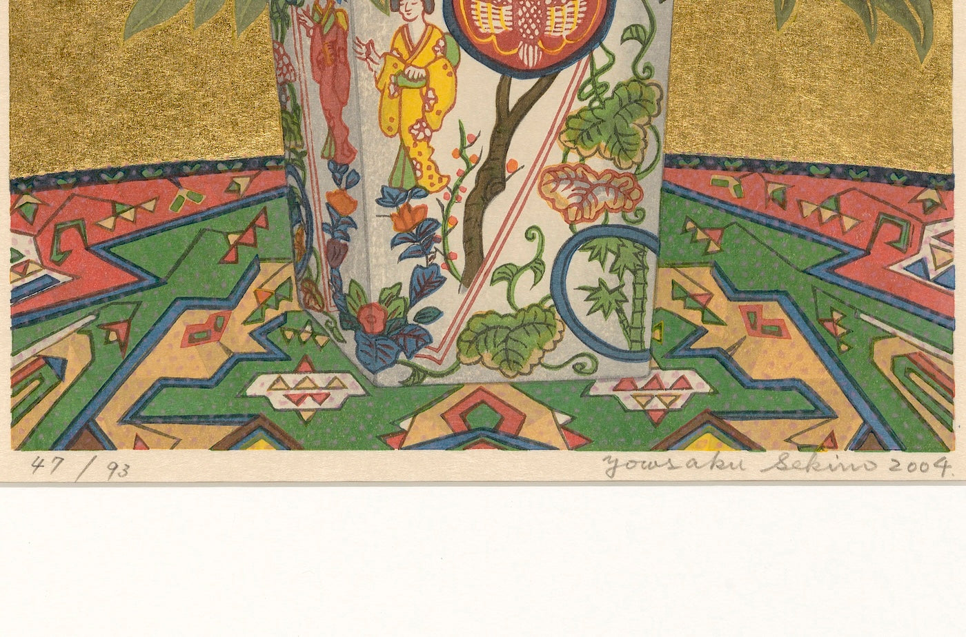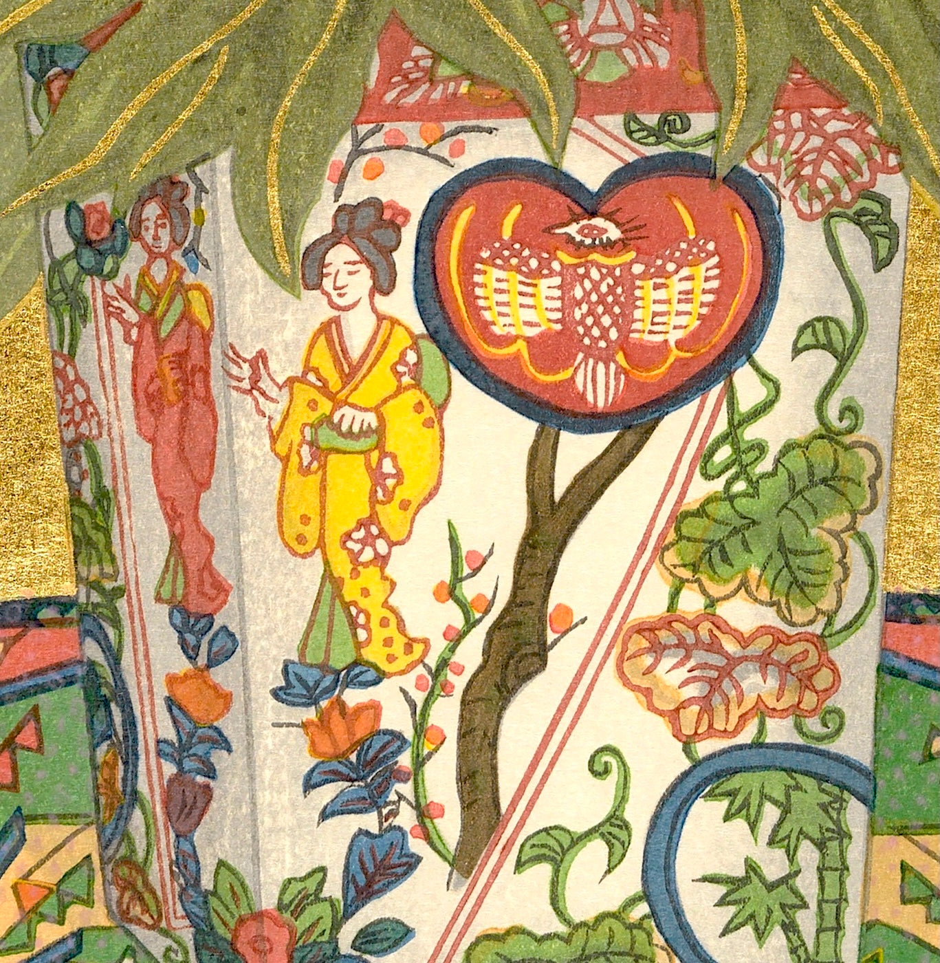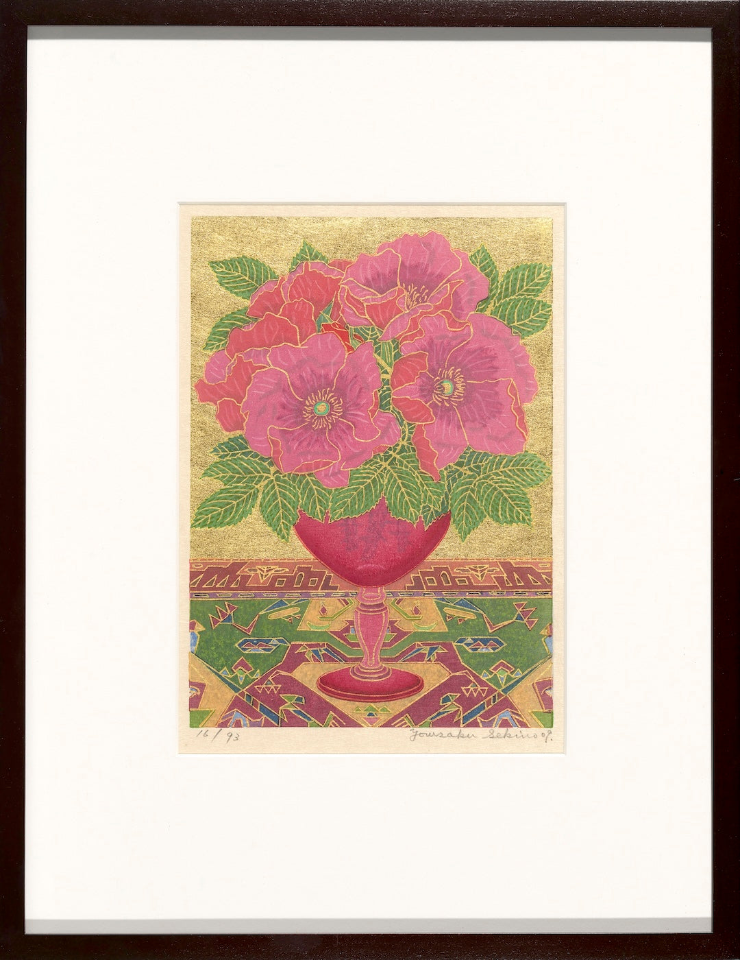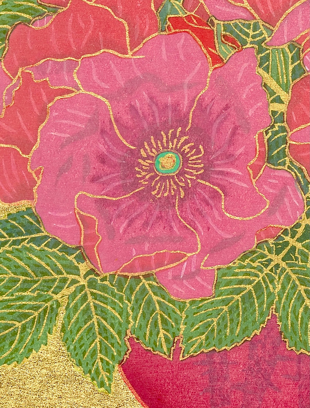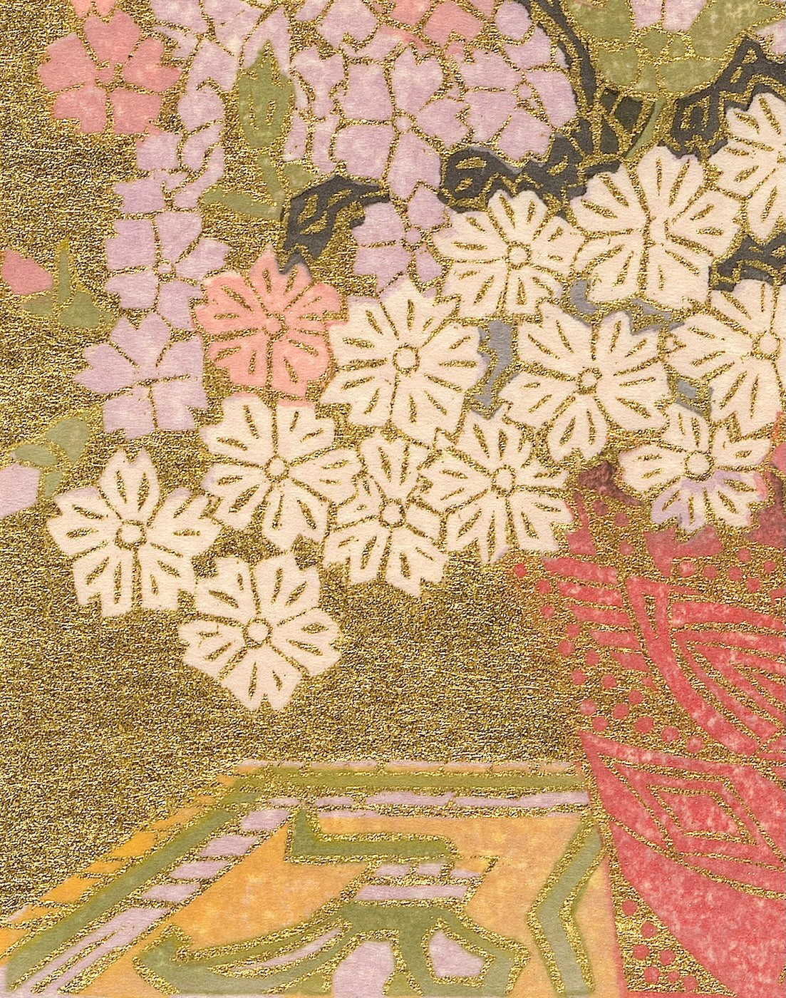 Outlining in gold is the technique uniquely his own. Sekino covers a carved block with oil-based ink to print the outlines and background.