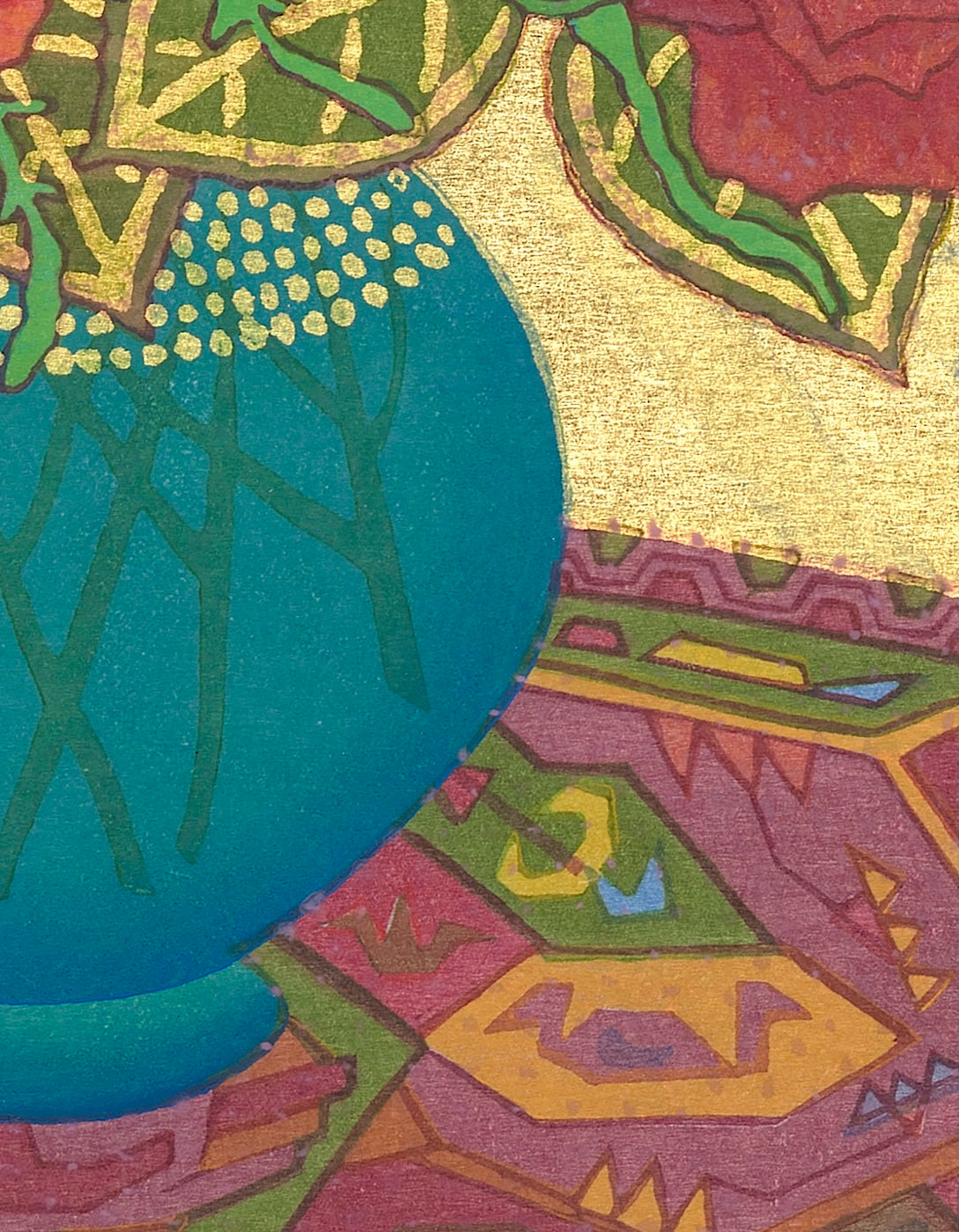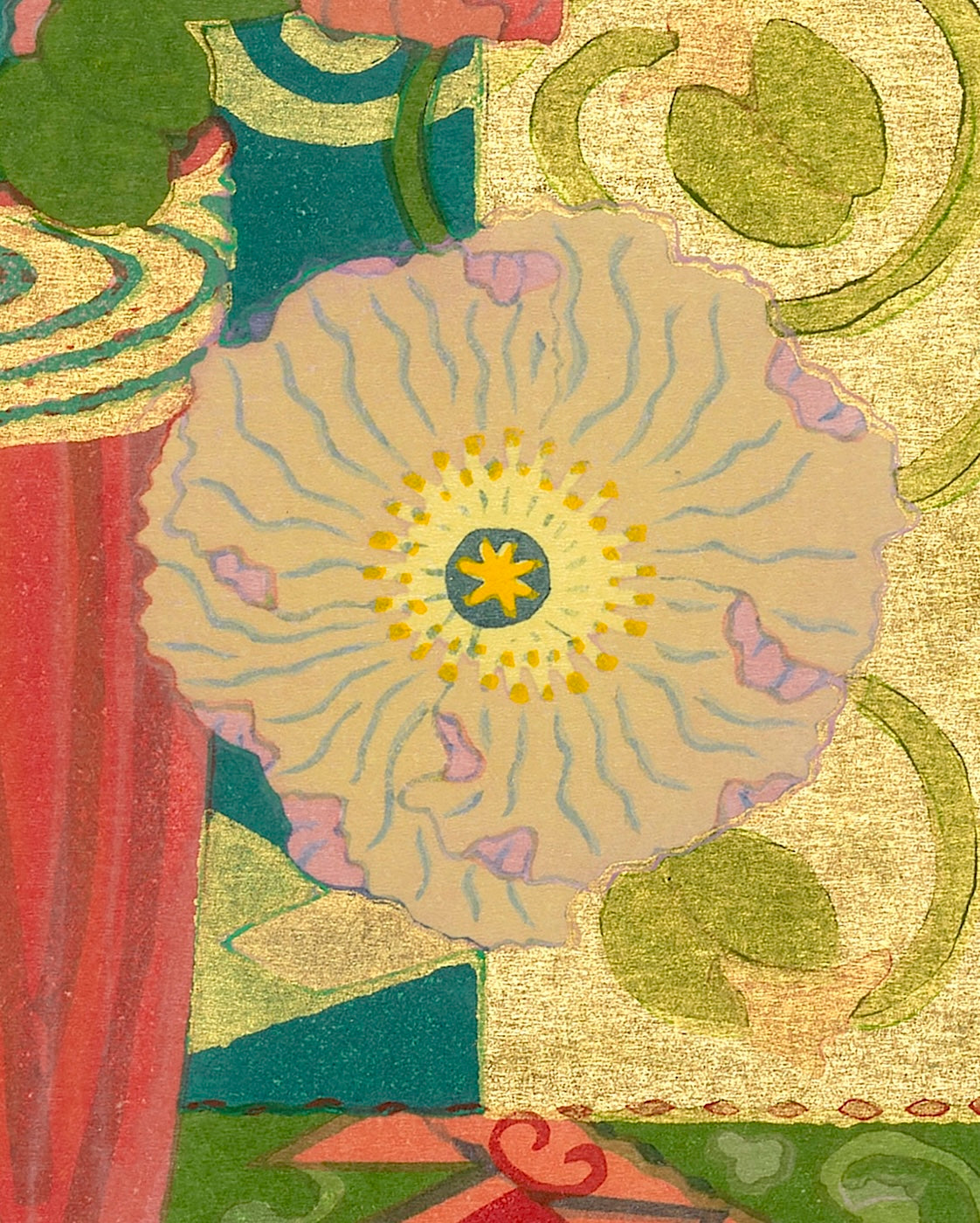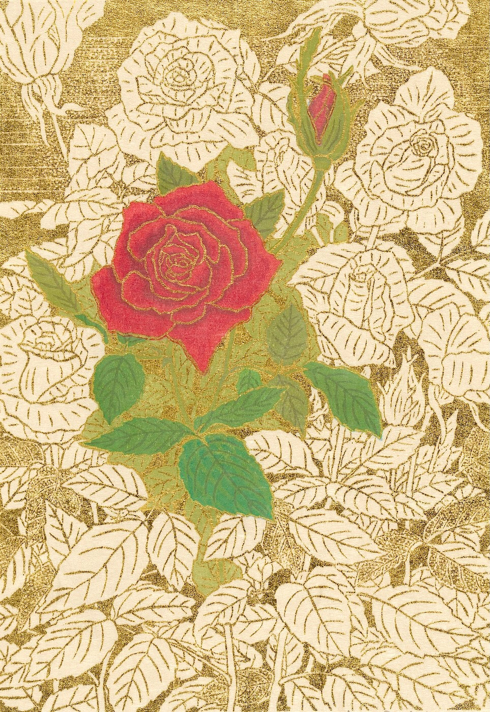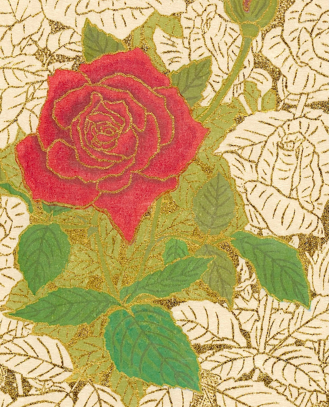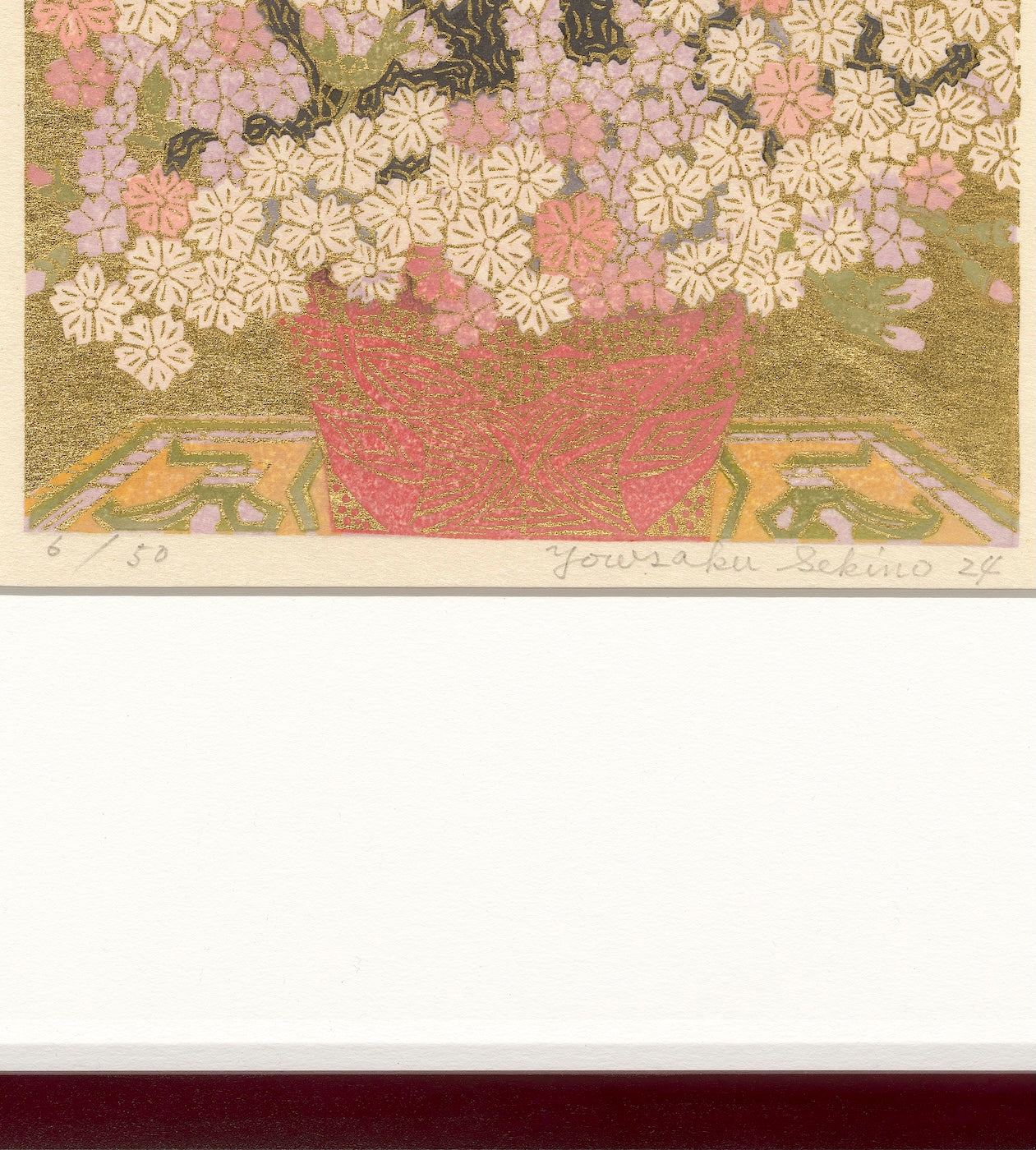 Outlining in gold is the technique uniquely his own. Sekino covers a carved block with oil-based ink to print the outlines and background.