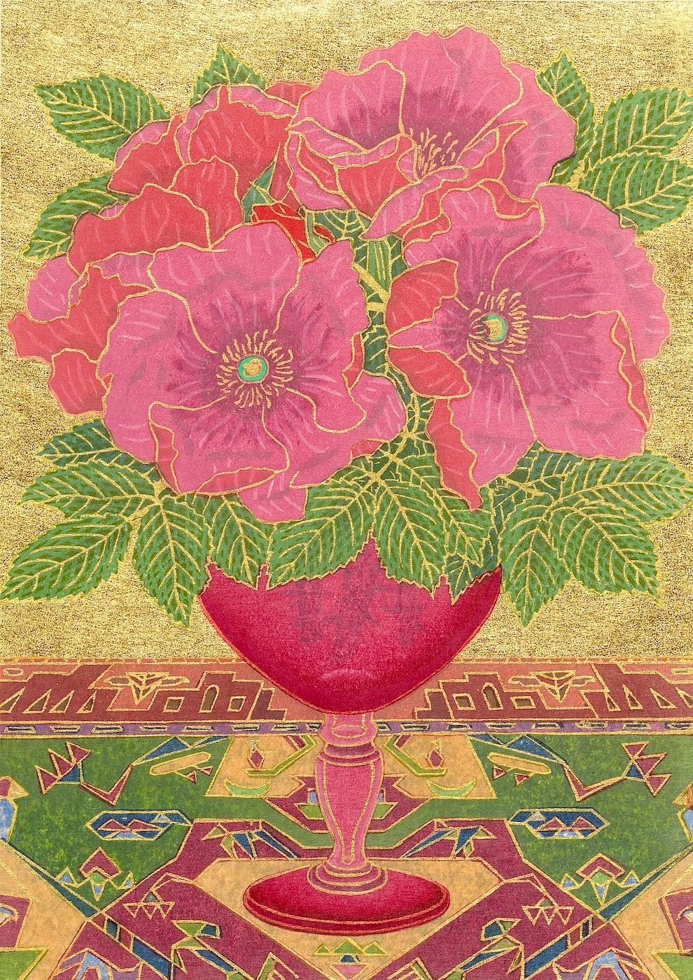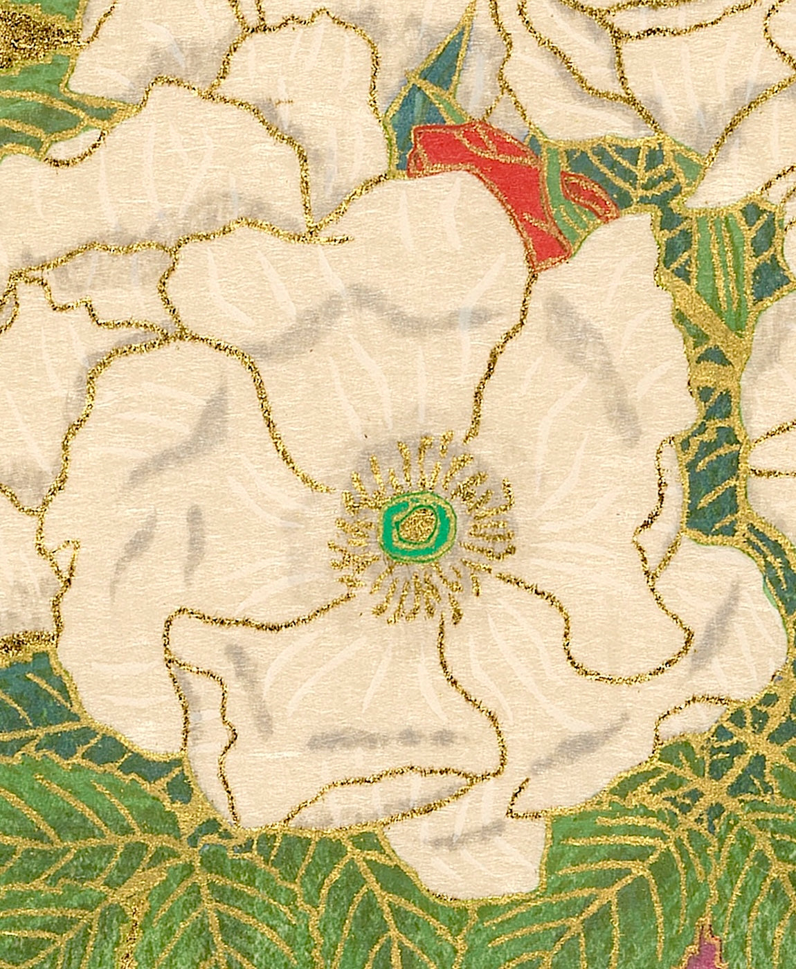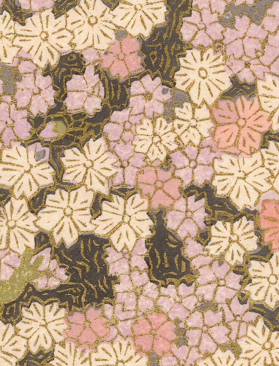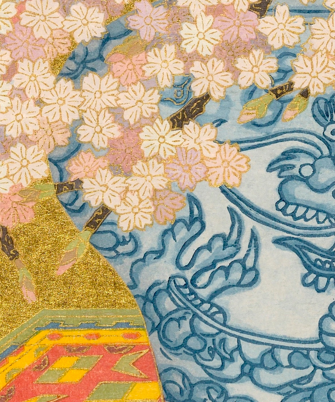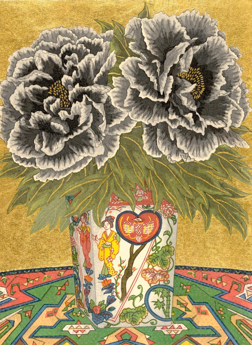 Outlining in gold is the technique uniquely his own. Sekino covers a carved block with oil-based ink to print the outlines and background.
