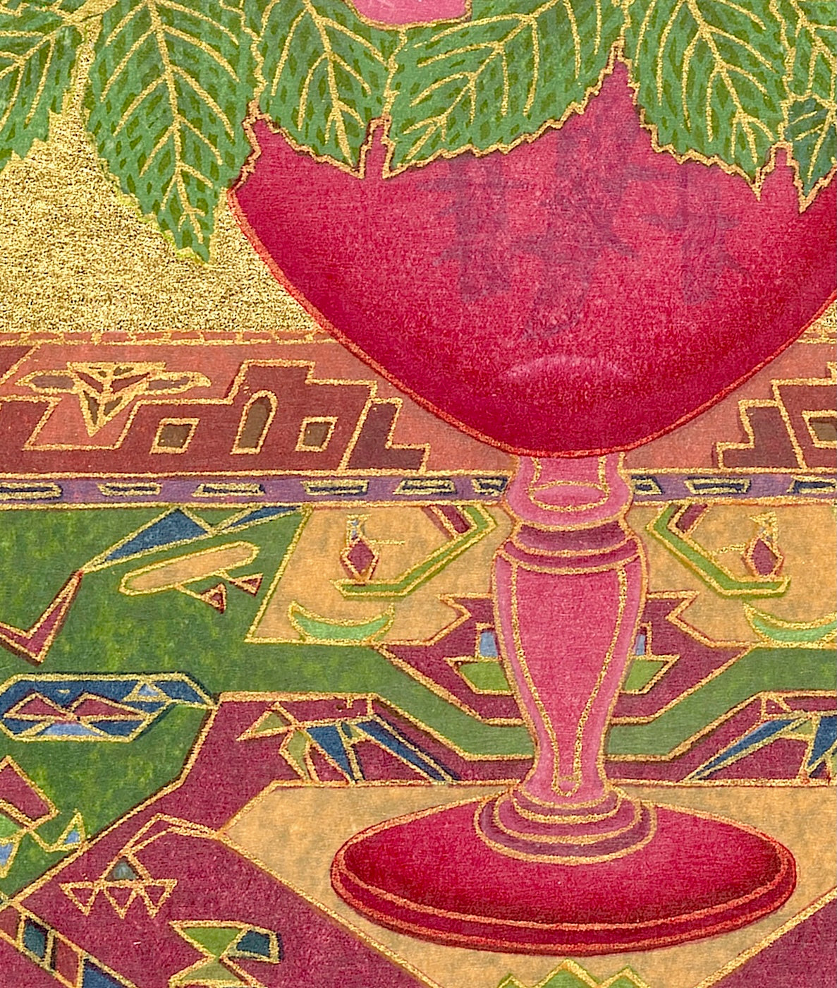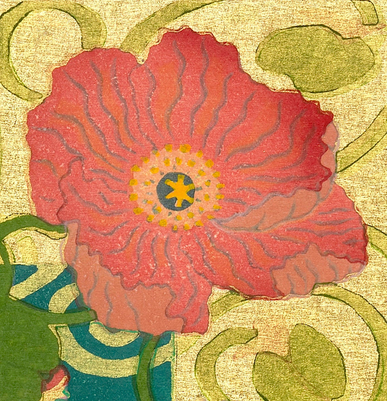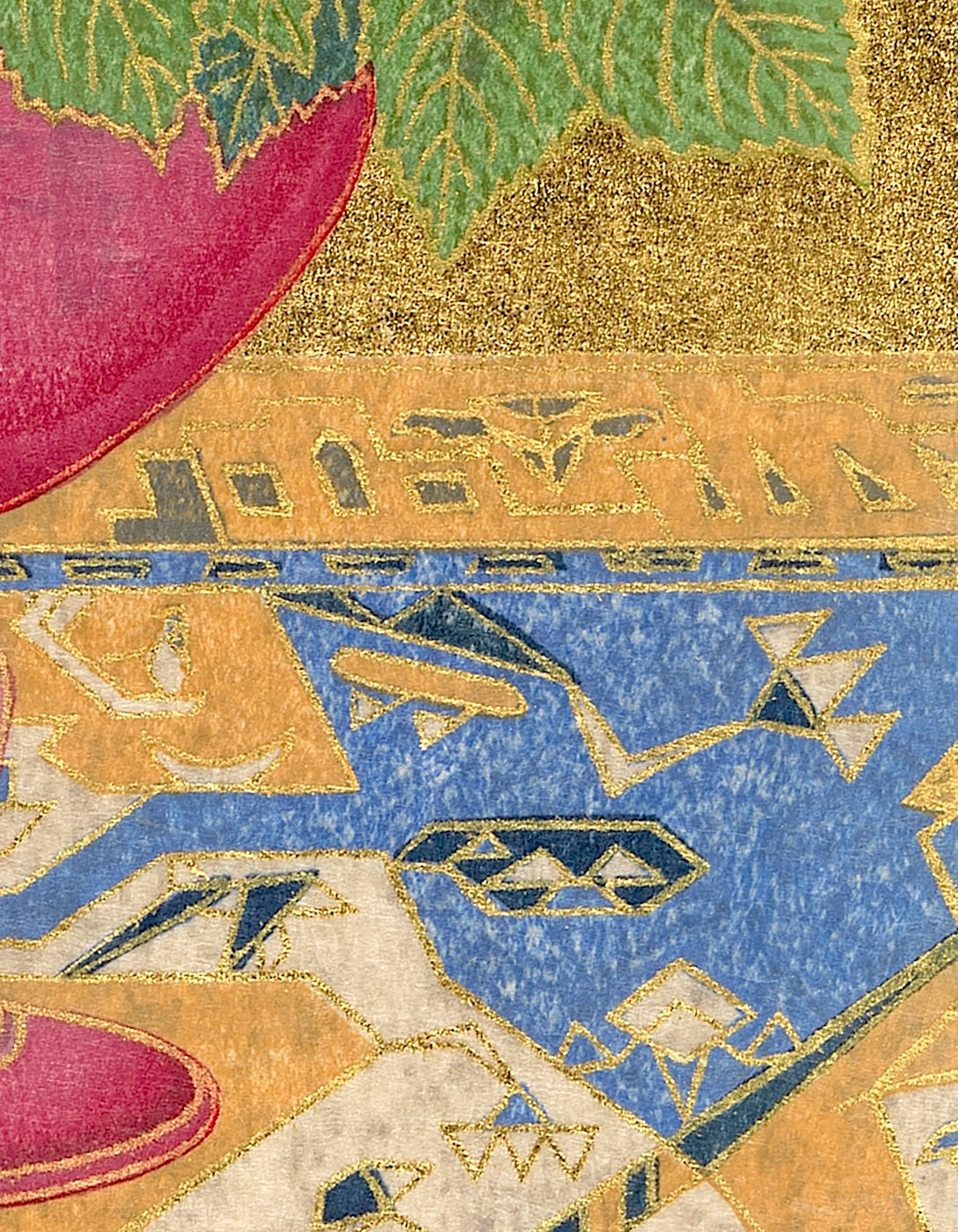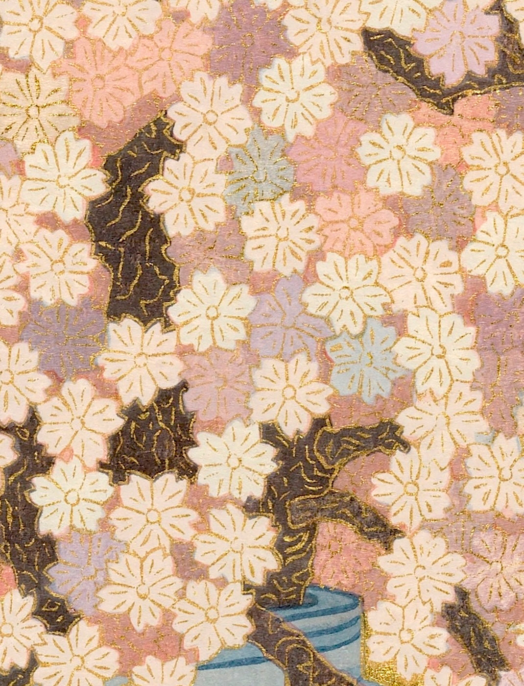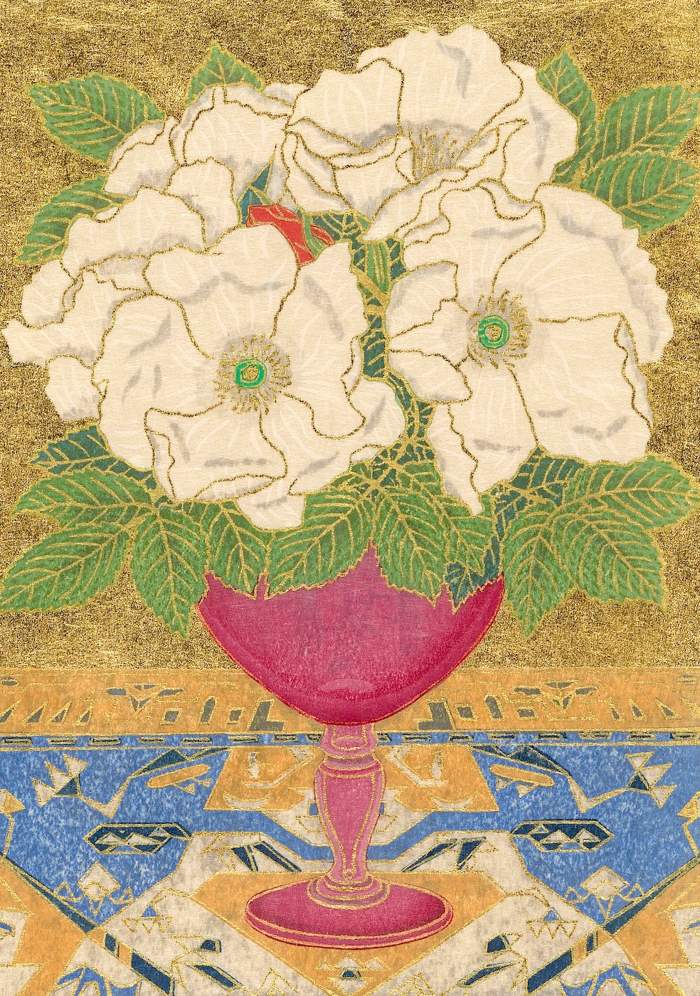 Outlining in gold is the technique uniquely his own. Sekino covers a carved block with oil-based ink to print the outlines and background.