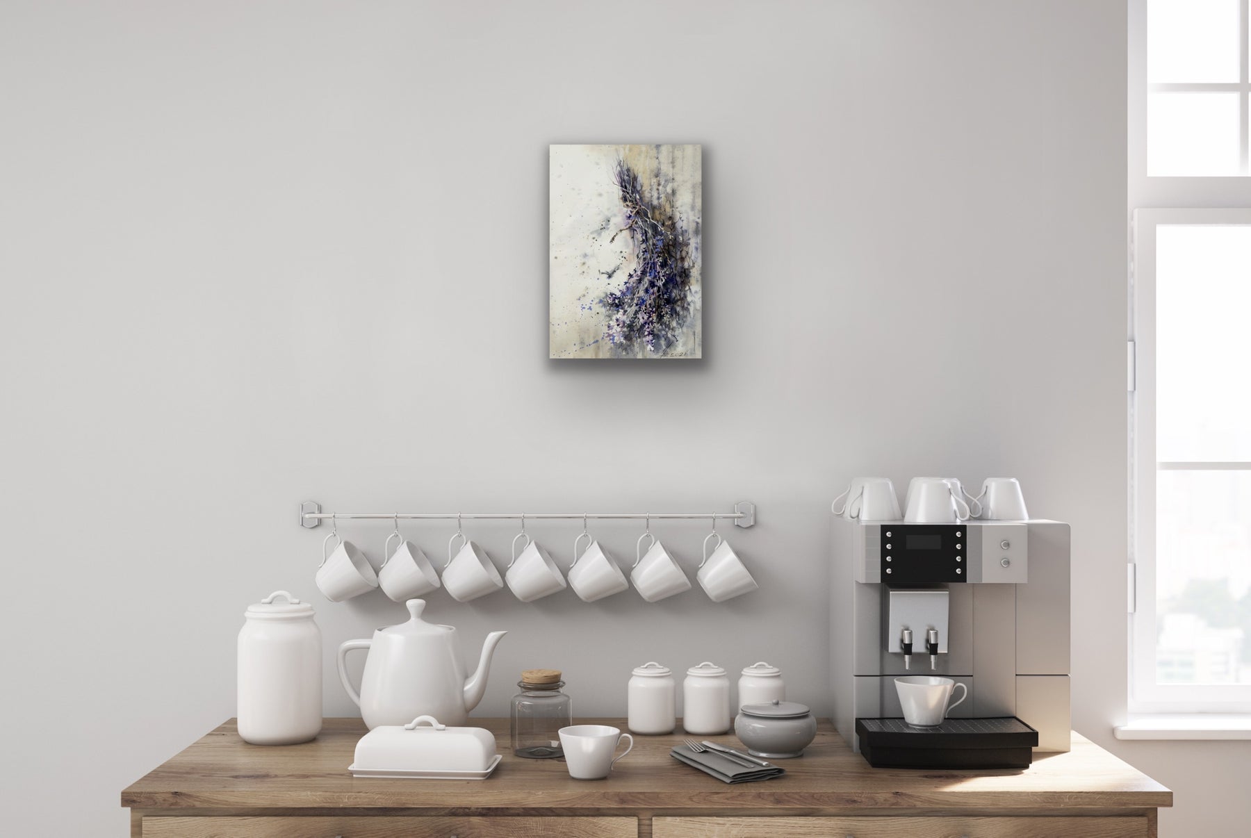 Lavender tales watercolor print displayed in a modern kitchen, showcasing serene floral essence and home decor elegance.