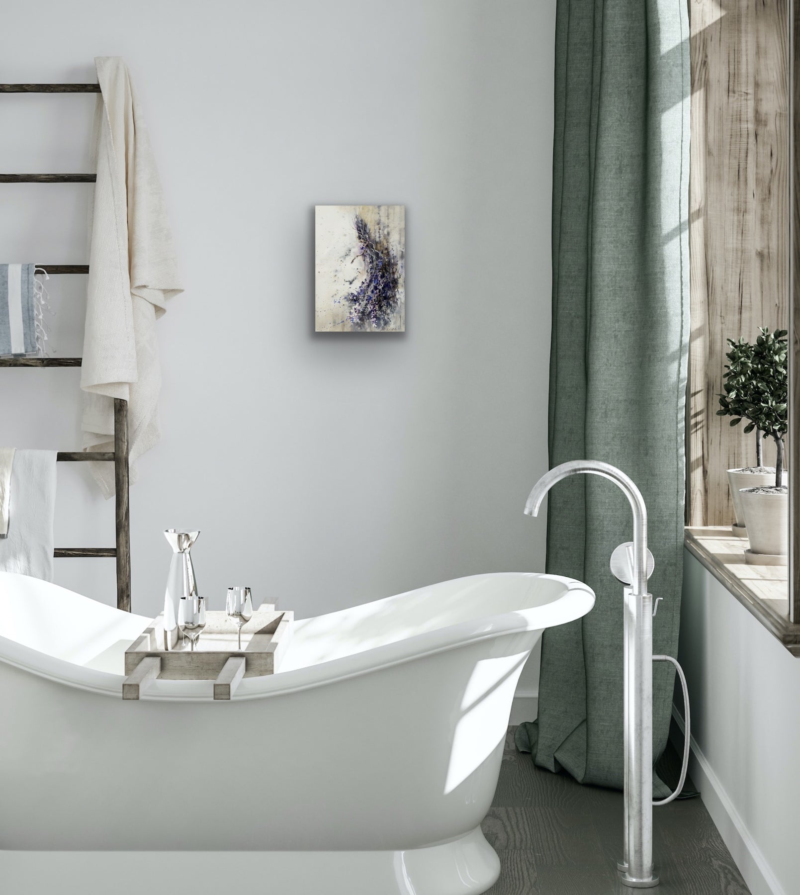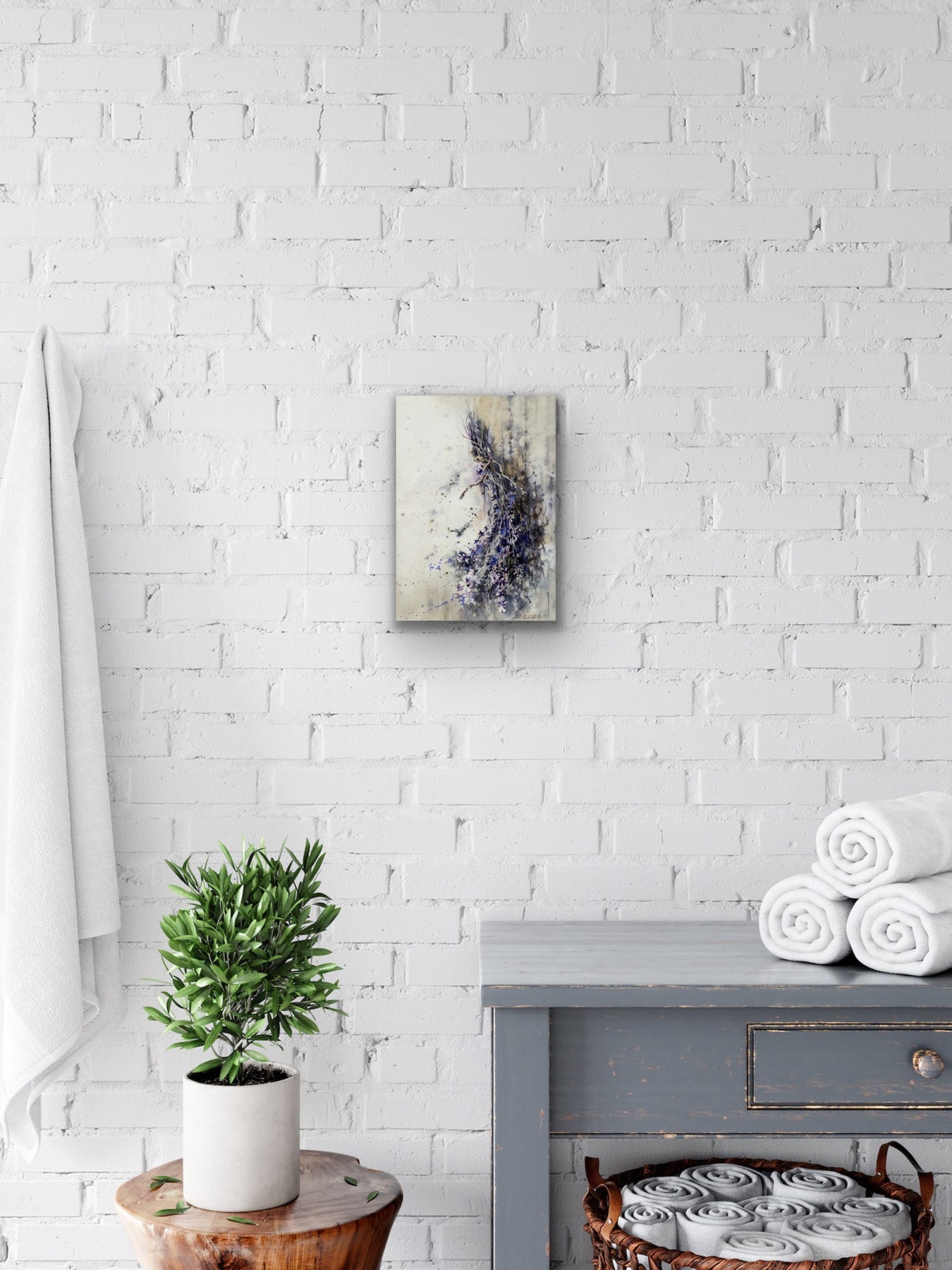 Watercolor print of lavender on wall, showcasing beautiful floral art in a serene bathroom setting.