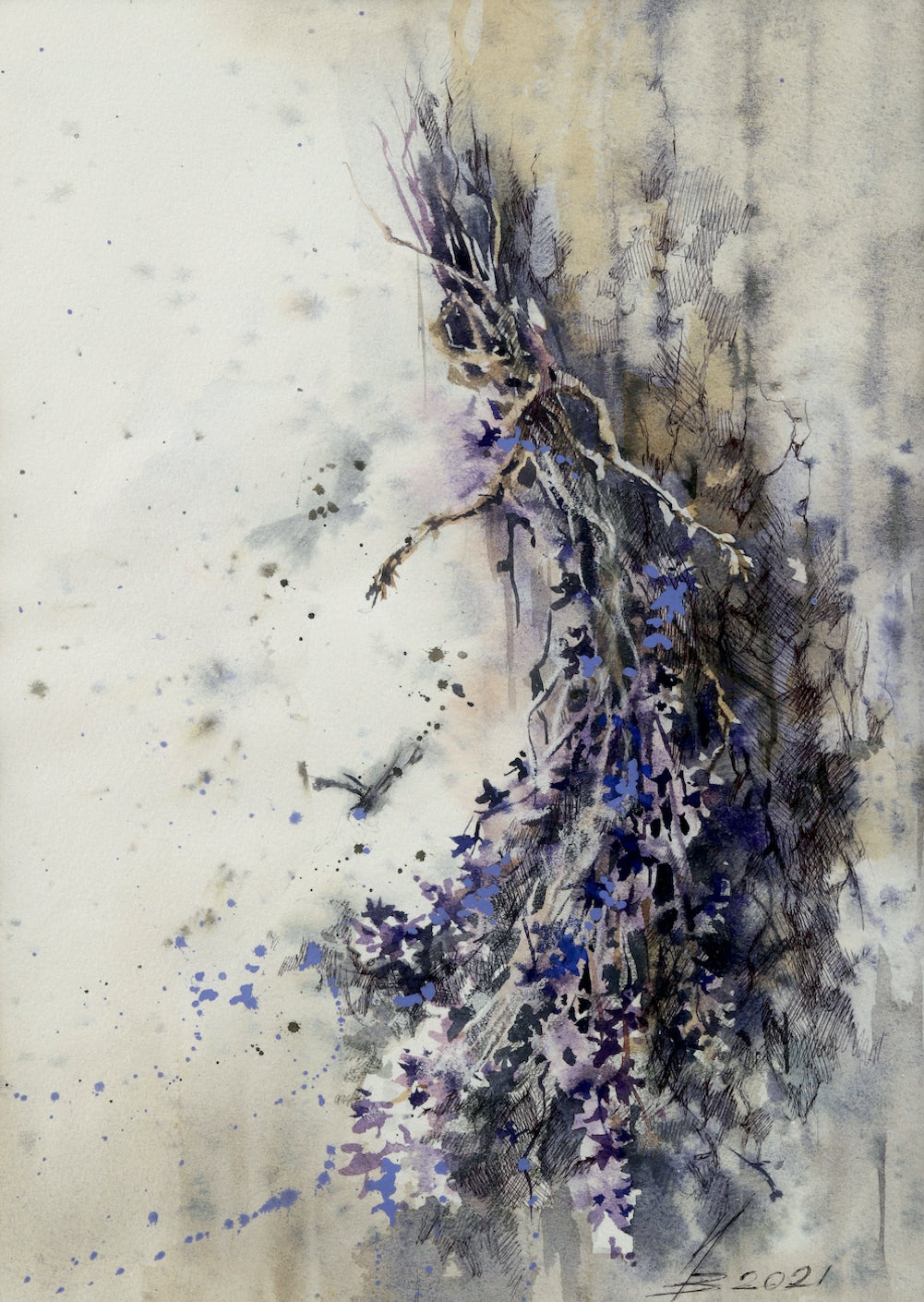 Watercolor artwork titled 'Lavender Tales', showcasing delicate lavender blooms and soft colors.
