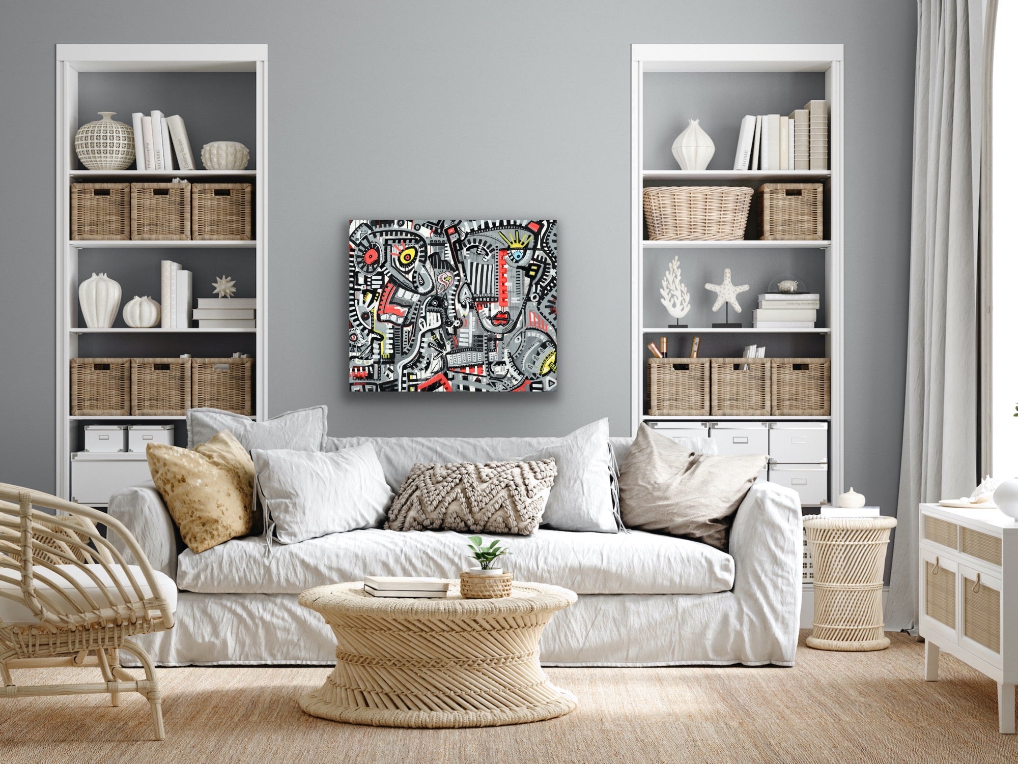 If you email us a photo of your room, we'll photoshop the artwork so you can see how it'd fit in your house. We can also send you a video of an artwork so you can see it from all sides. See our YouTube channel for examples.